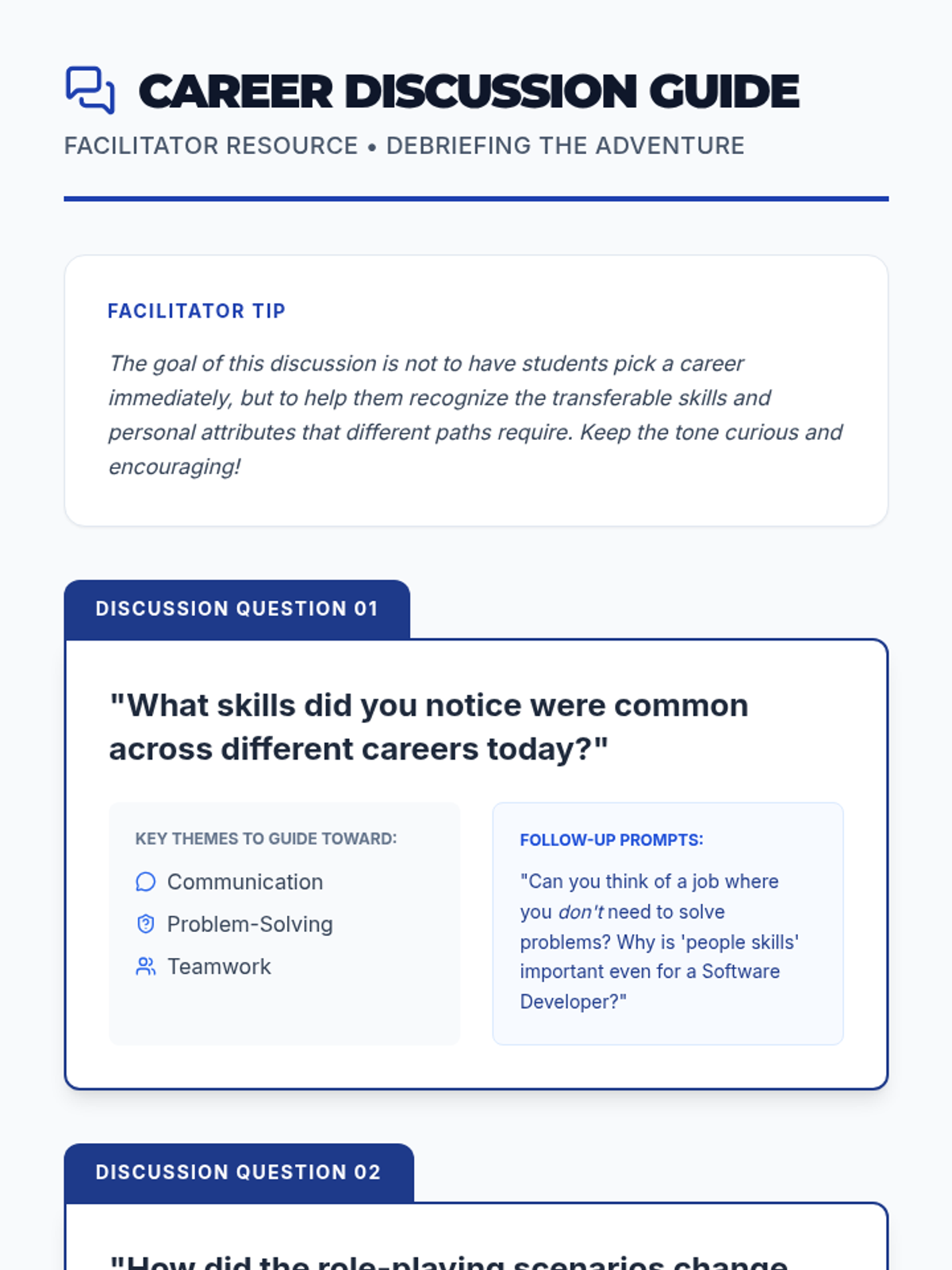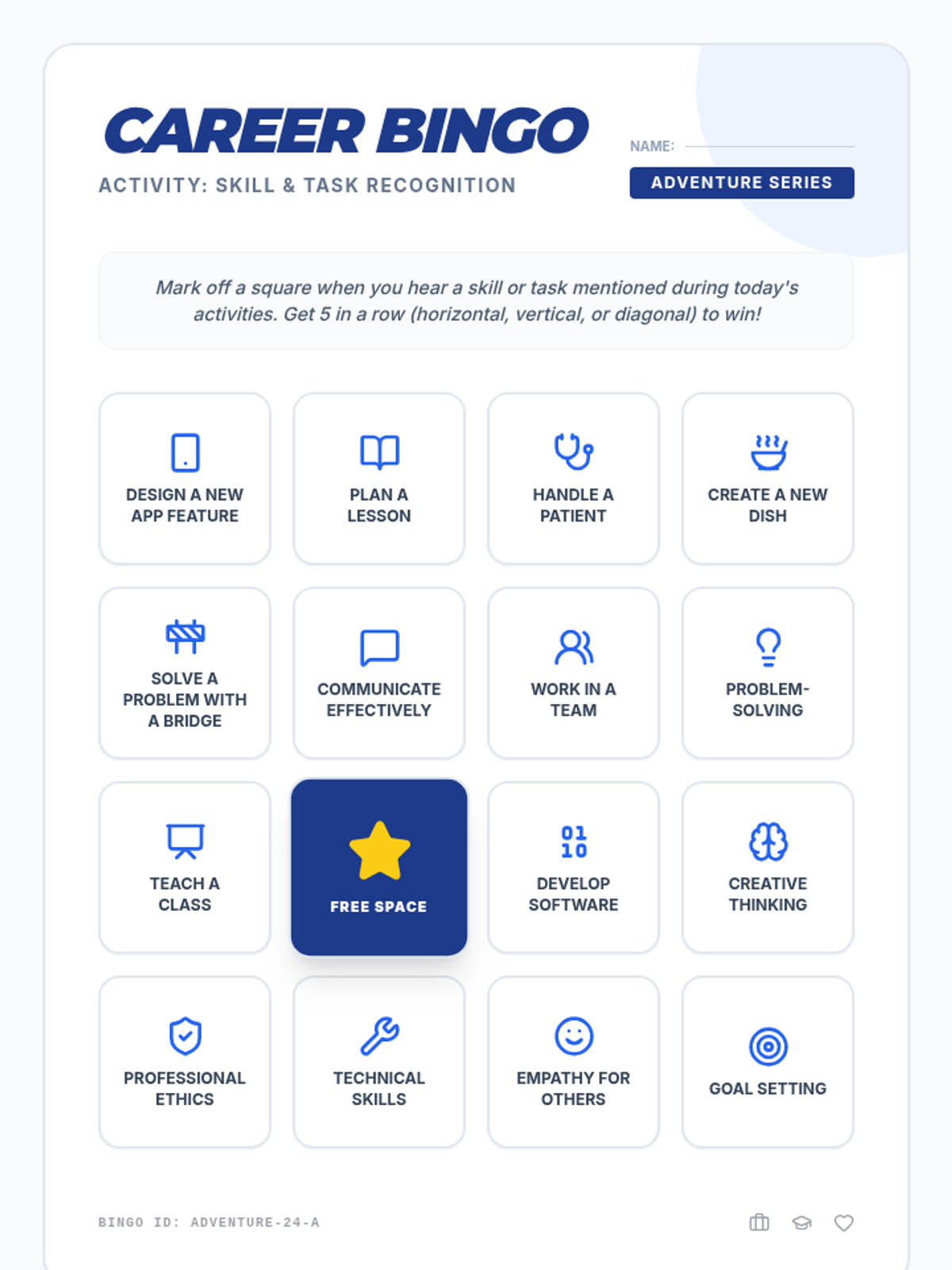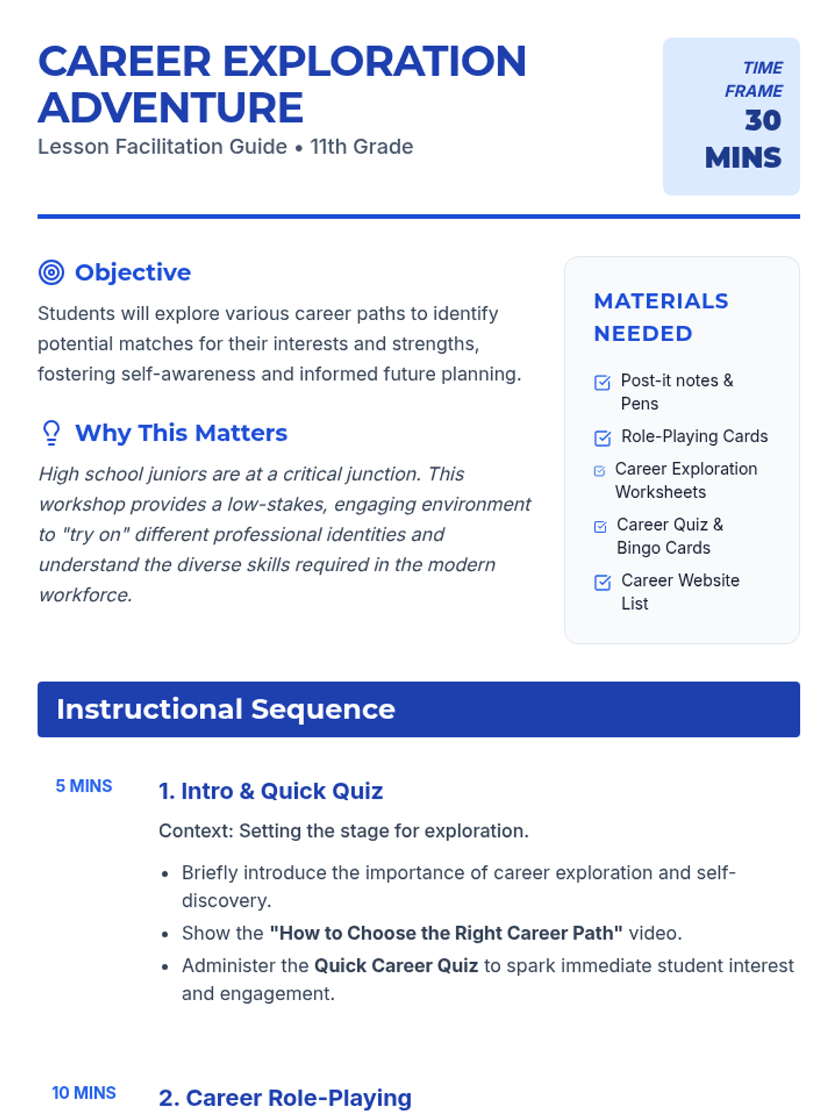 An interactive 30-minute workshop where 11th-grade students explore various career paths through role-playing, a quiz, and bingo, identifying paths that align with their personal strengths.