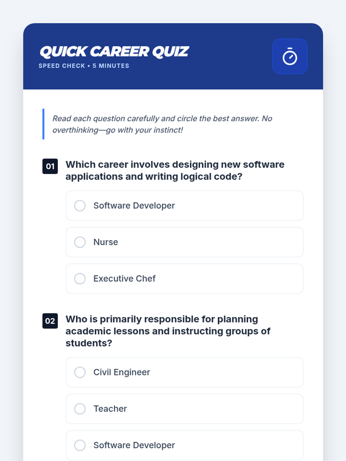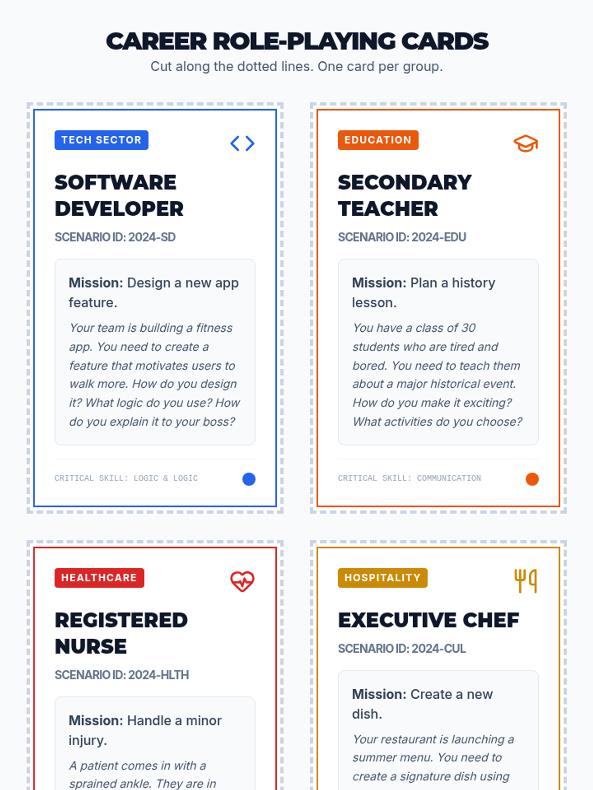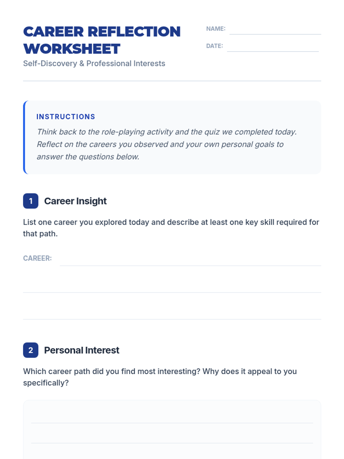 An interactive 30-minute workshop where 11th-grade students explore various career paths through role-playing, a quiz, and bingo, identifying paths that align with their personal strengths.