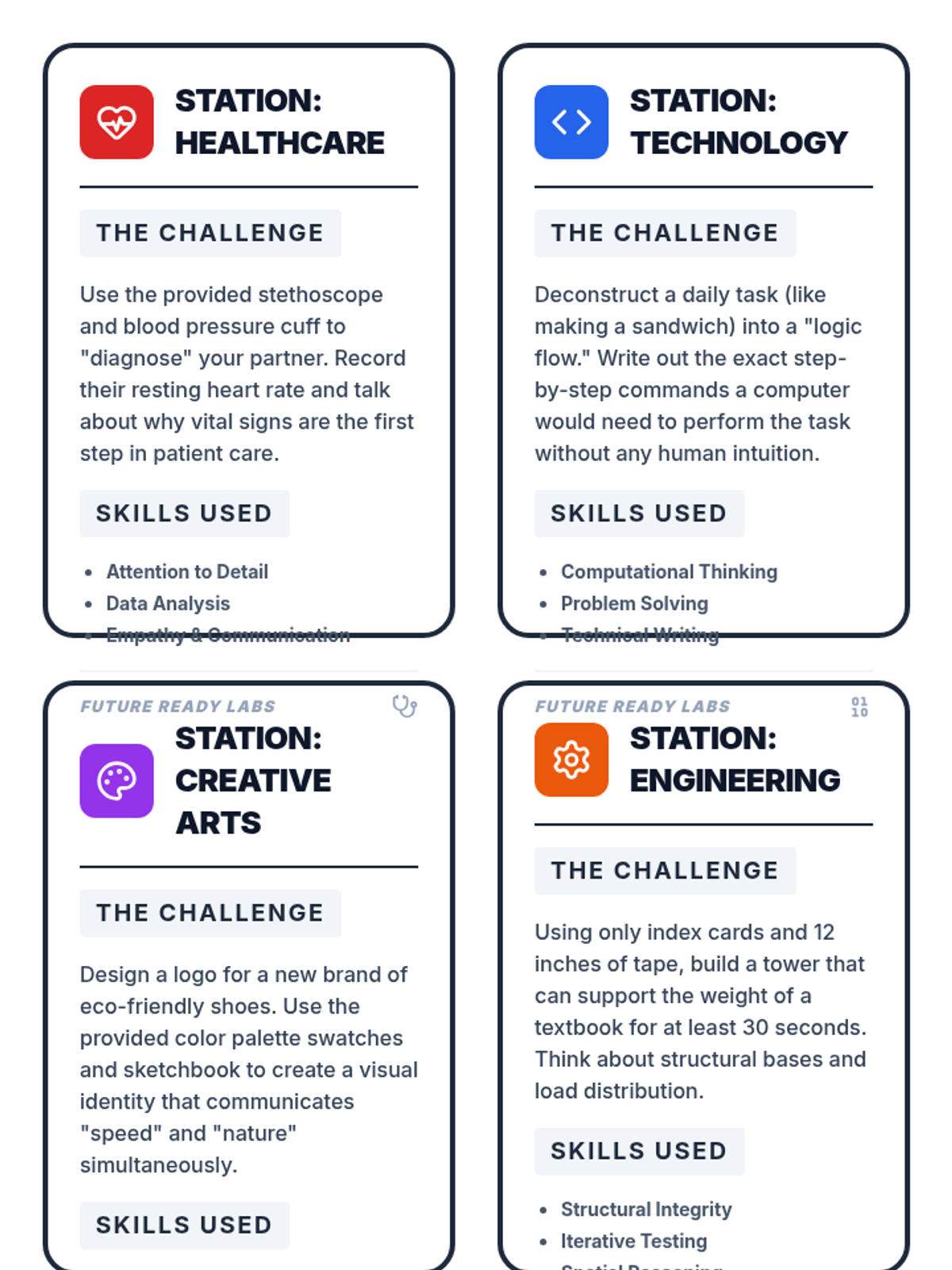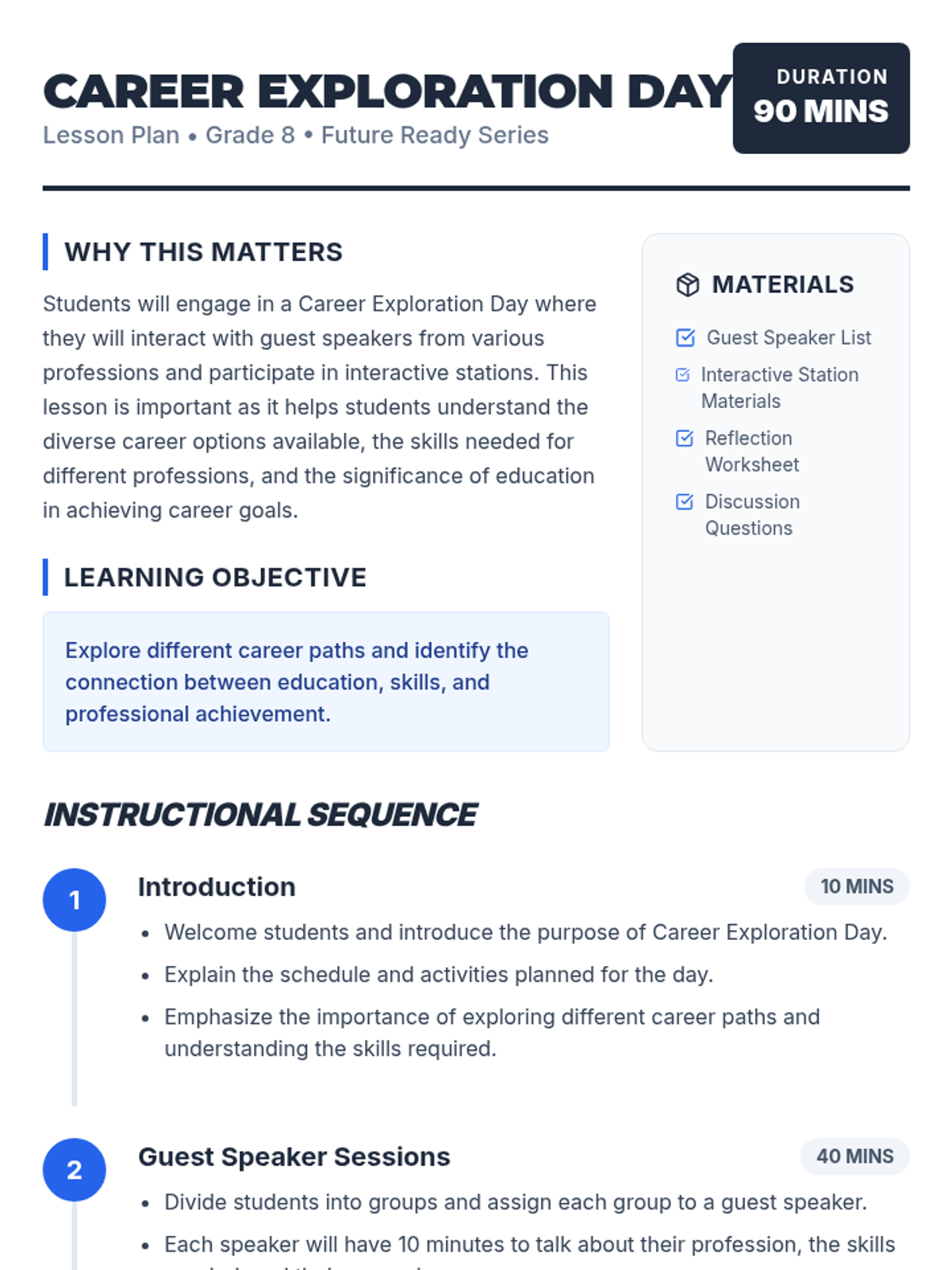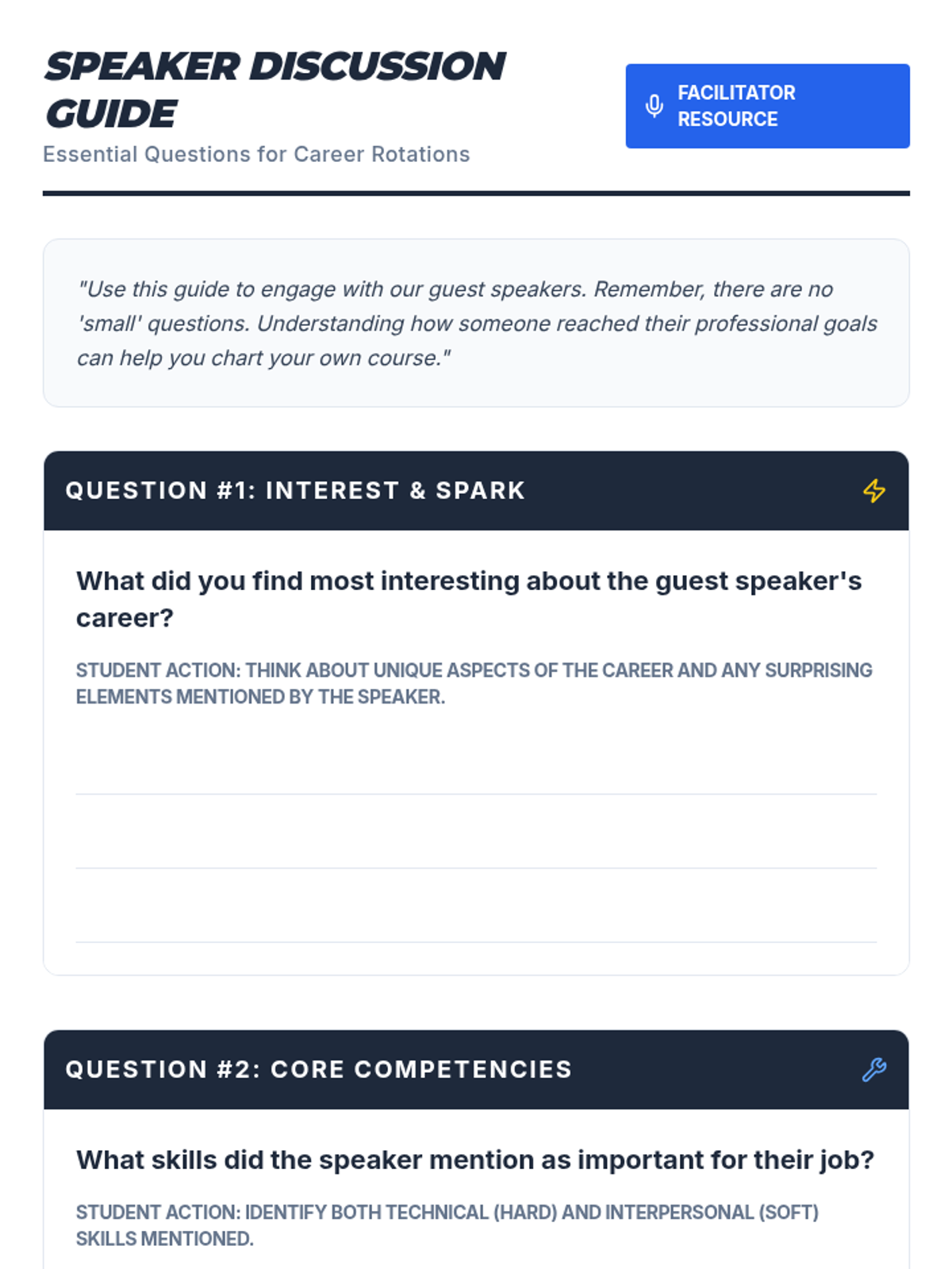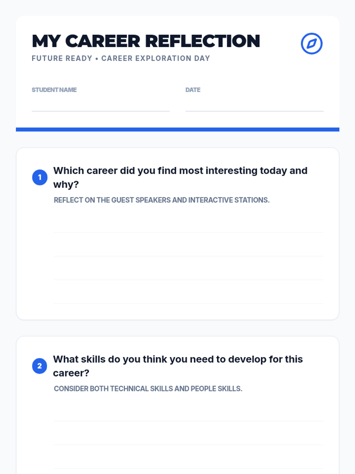 Students engage with guest speakers and interactive stations to explore diverse career paths, identify necessary skills, and understand the role of education in achieving professional goals.