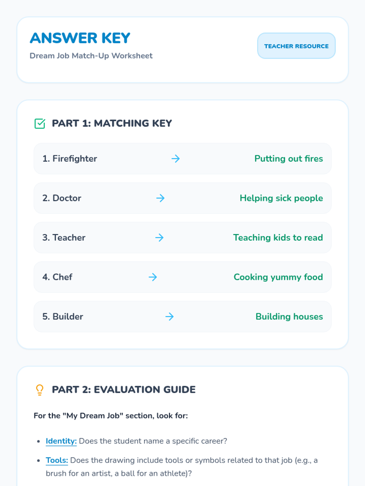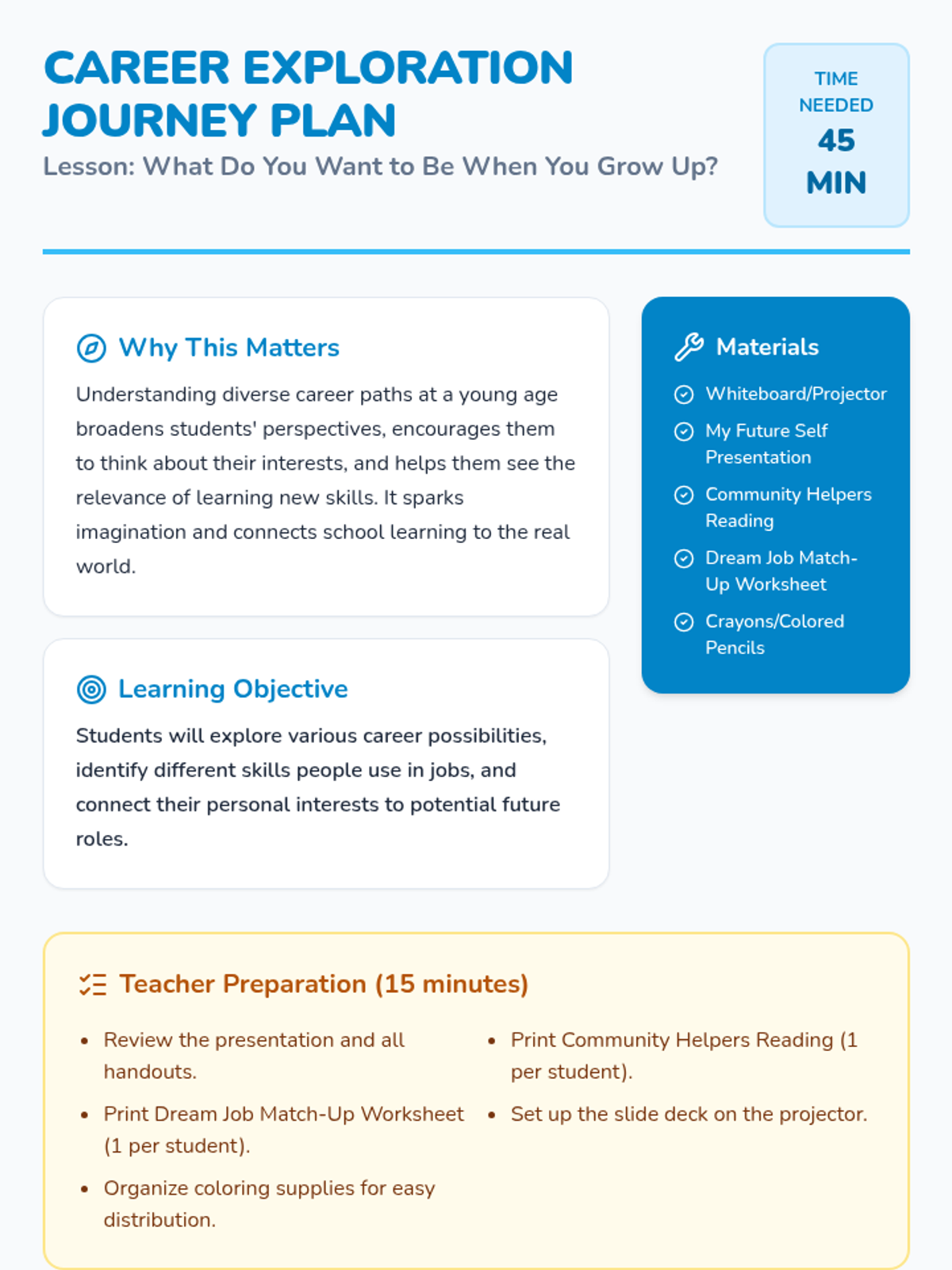 An introductory career exploration lesson for elementary students, focusing on community helpers, job-specific skills, and personal interests.