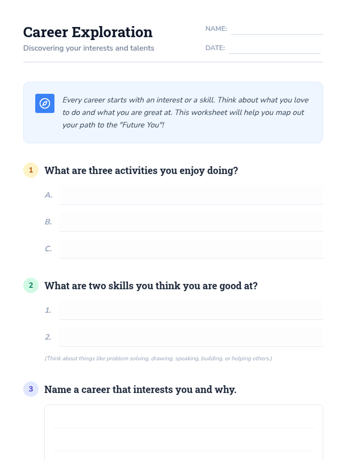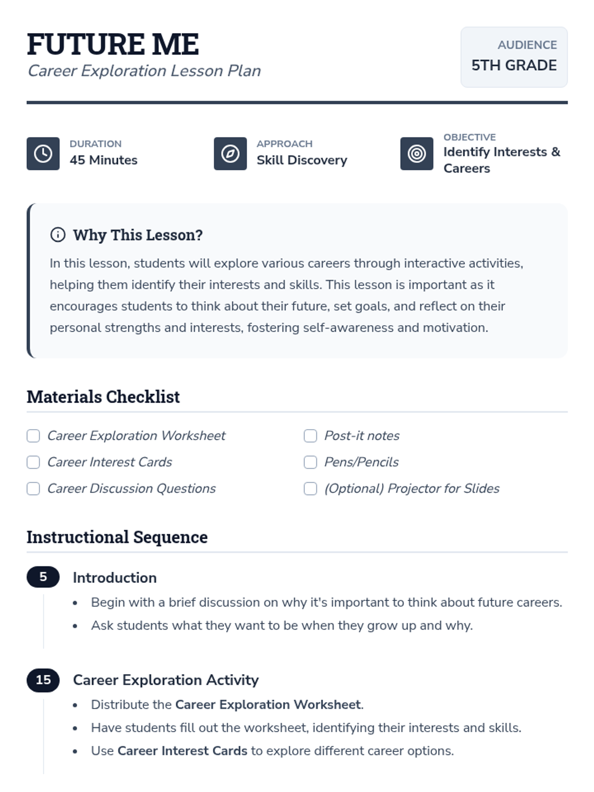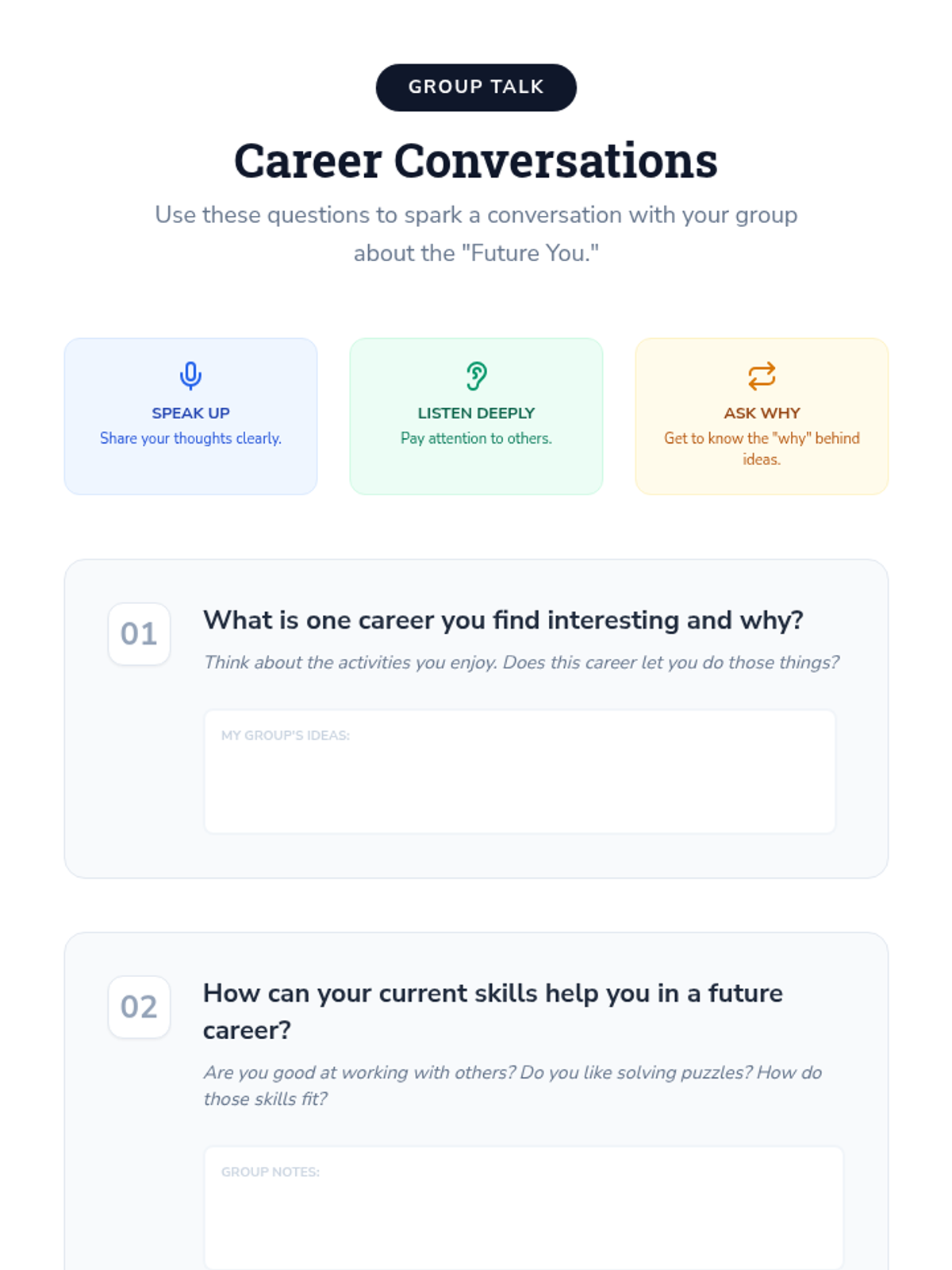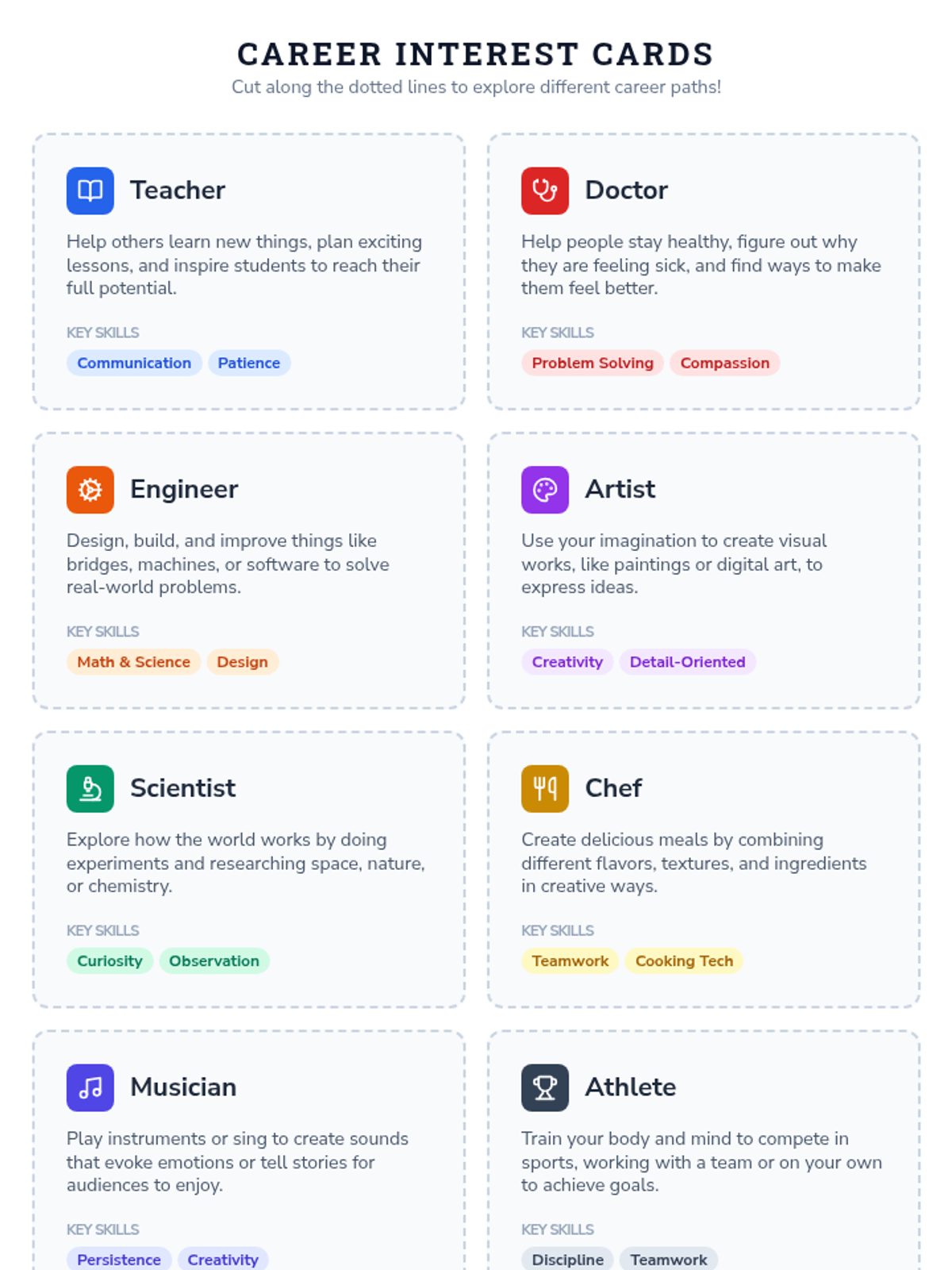 Students will explore various careers through interactive activities, helping them identify their interests and skills while setting future-oriented goals.