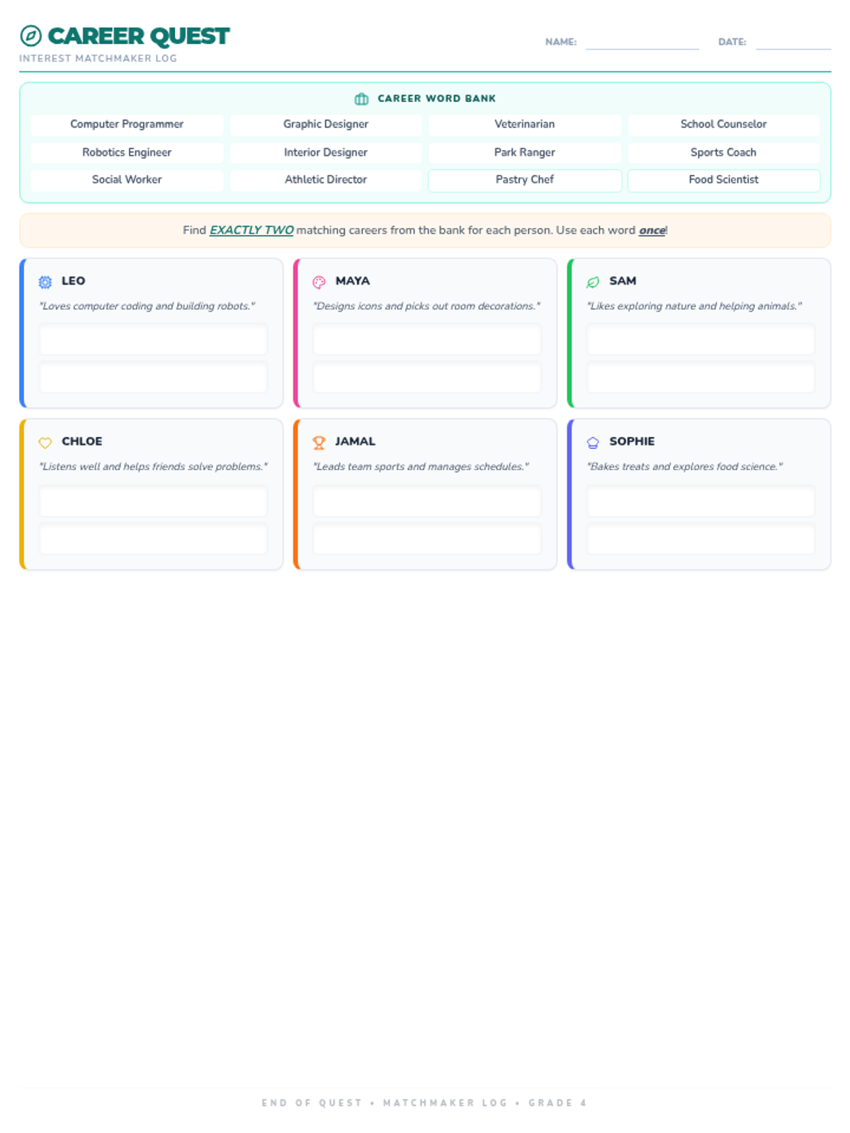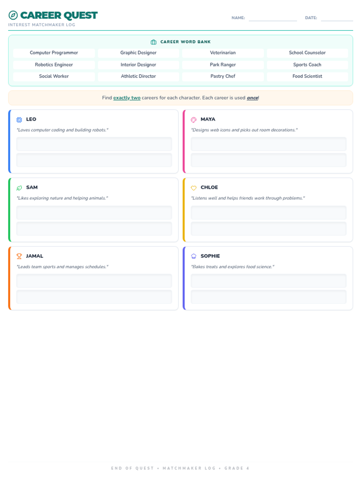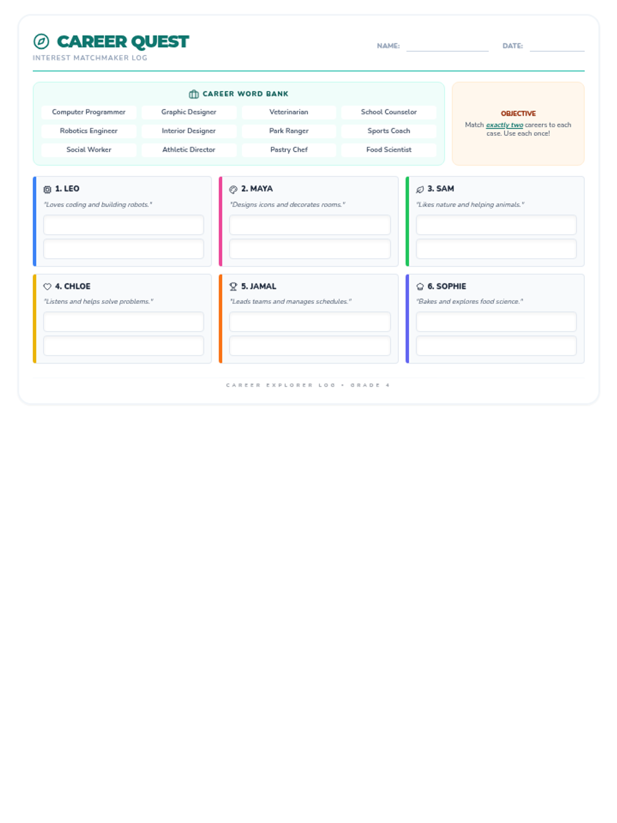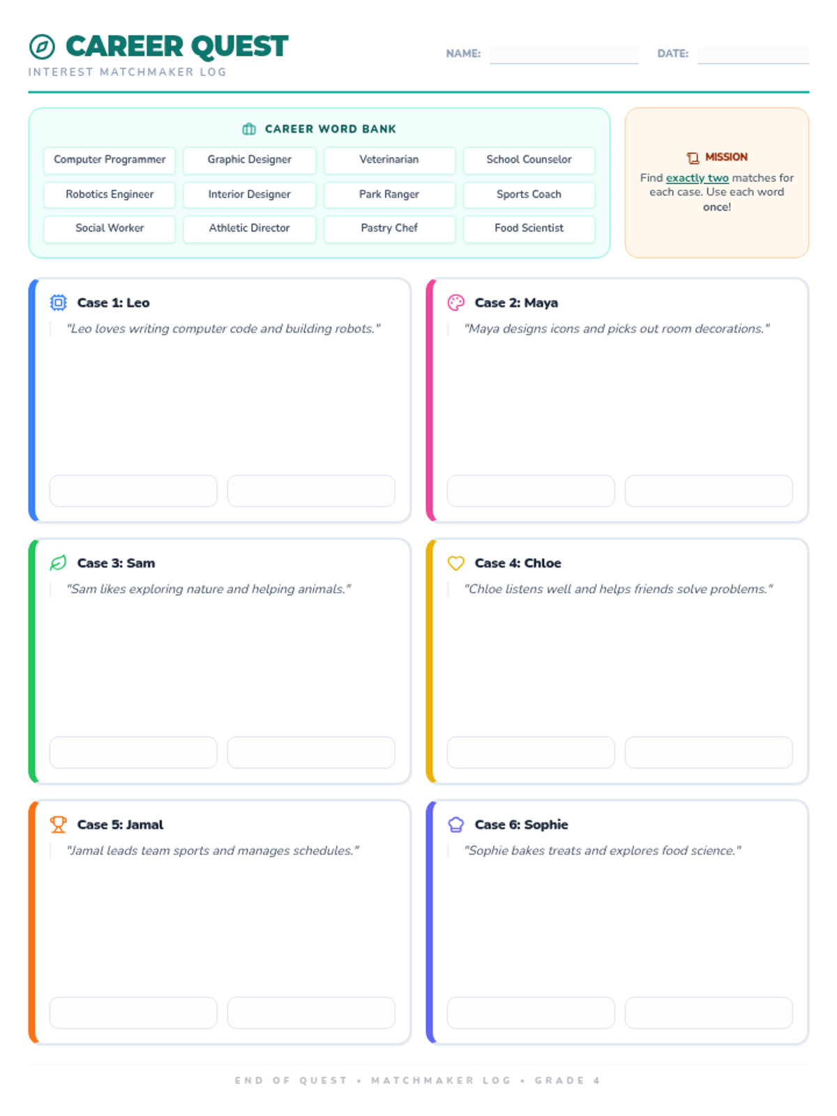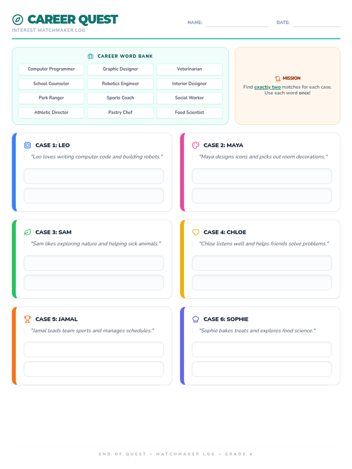 A career exploration lesson for 4th graders focused on connecting personal interests, hobbies, and strengths to potential future career paths through scenarios and reflection.