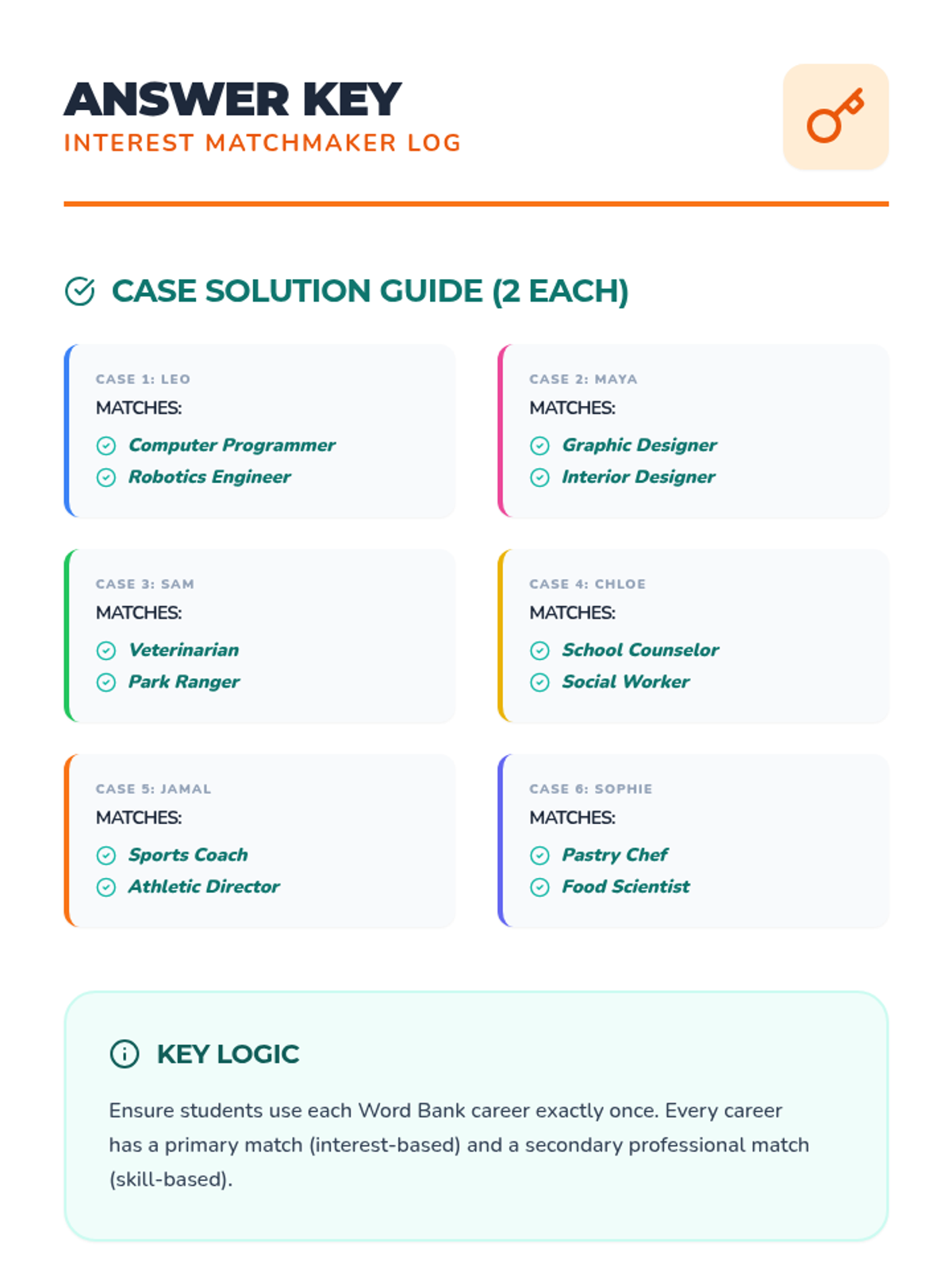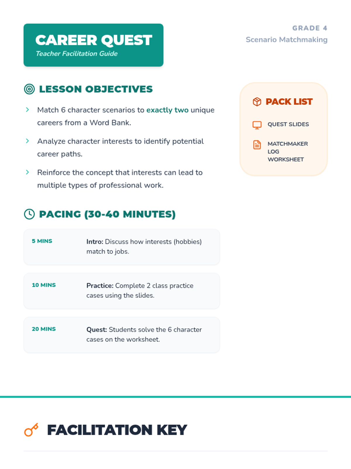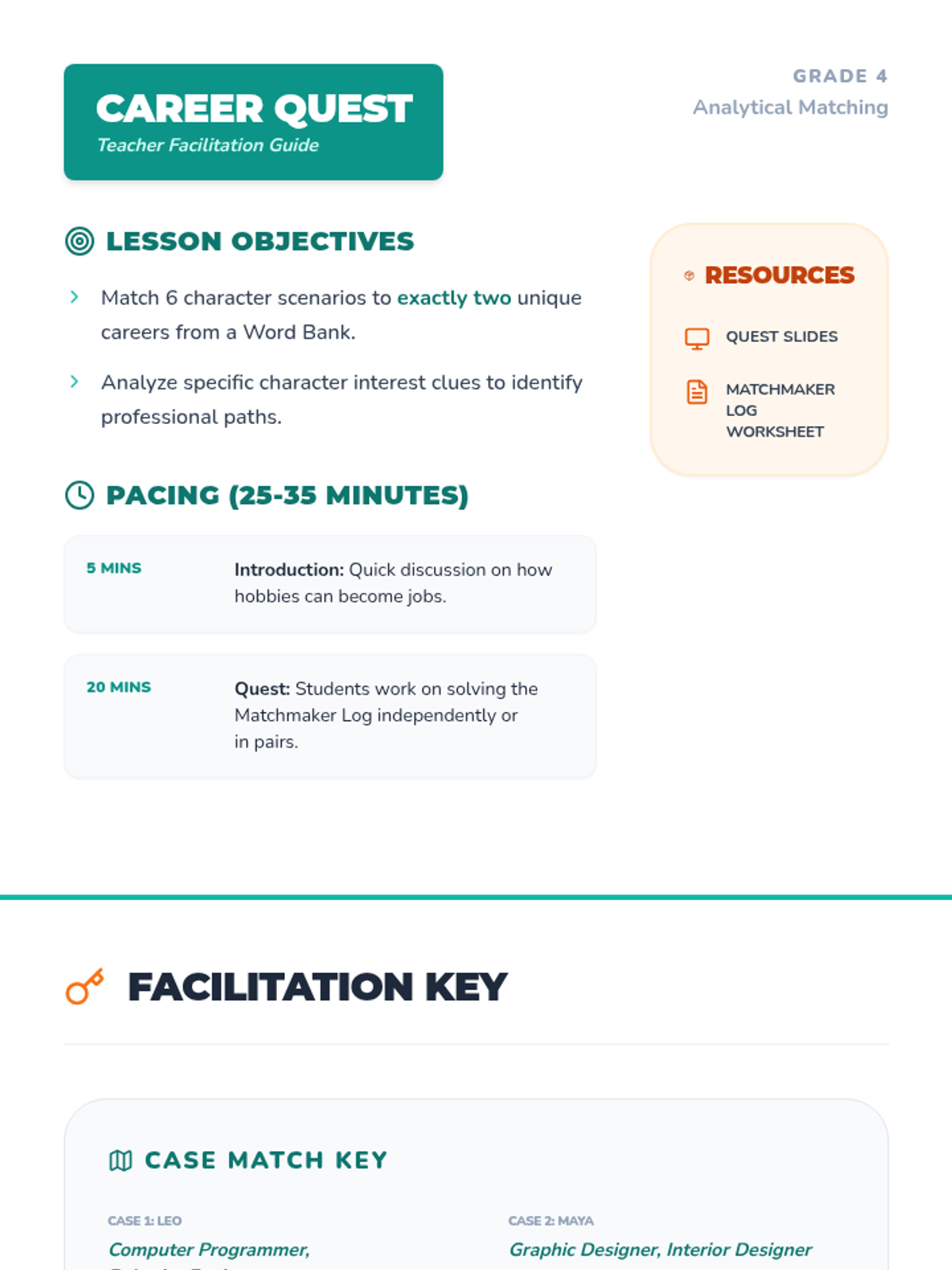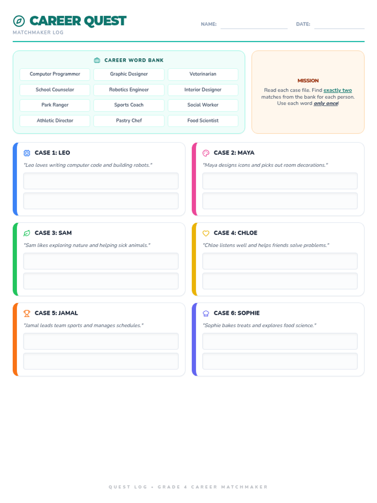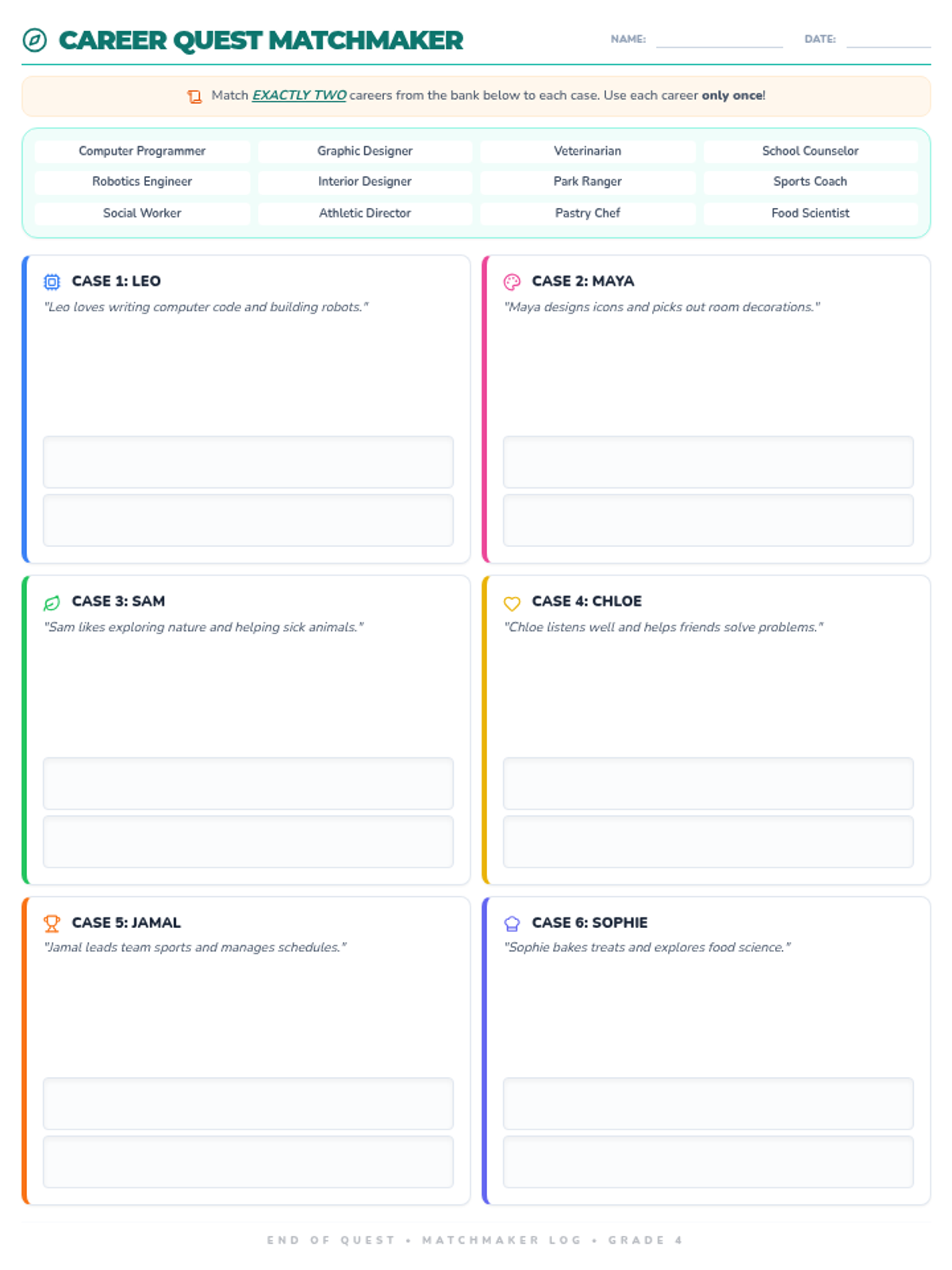 A career exploration lesson for 4th graders focused on connecting personal interests, hobbies, and strengths to potential future career paths through scenarios and reflection.