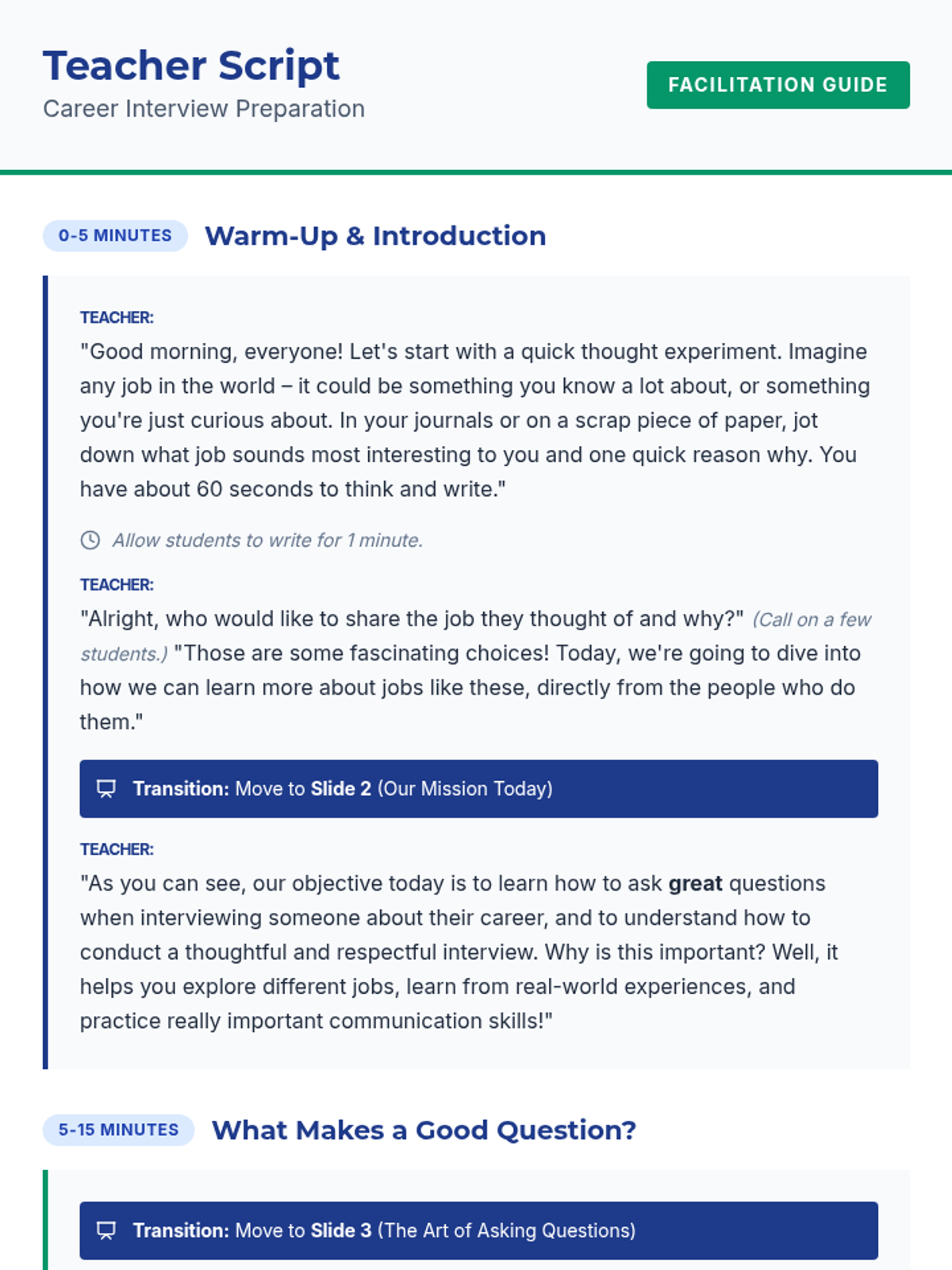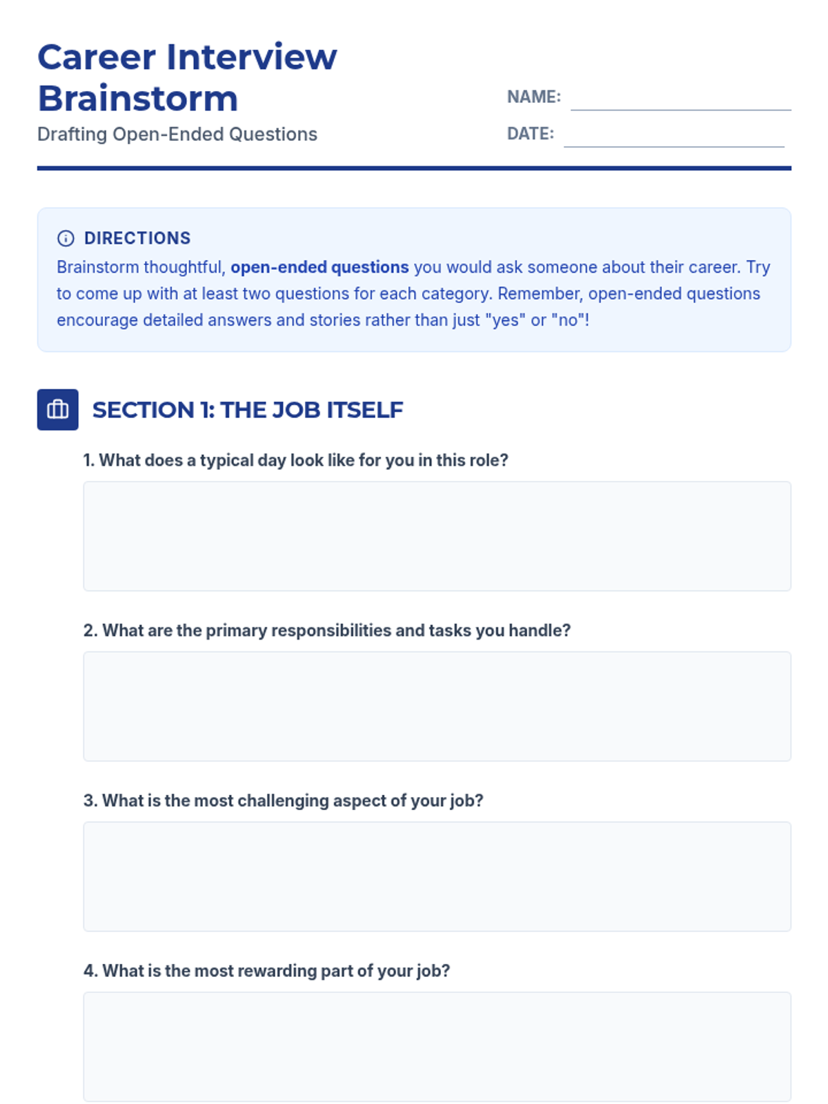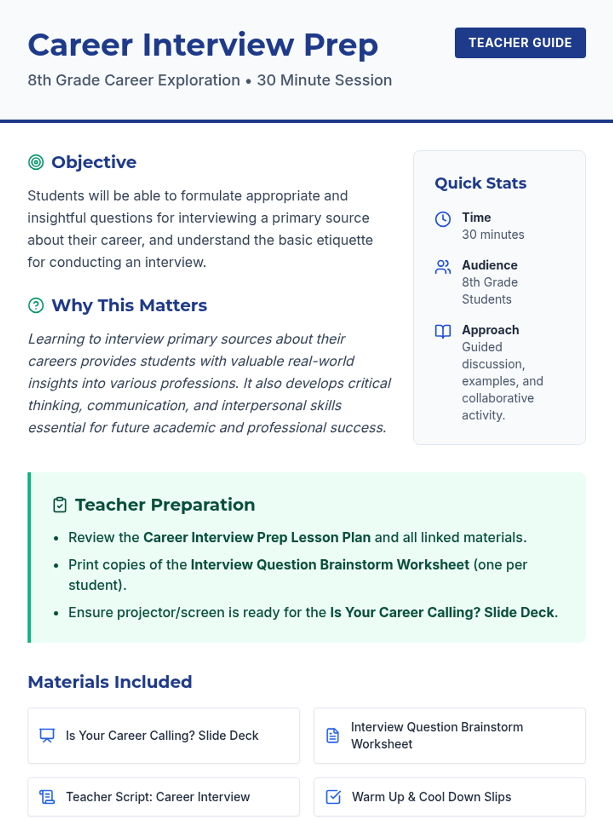 This lesson prepares 8th-grade students to effectively interview a primary source about their career, focusing on open-ended questions and professional etiquette.