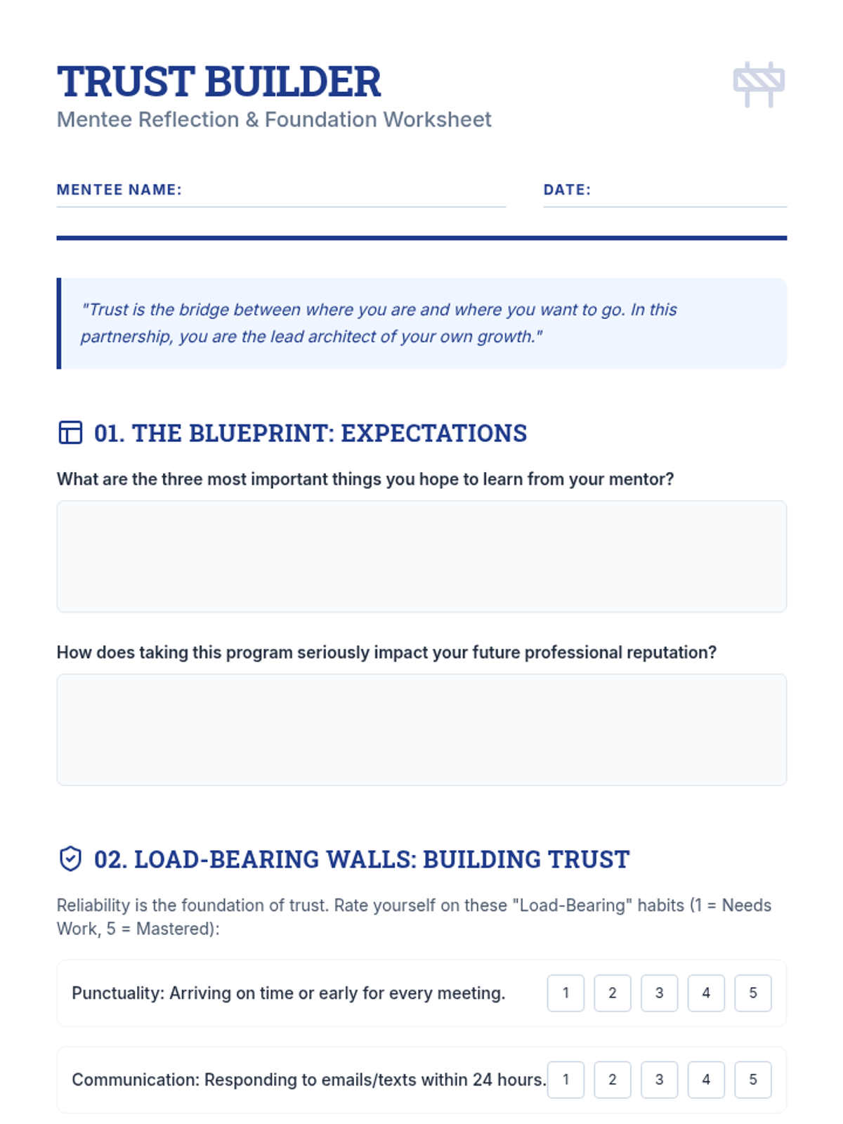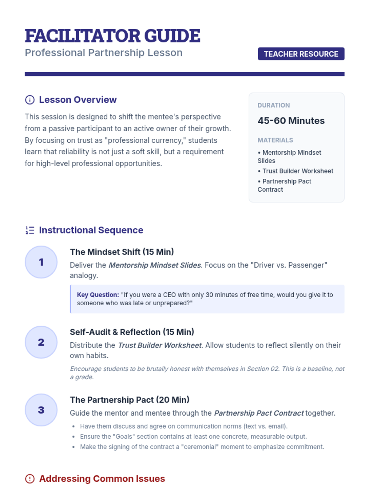 This lesson focuses on establishing a professional foundation for the mentor-mentee relationship, emphasizing the importance of trust, reliability, and professional etiquette. Students will reflect on their role as a mentee and formalize their commitment through a collaborative contract.