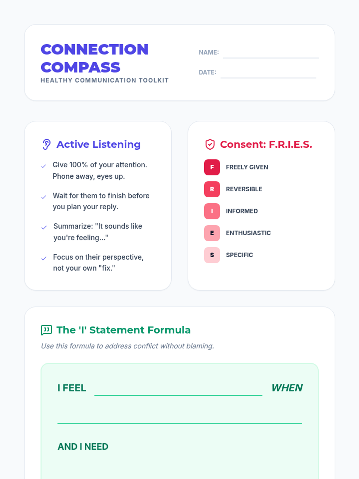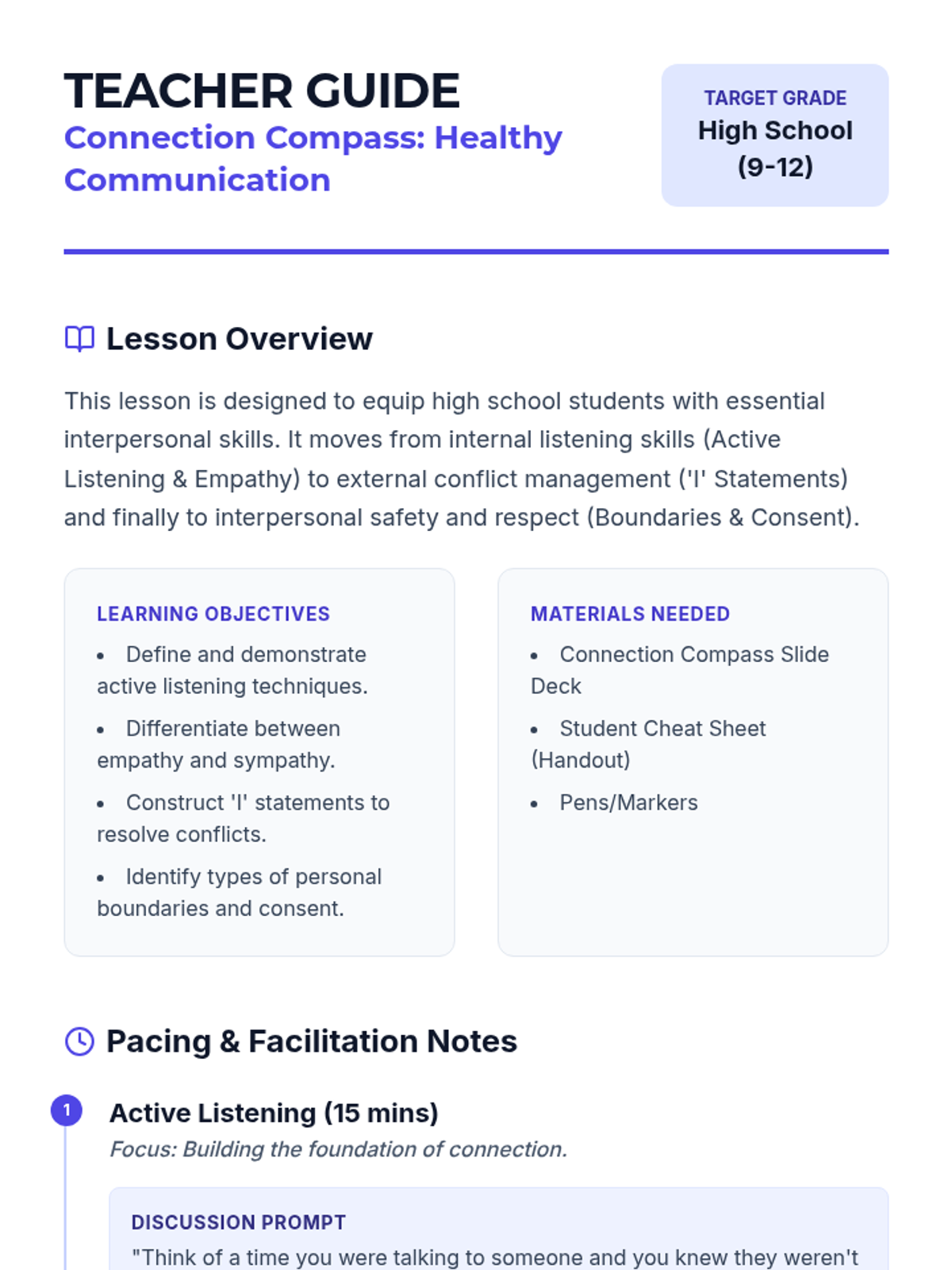 A comprehensive lesson on healthy communication skills, focusing on active listening, conflict resolution, and setting boundaries. Students engage with theory and practice through real-world scenarios.