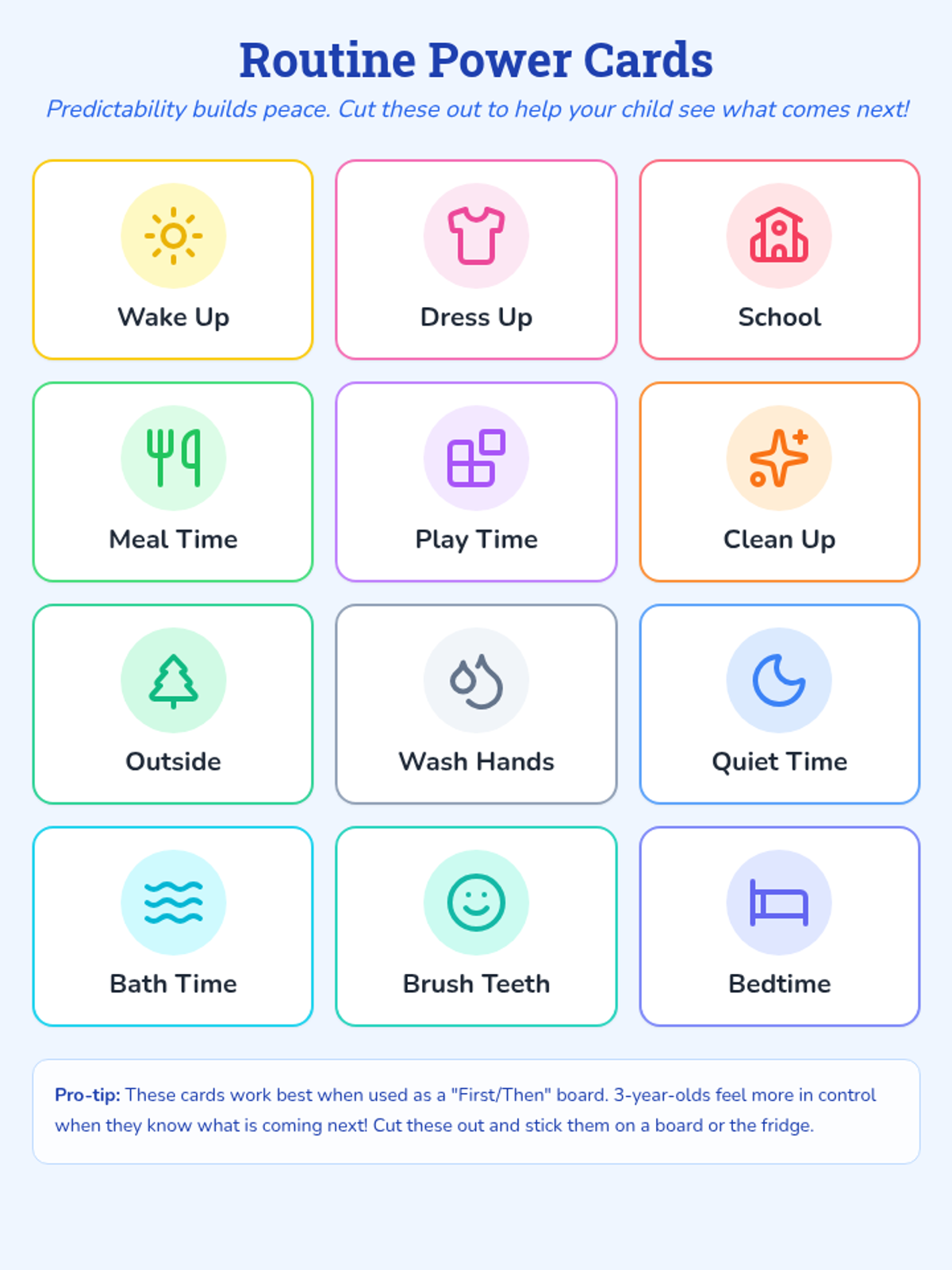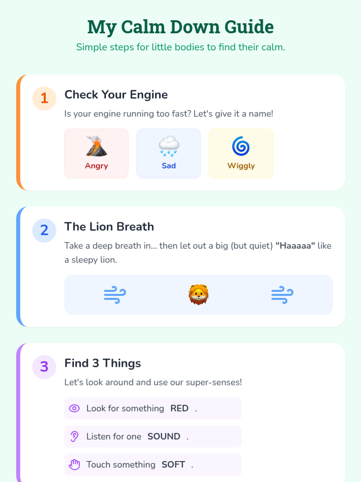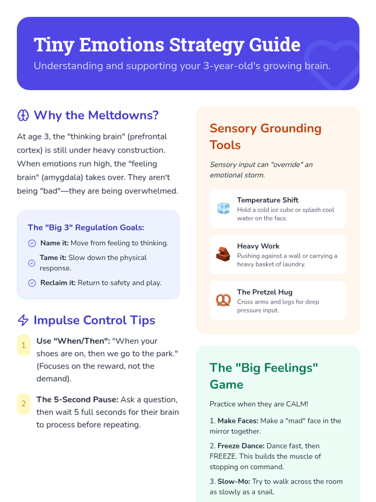 A collection of resources for parents of 3-year-olds to support emotional regulation and impulse control through visual routines and sensory grounding.