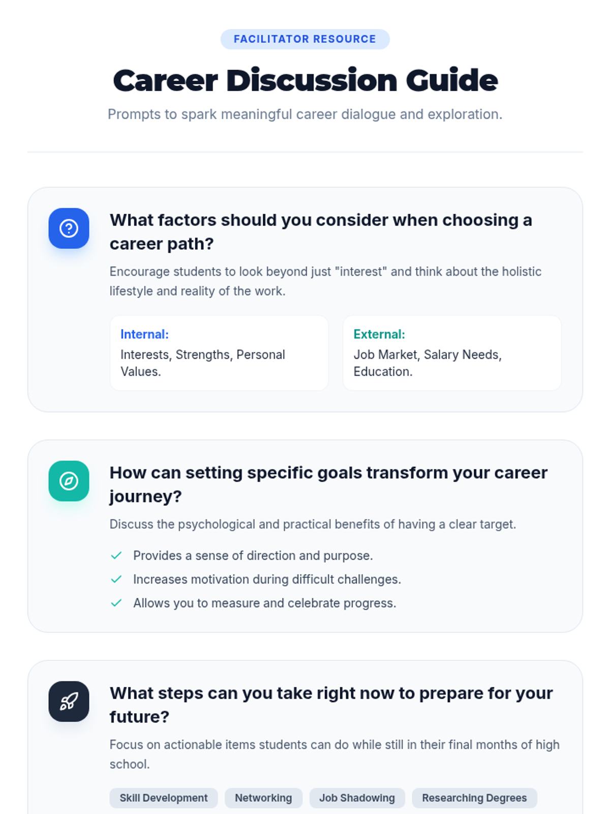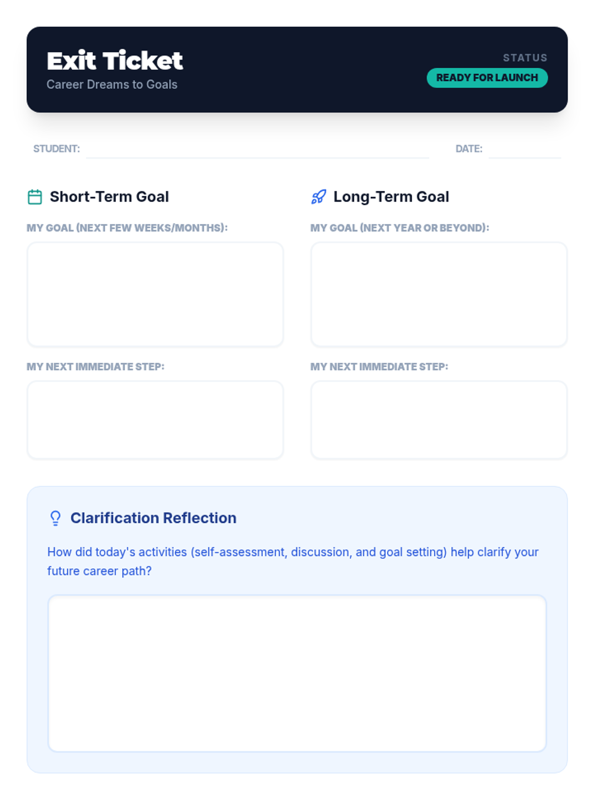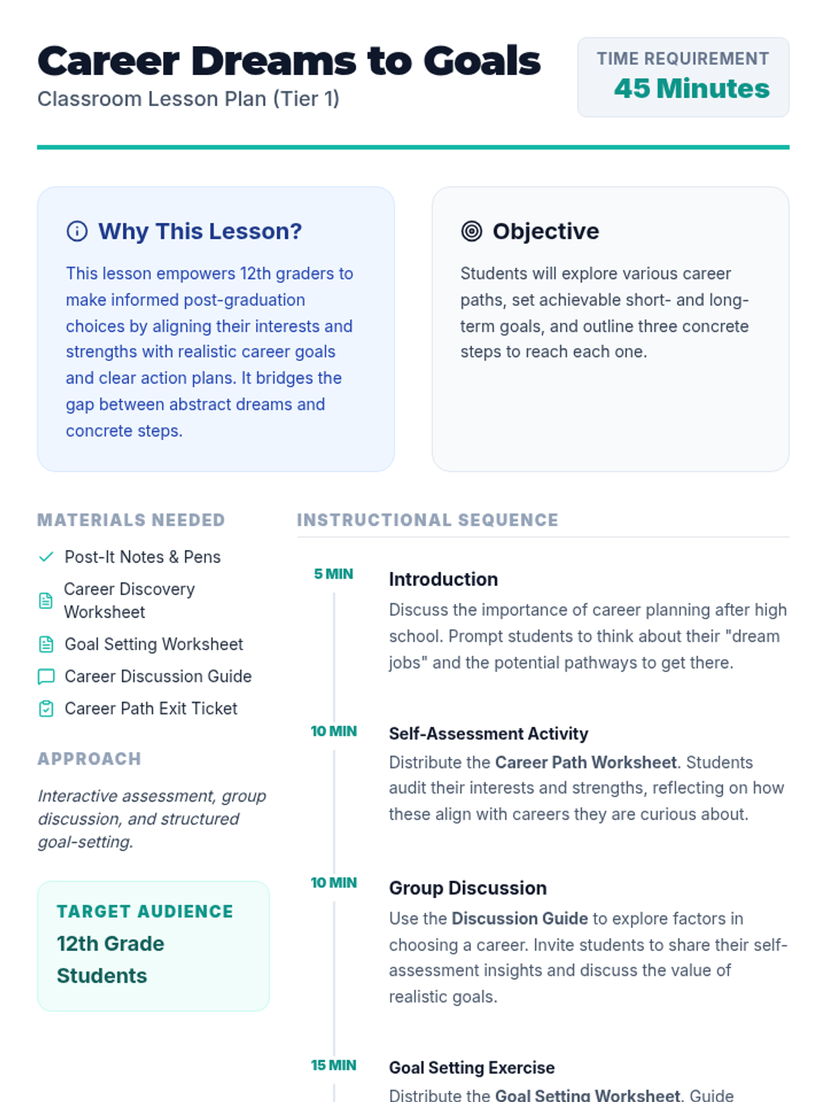 This lesson helps 12th graders align their personal interests and strengths with realistic career paths through self-reflection, group discussion, and structured goal-setting. Students will create a concrete action plan for their short- and long-term career aspirations.