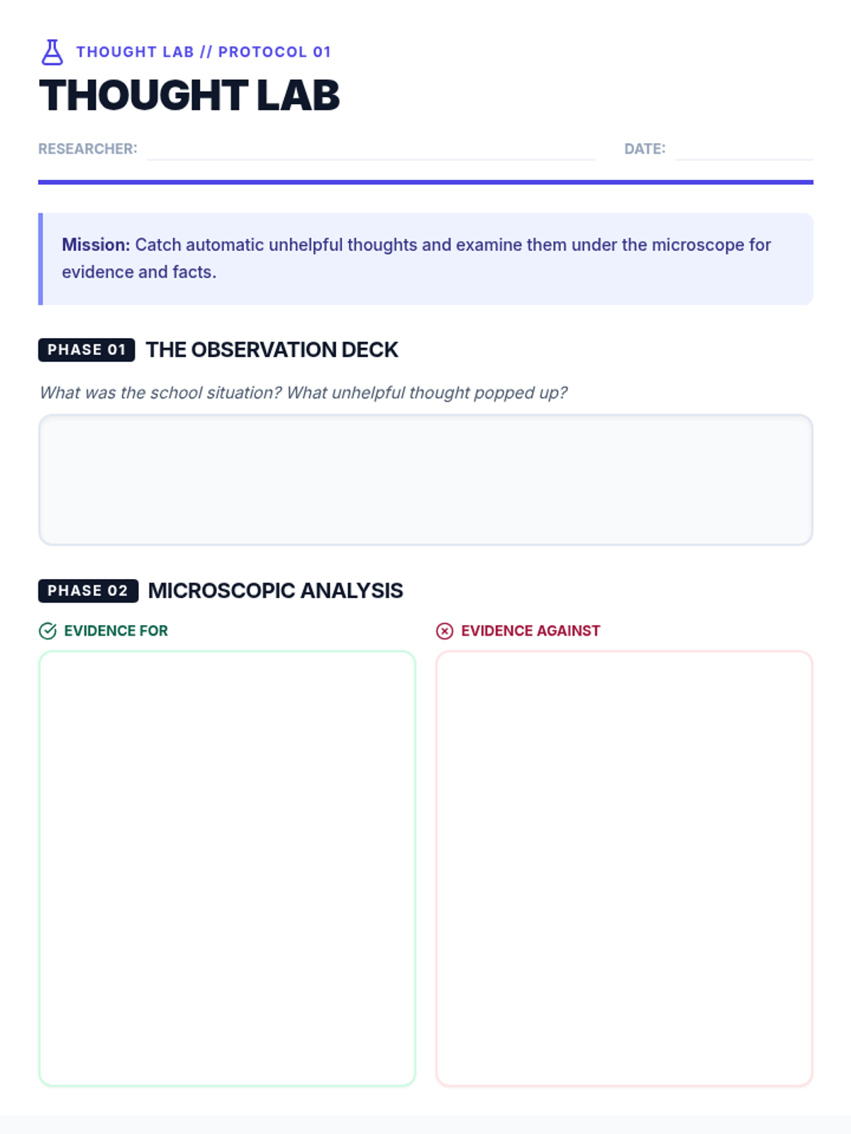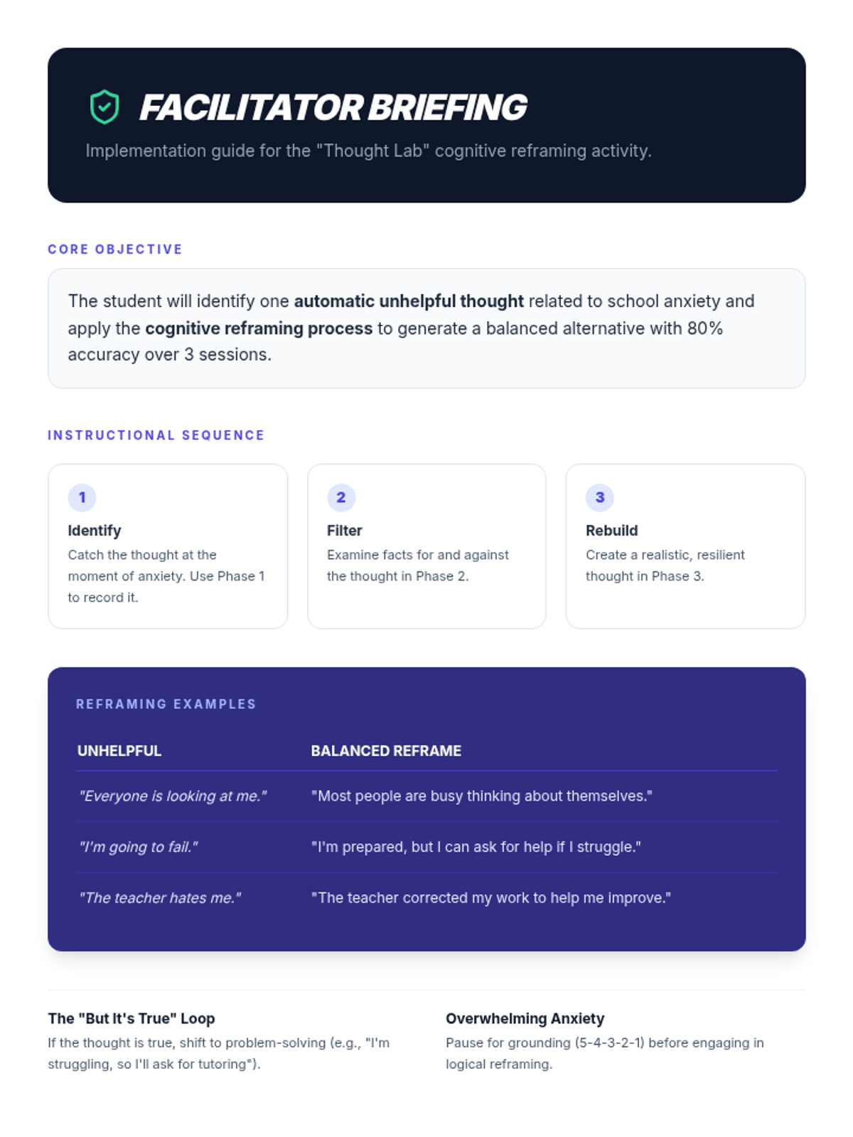 An IEP counseling lesson focused on cognitive reframing techniques to help students manage school-based anxiety by transforming unhelpful thoughts into balanced, helpful ones.