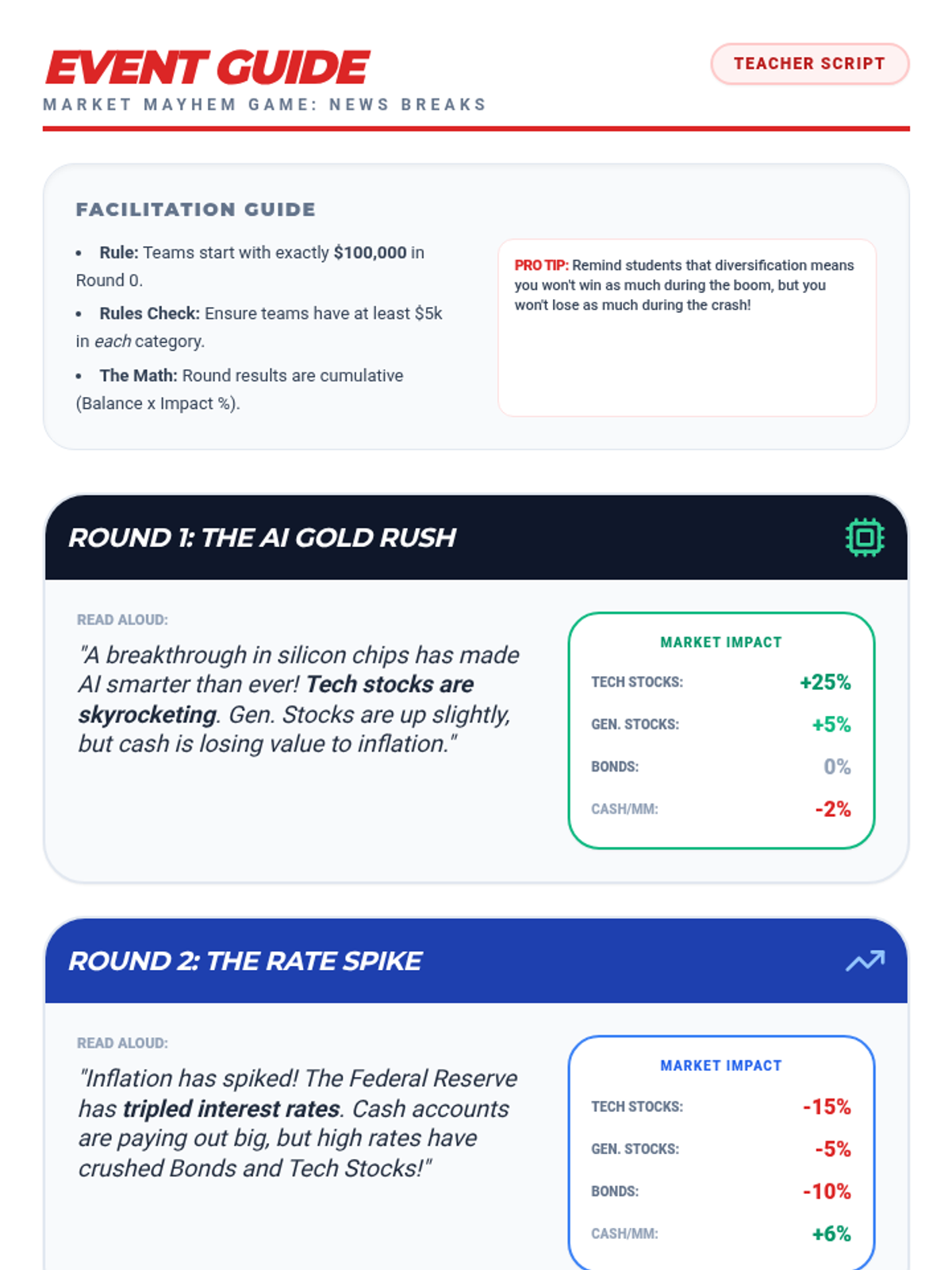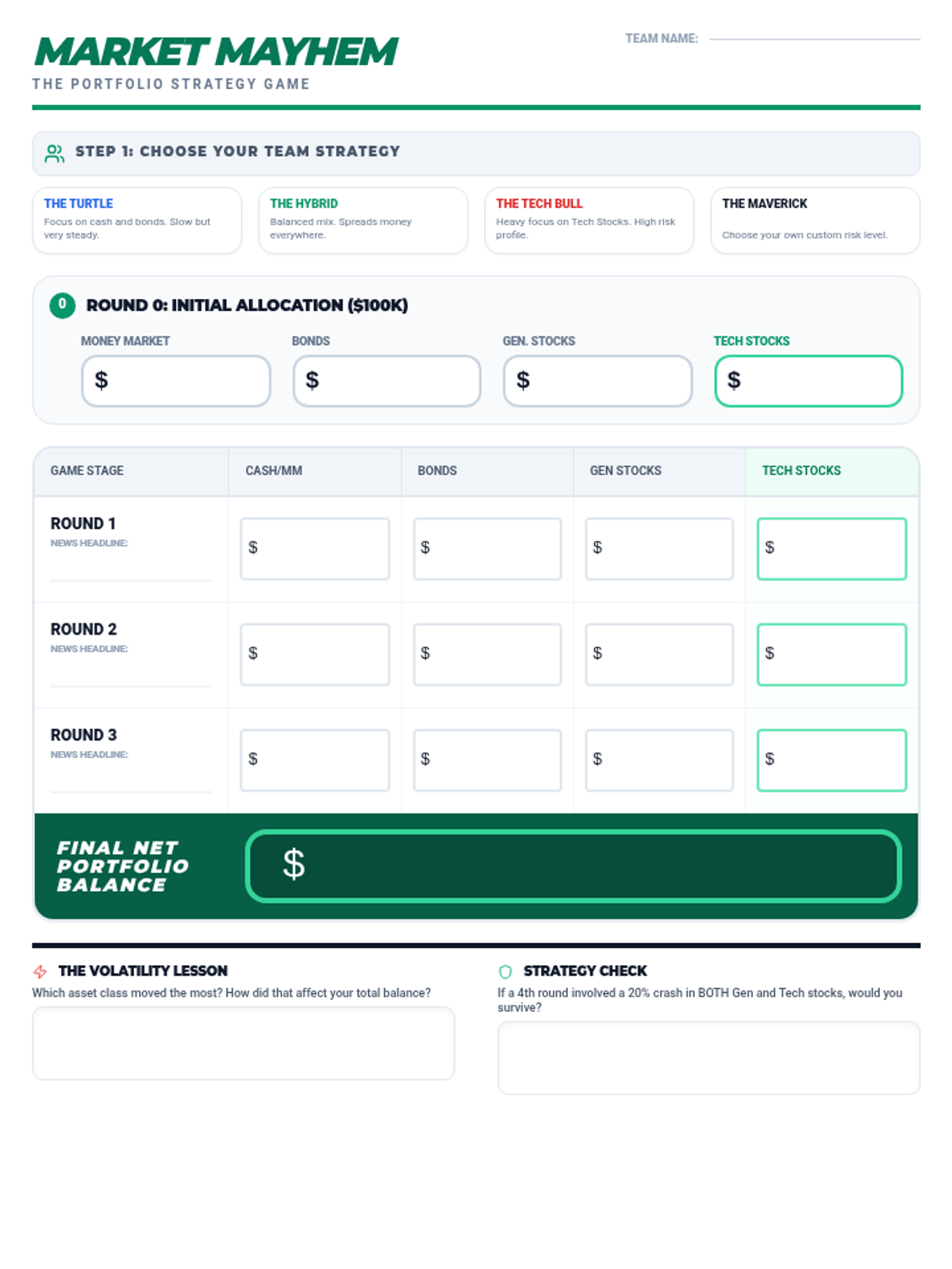 An introductory lesson on the fundamental building blocks of investing, covering stocks, bonds, and money market accounts with a focus on risk vs. return and diversification.
