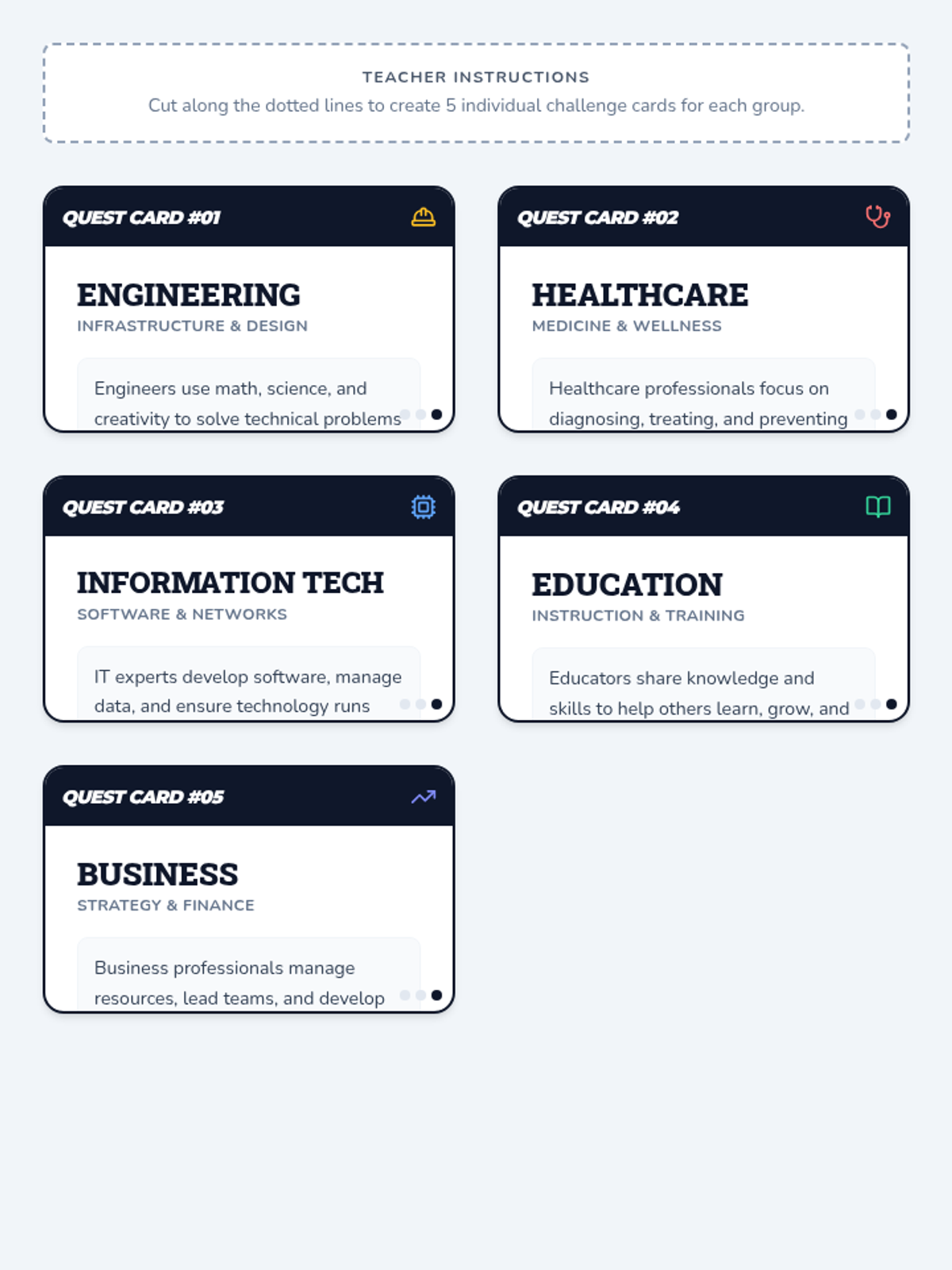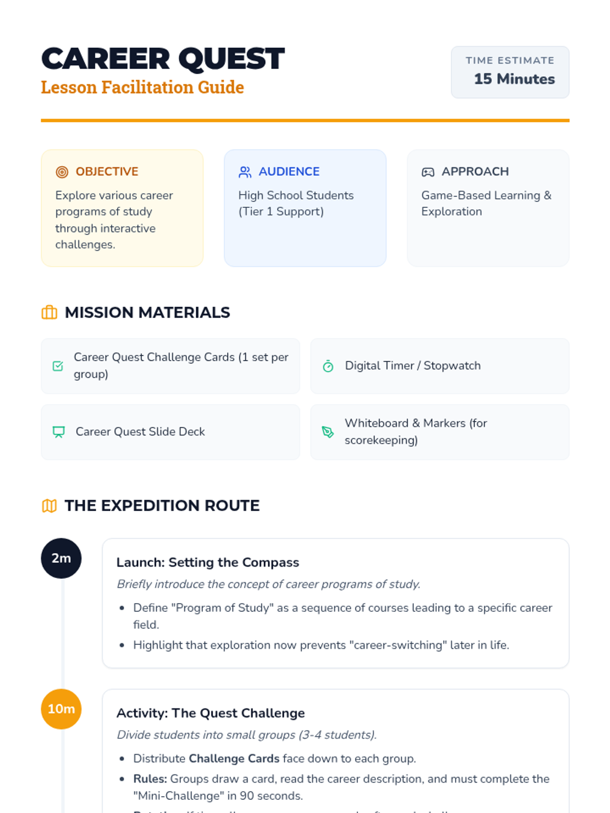 An interactive, game-based exploration of career programs of study designed for high school students to discover potential future paths in just 15 minutes.