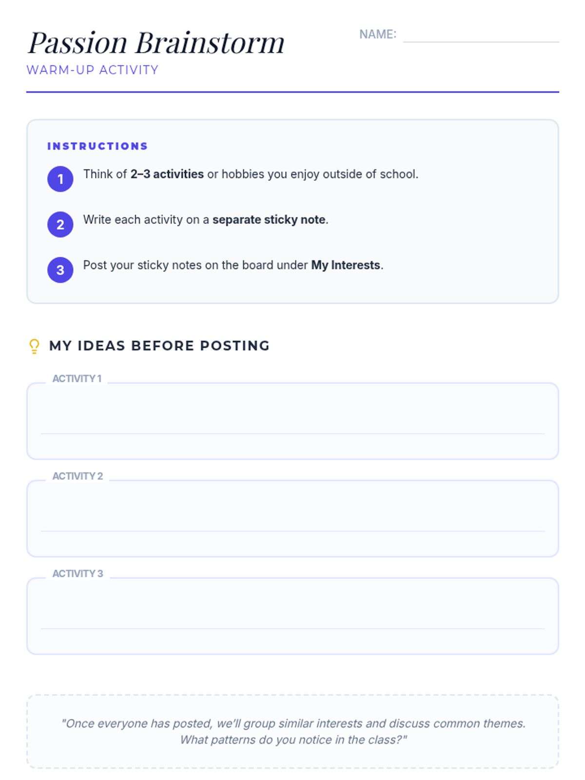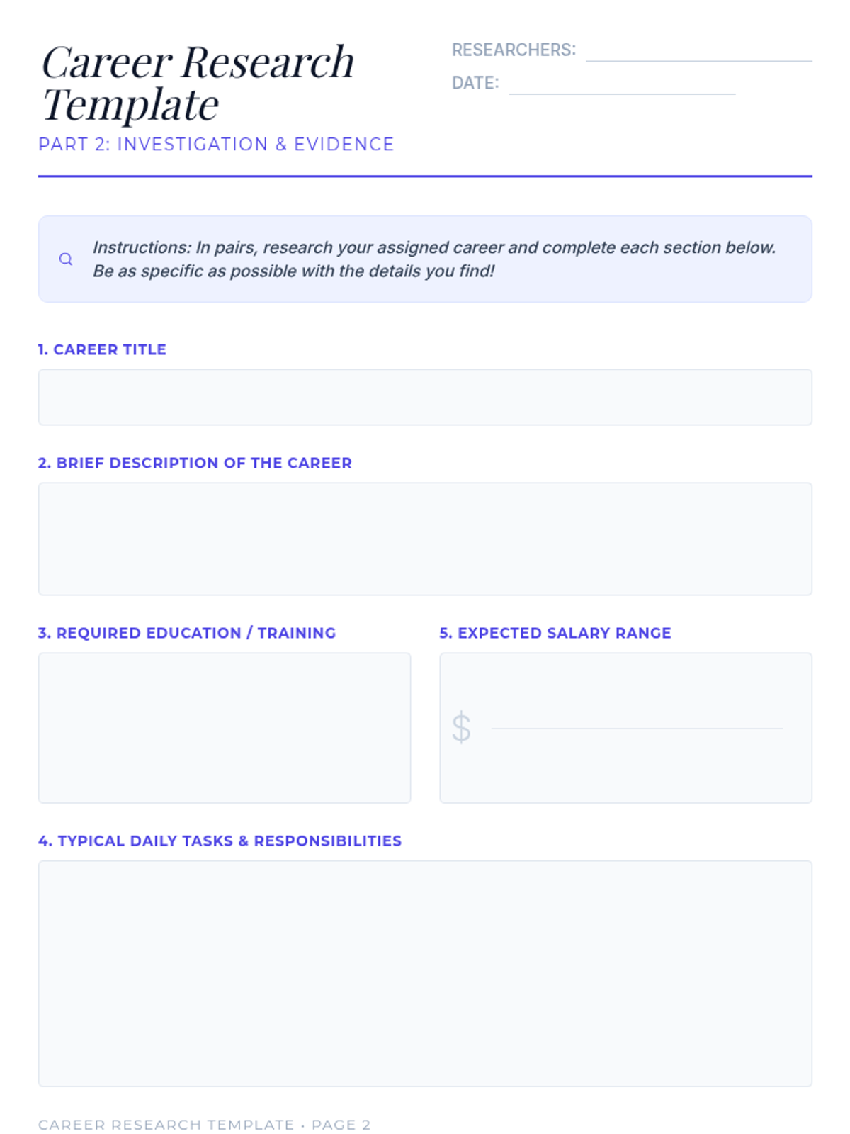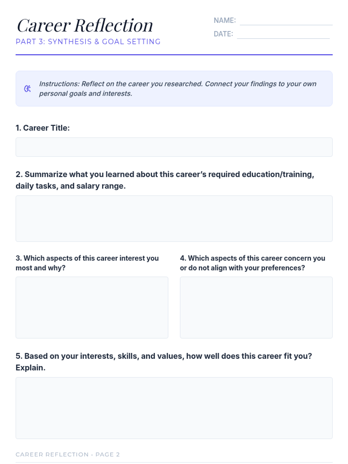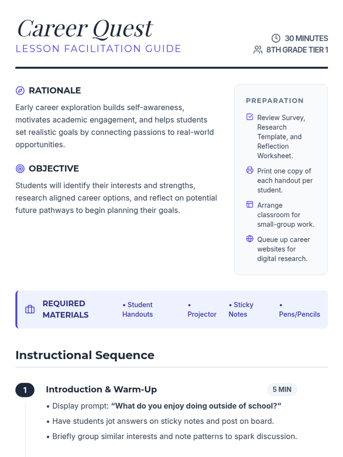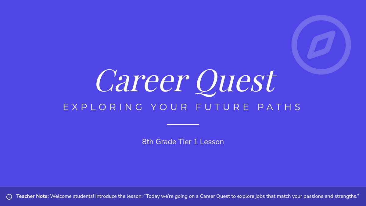 A 30-minute, 8th grade Tier 1 lesson where students explore career paths, reflect on their strengths, and begin mapping out their potential futures through interactive surveys and research.