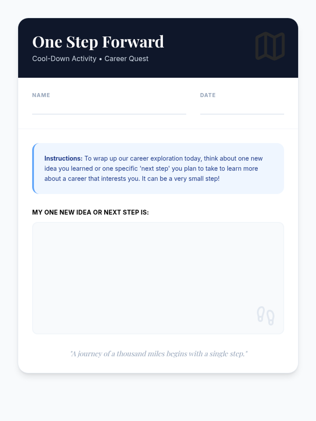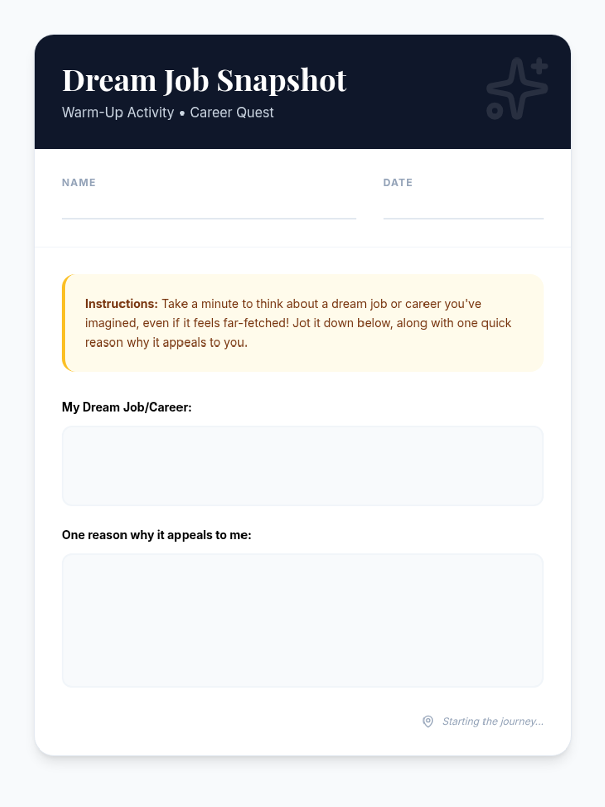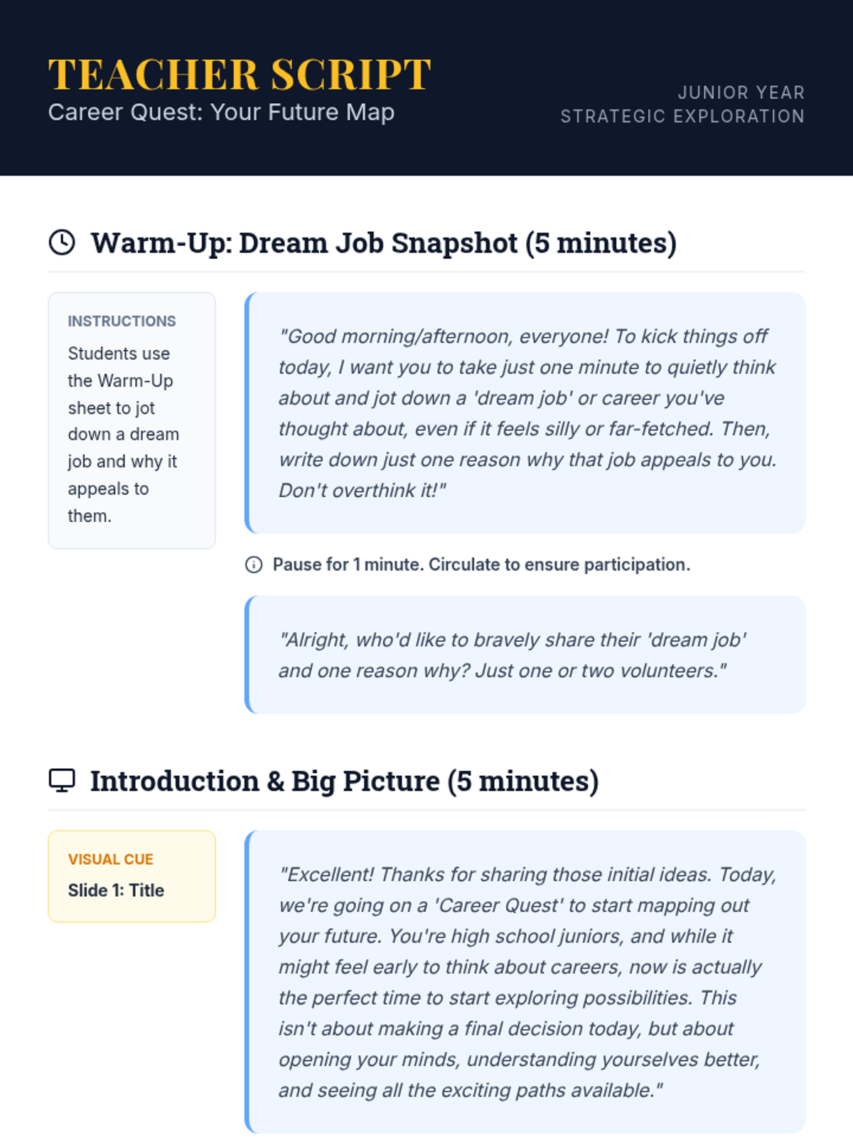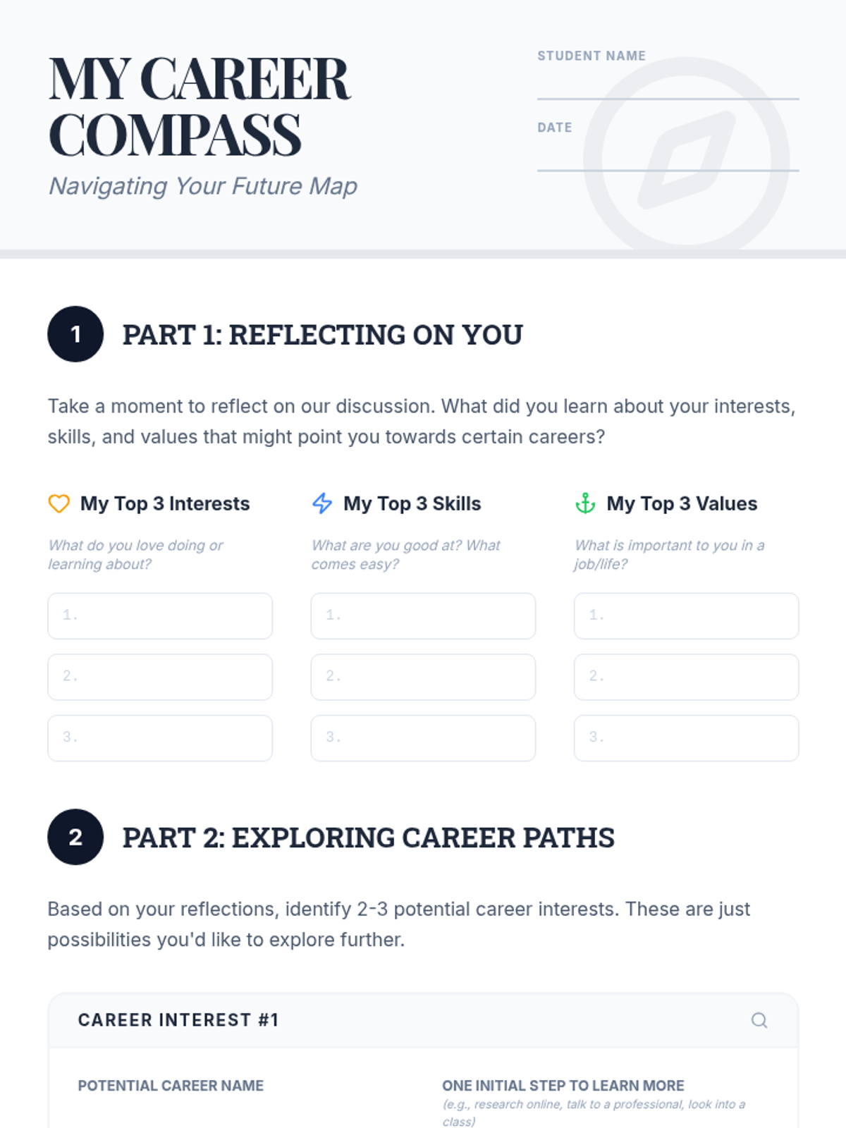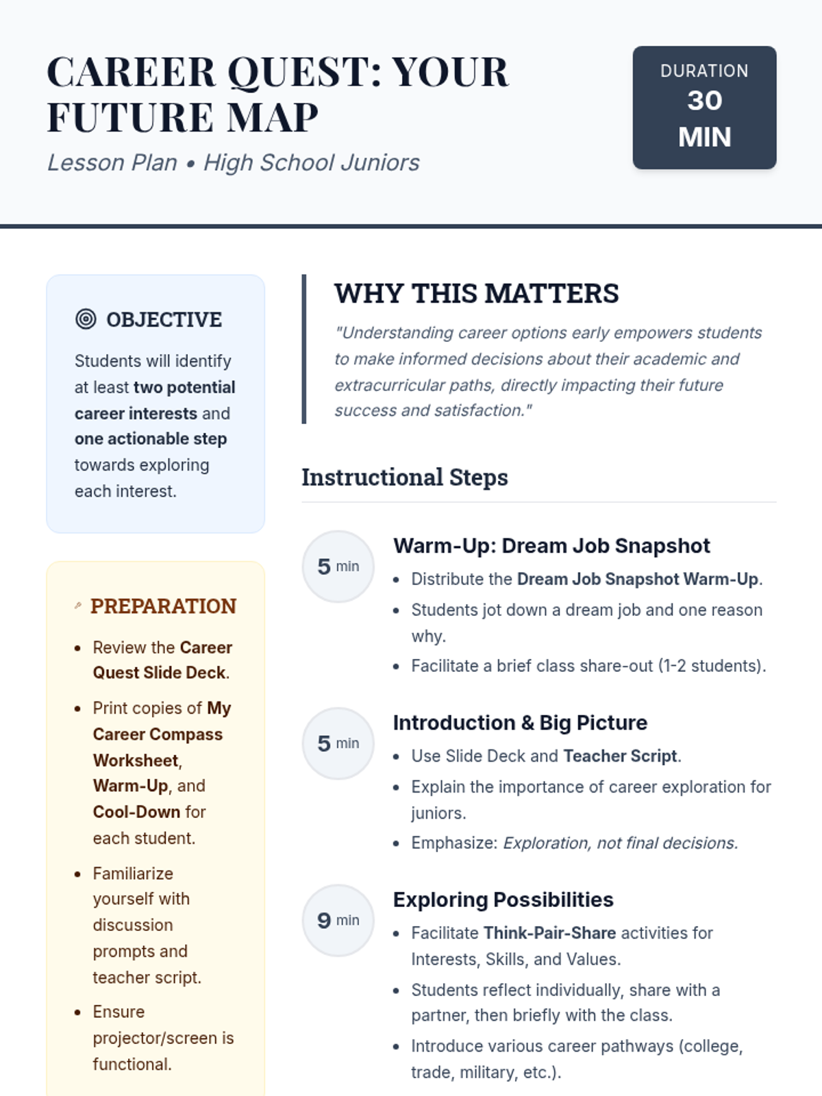 This lesson helps high school juniors explore potential career paths by identifying interests, skills, and values. It provides a structured framework for students to begin strategic future planning through interactive discussion and self-reflection.