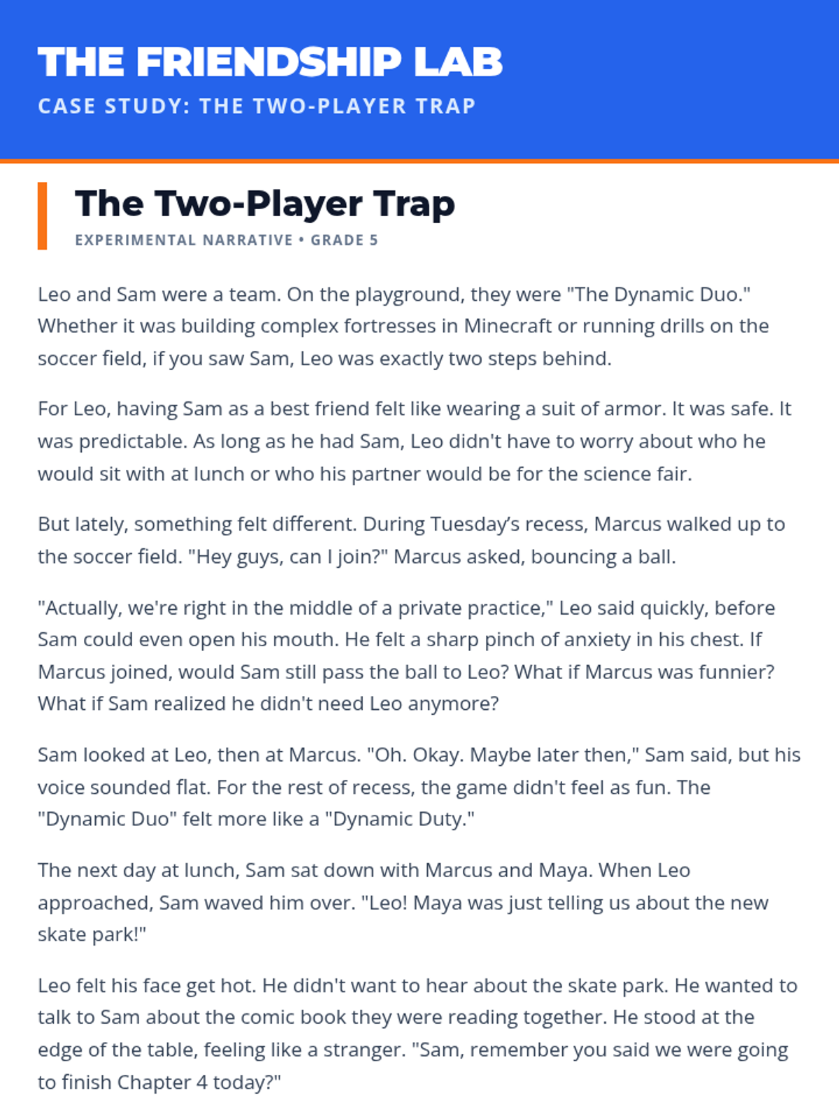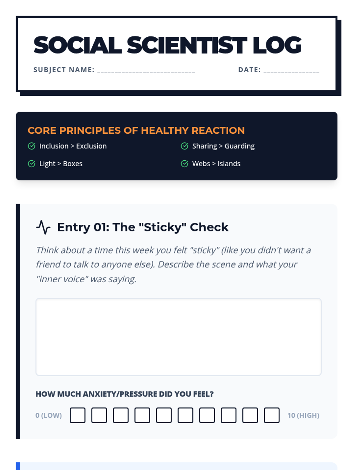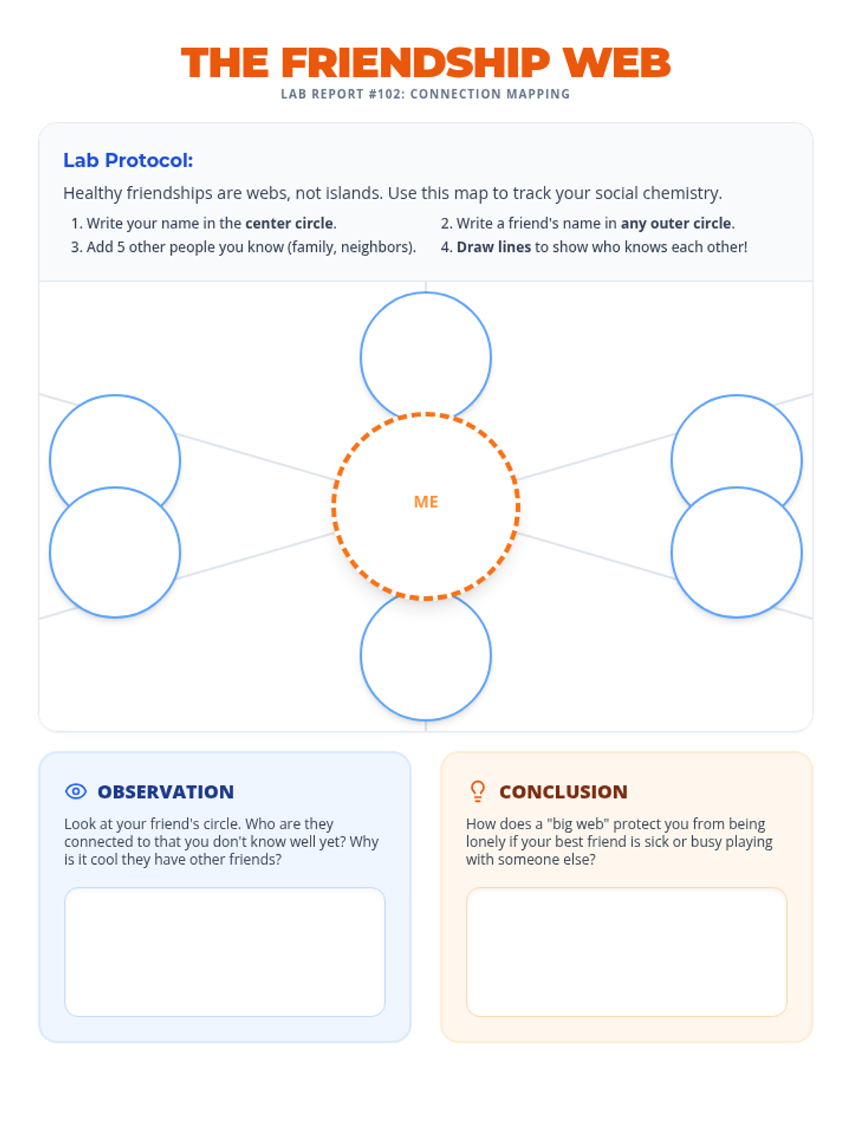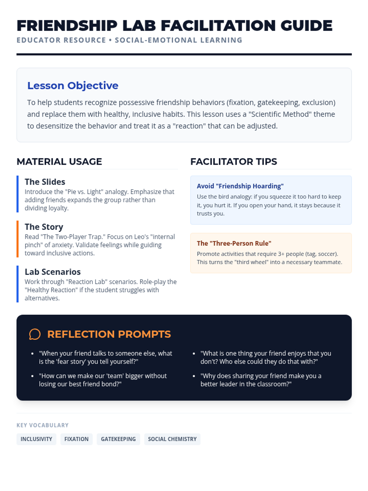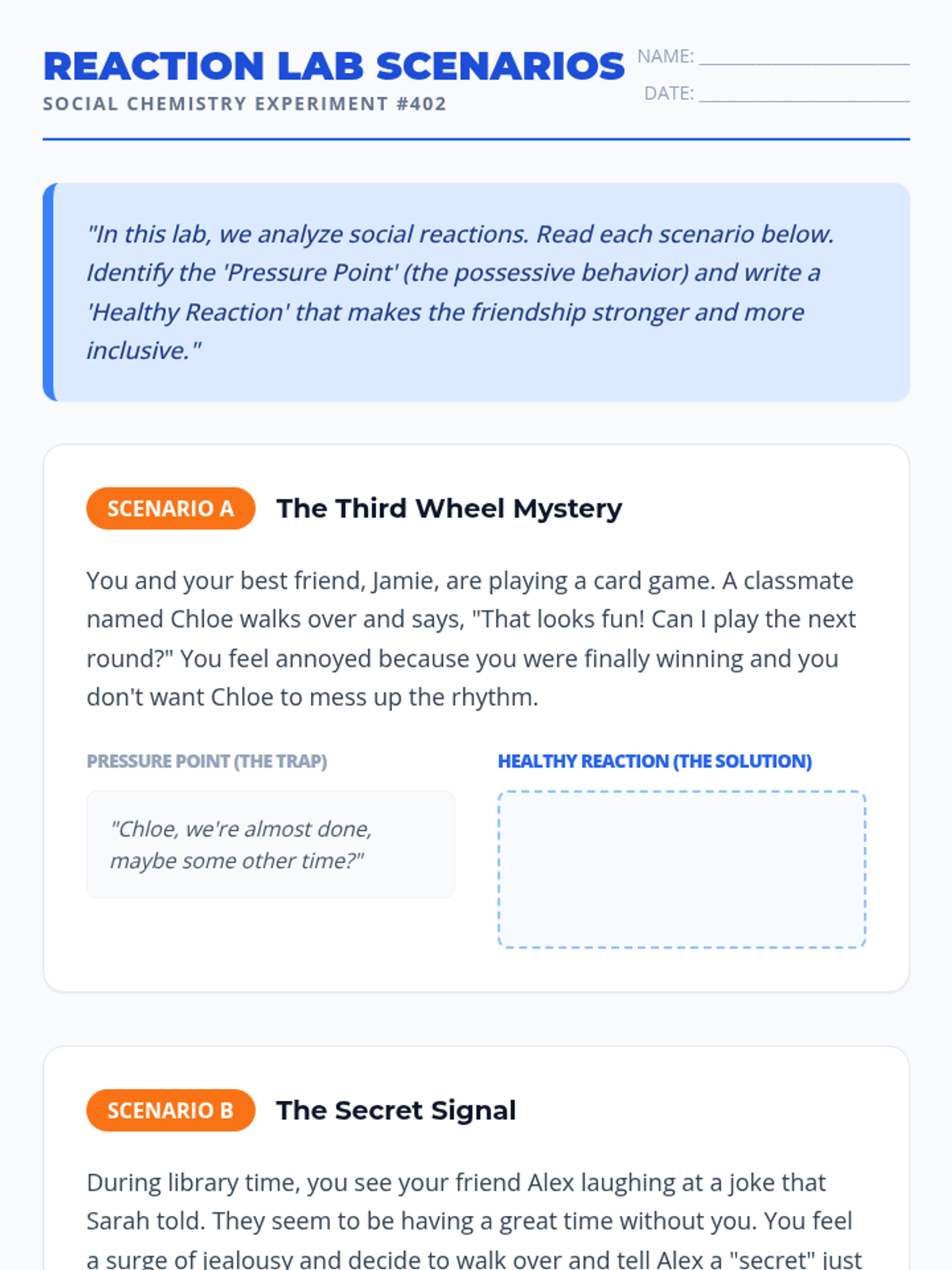 A social-emotional learning lesson designed to help students understand the difference between healthy, inclusive friendships and possessive or fixated behaviors. Through a 'Friendship Lab' theme, students analyze social 'reactions' and learn the value of expanding their social circles.
