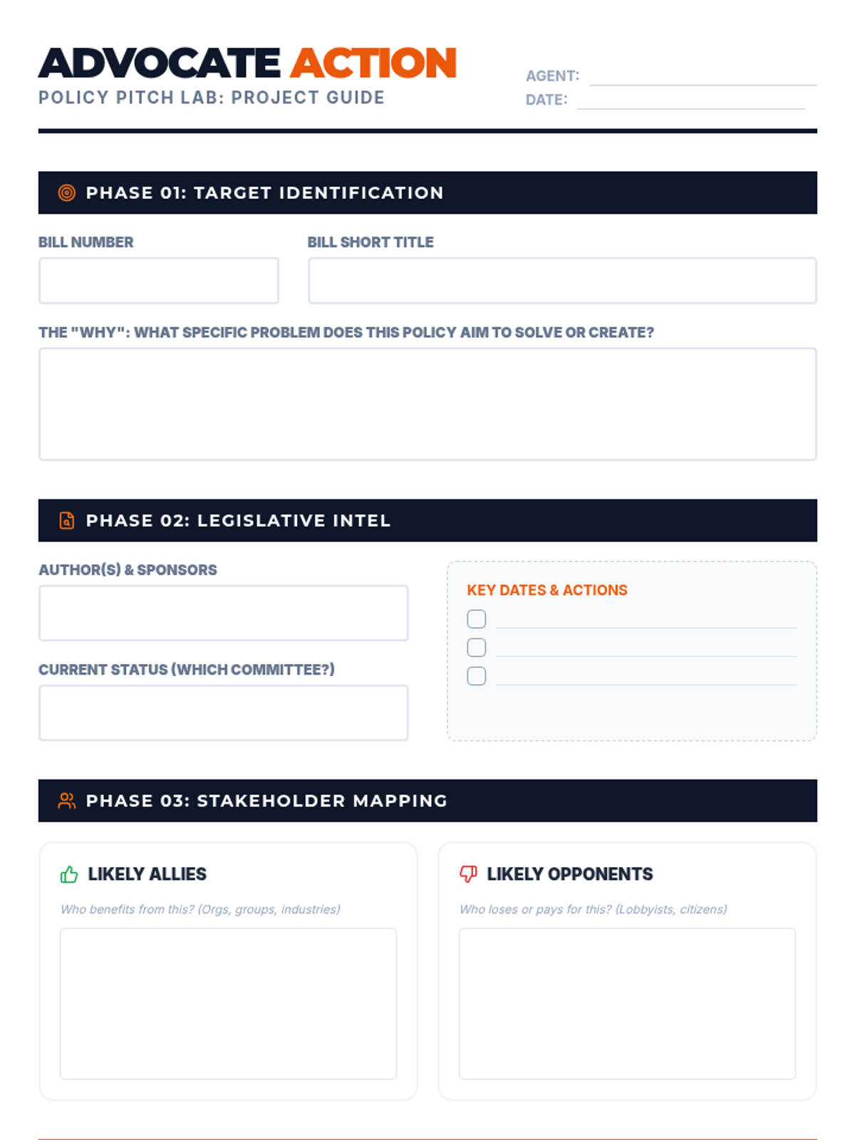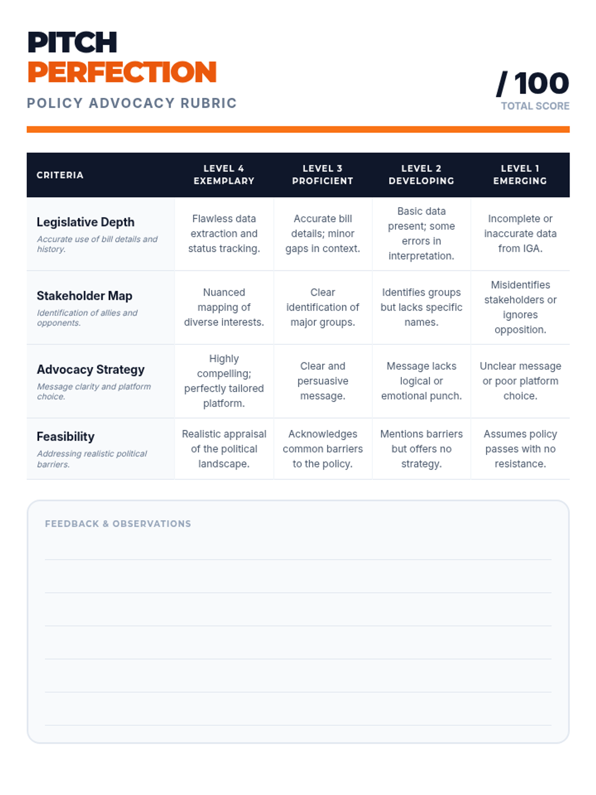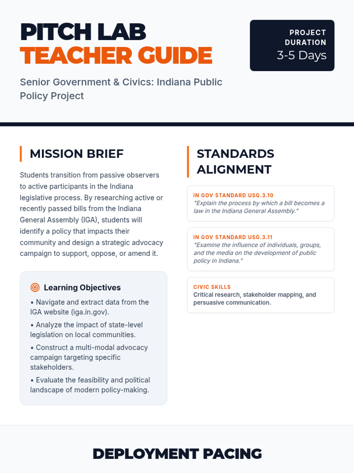 High school seniors research active Indiana legislation and build mock advocacy campaigns to influence public policy. This hands-on project connects state-level governance with practical civic engagement.