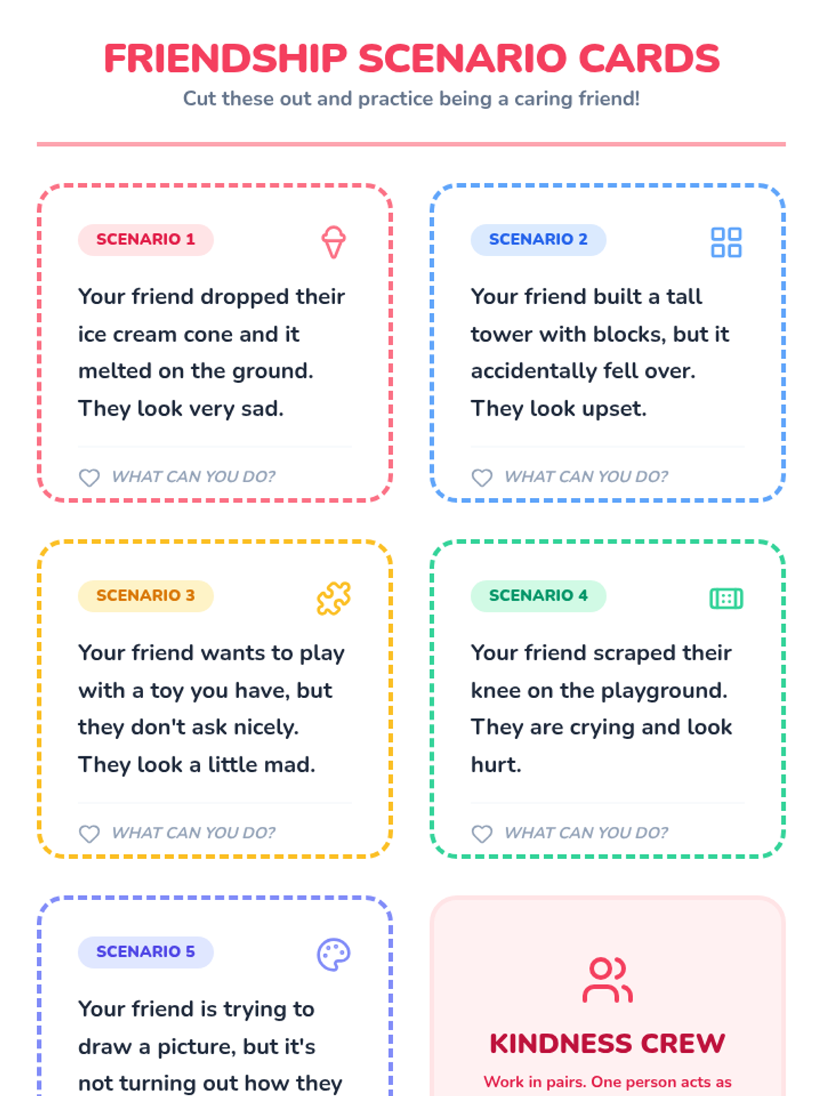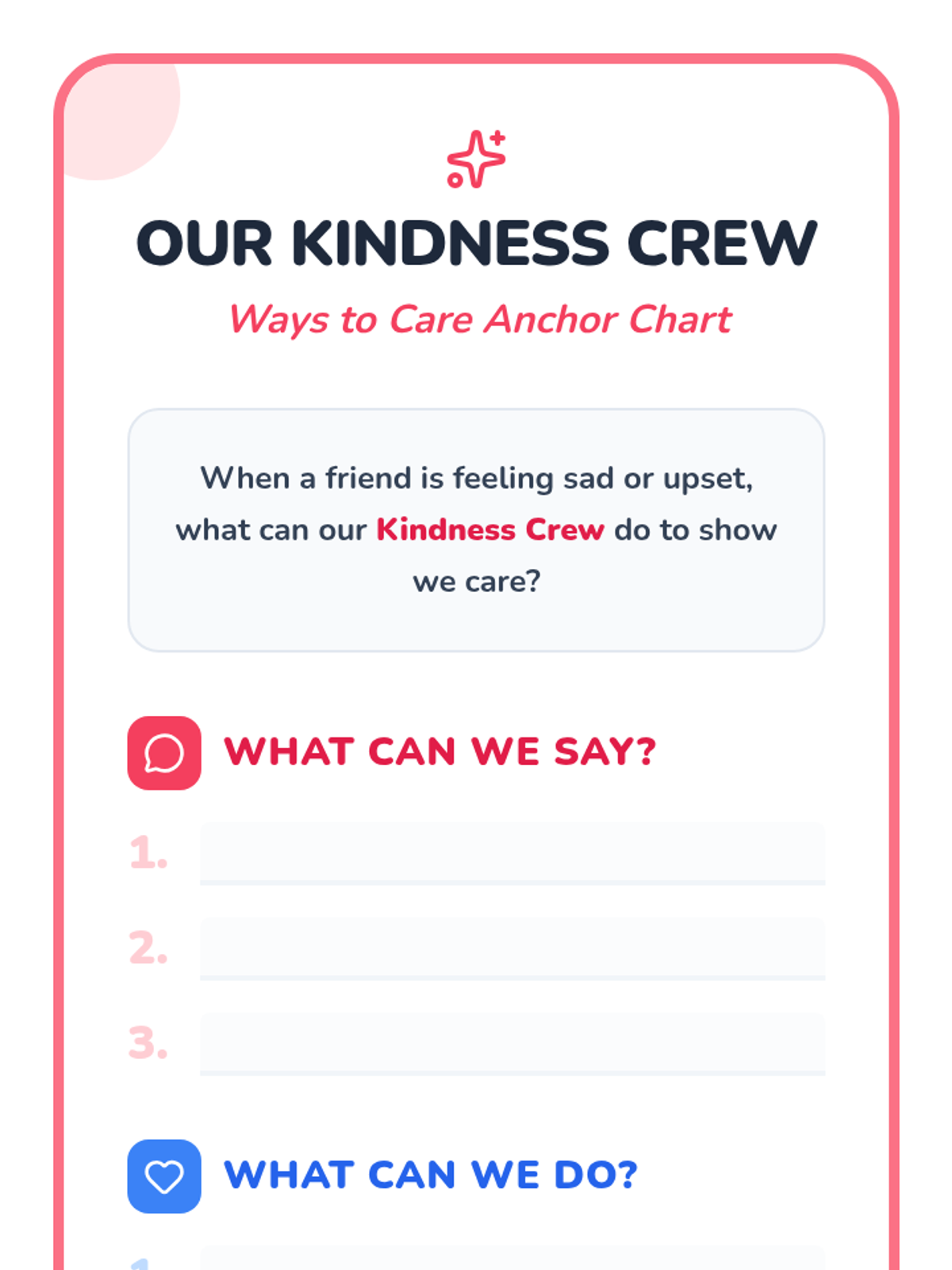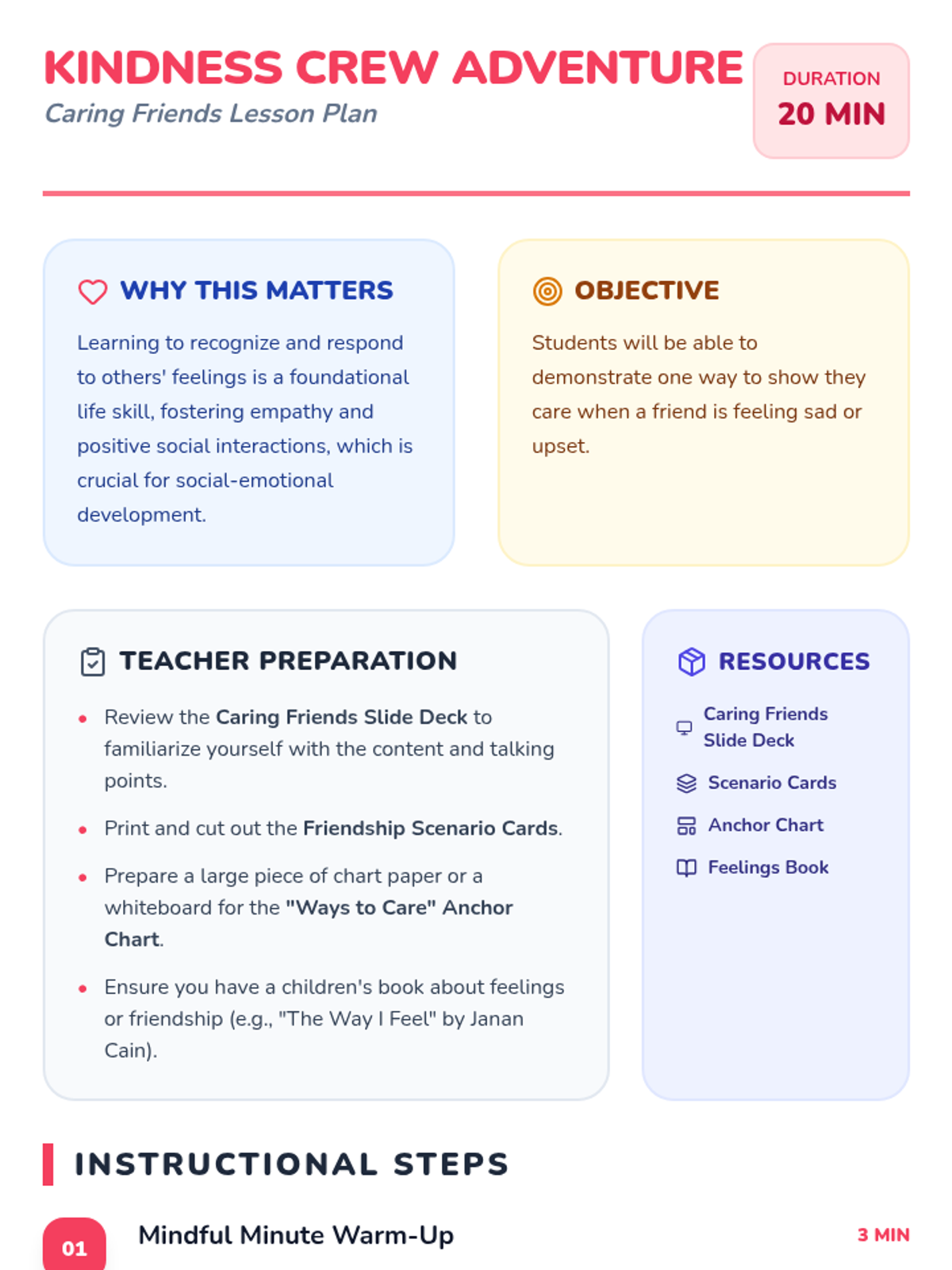 A 20-minute Kindergarten lesson where students learn to recognize and respond to their friends' feelings through interactive stories, role-play, and brainstorming. Students will join the 'Kindness Crew' to practice empathy and caring actions.