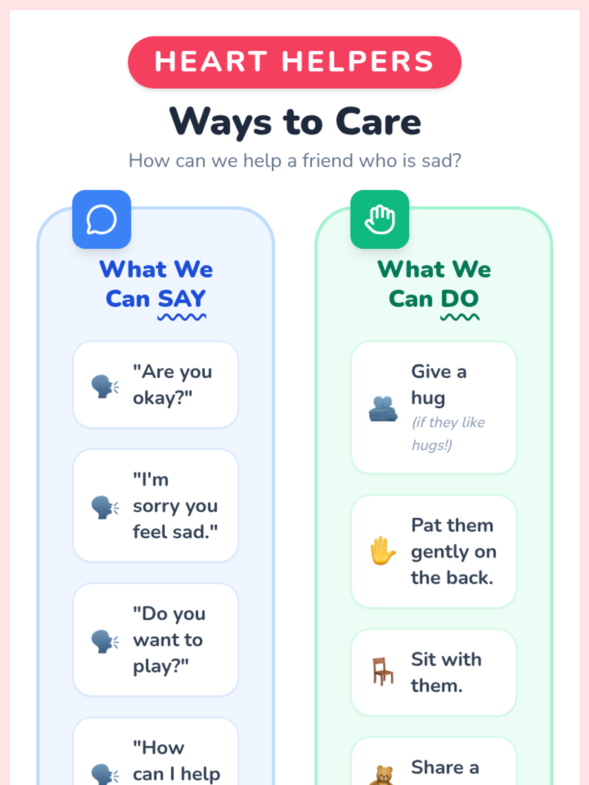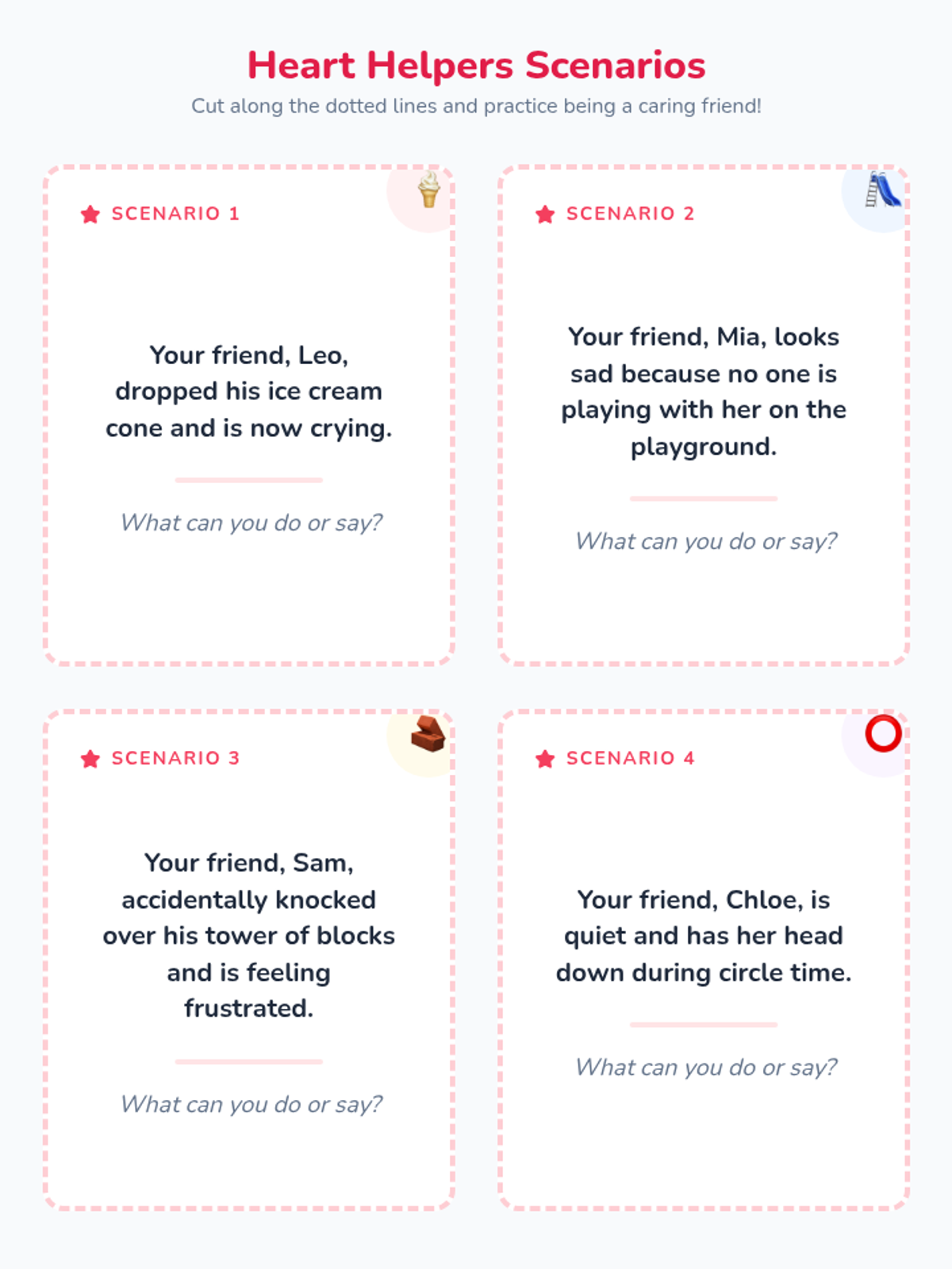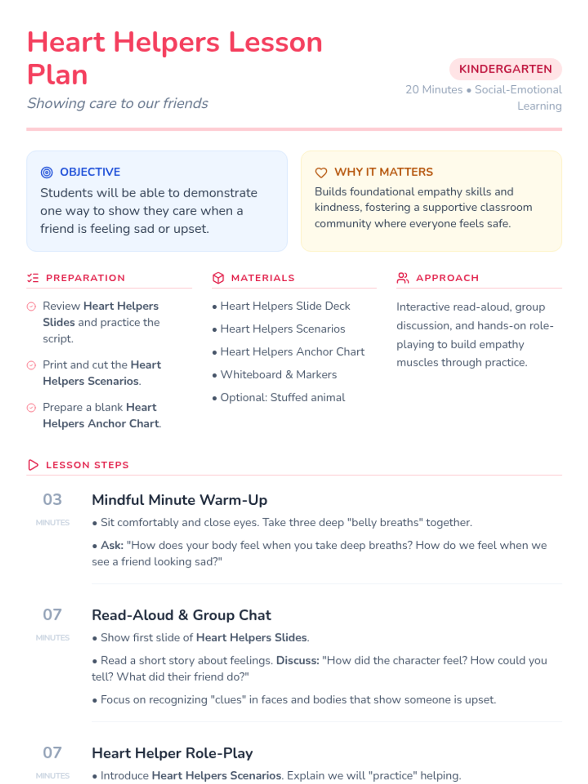 This 20-minute lesson teaches Kindergarteners how to show empathy and care for friends who are sad or upset through role-play and discussion.