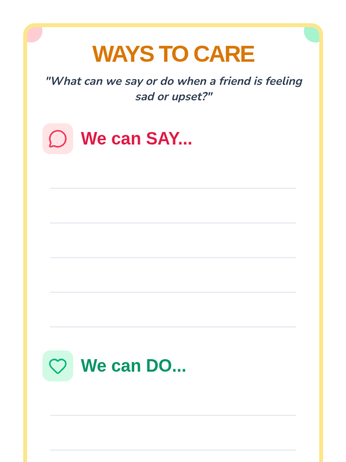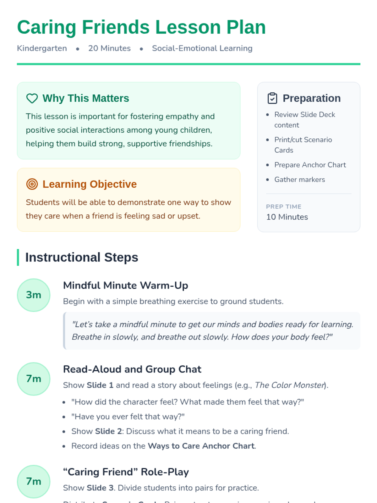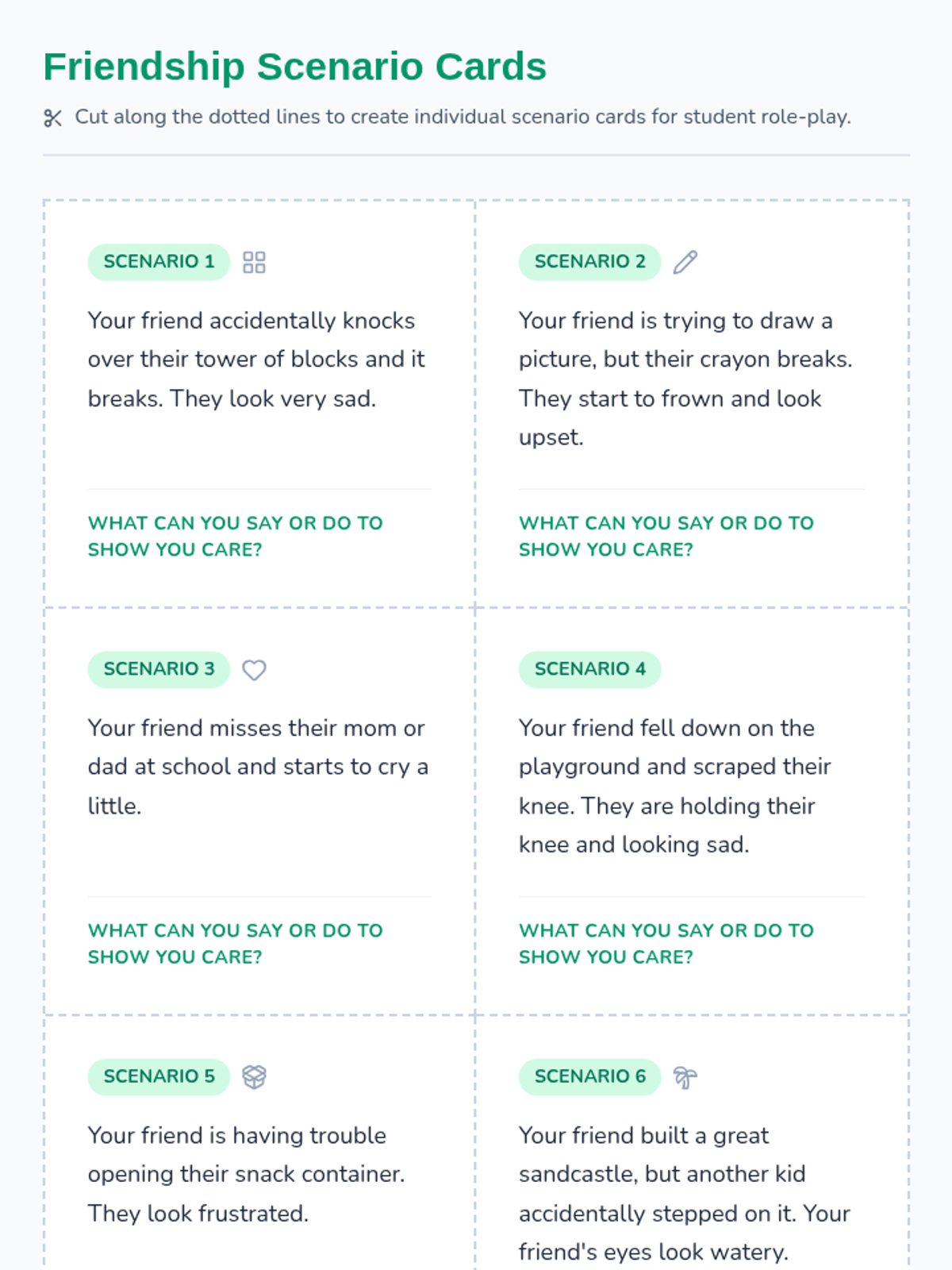 A 20-minute Kindergarten lesson on empathy and showing care to friends when they feel sad or upset through discussion and role-play.