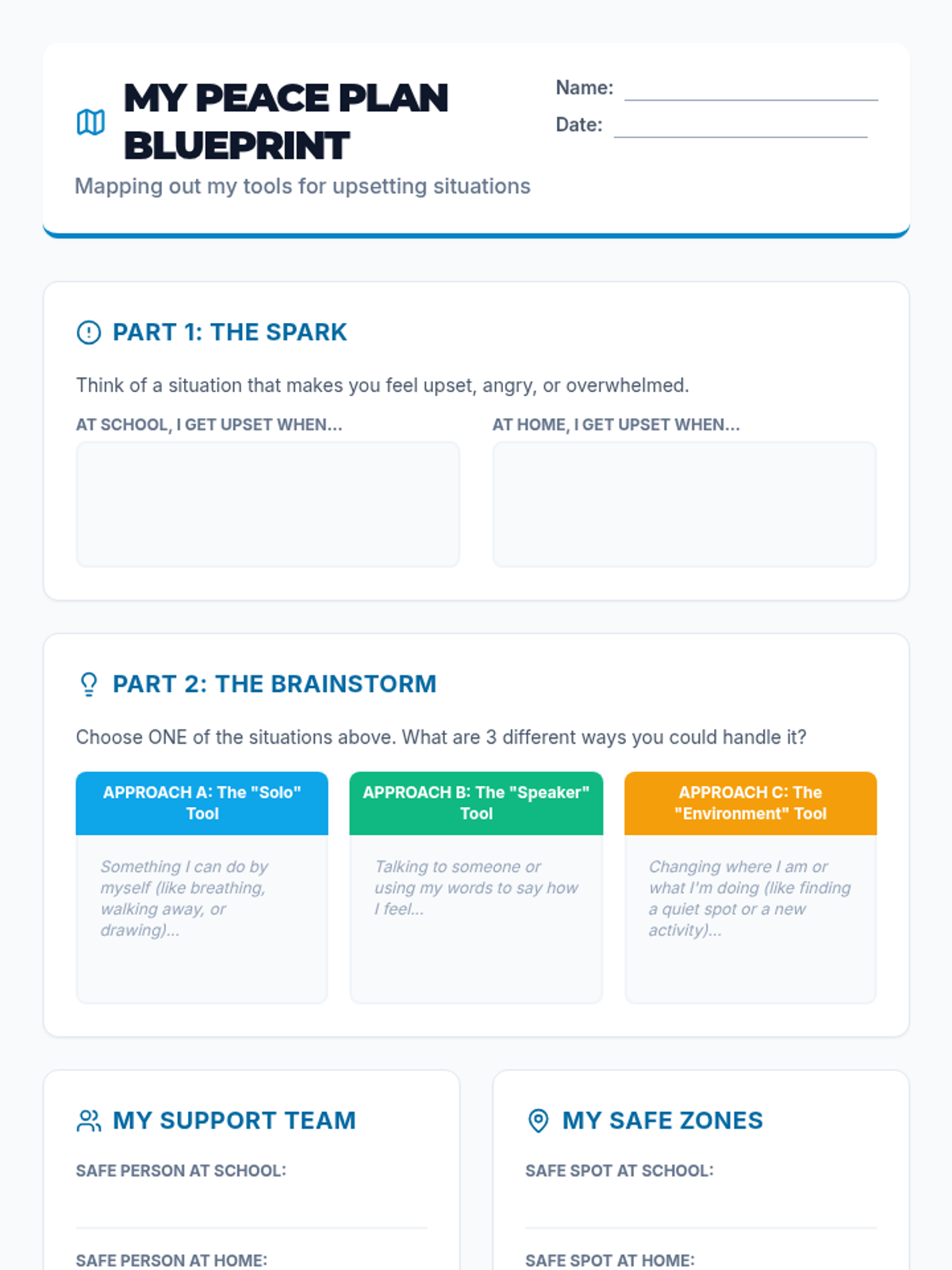 A lesson focused on helping students identify emotional triggers and brainstorm effective problem-solving strategies for upsetting situations at home and school. Students will create a personalized 'Peace Plan' blueprint to guide their reactions and resource-seeking.