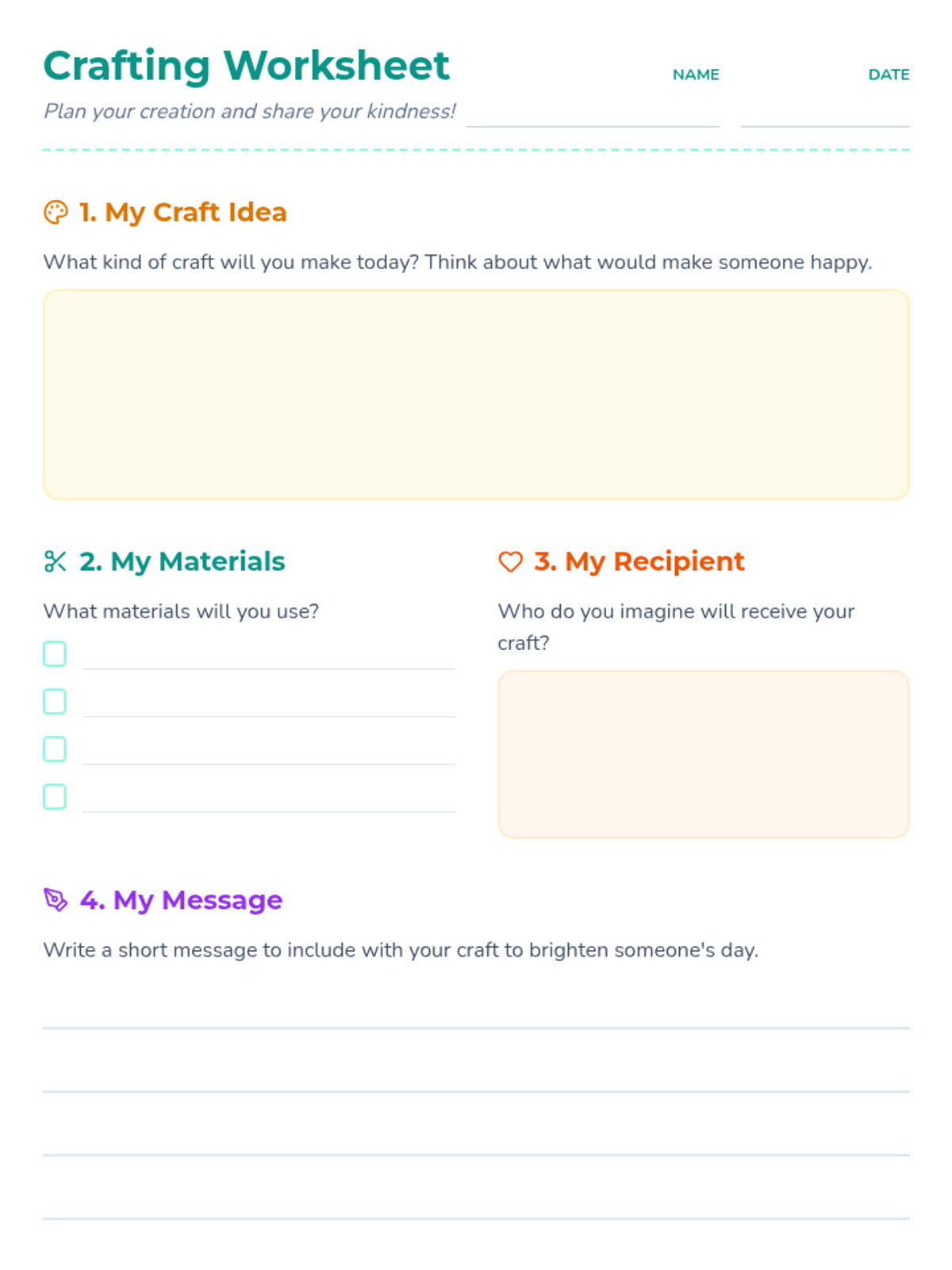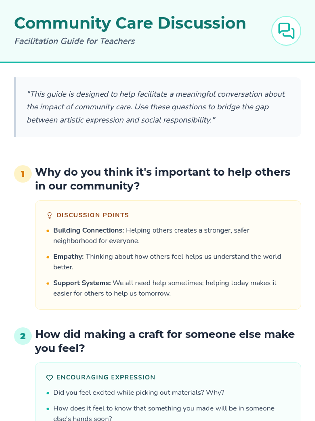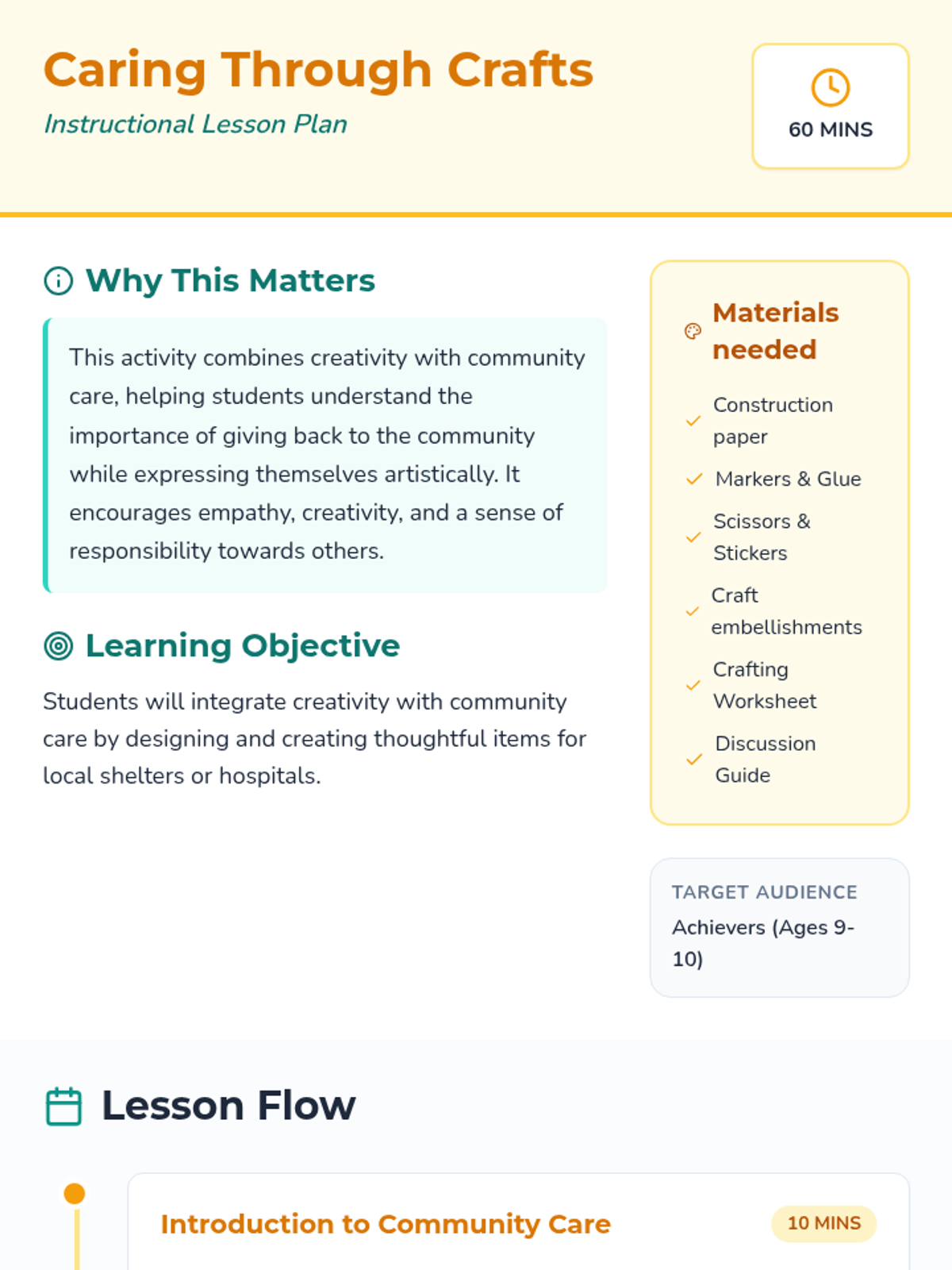 A lesson where students create thoughtful crafts for local shelters or hospitals, exploring empathy and community care through artistic expression.