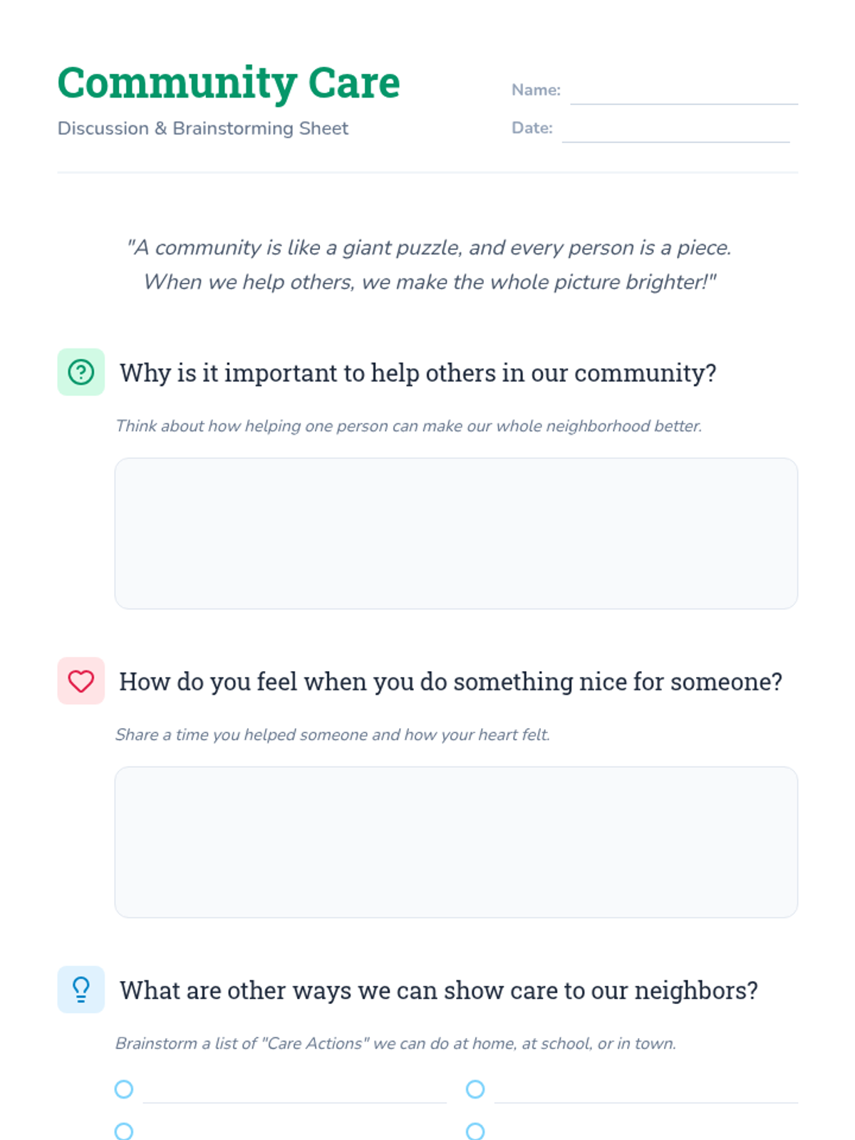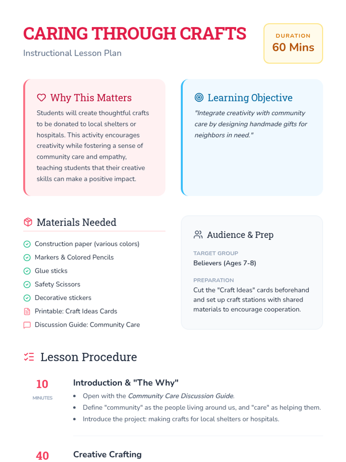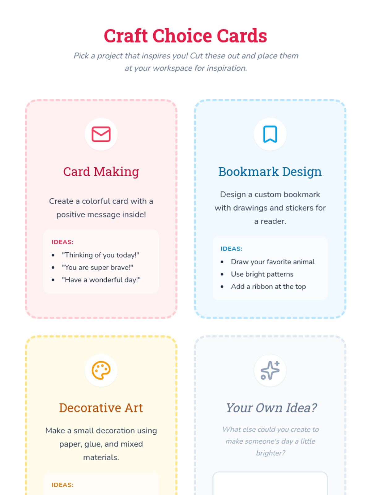 A heartfelt lesson where students create handmade crafts like cards and bookmarks to donate to local shelters and hospitals, fostering empathy and community care.