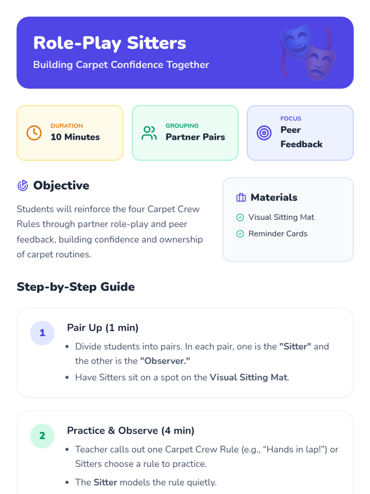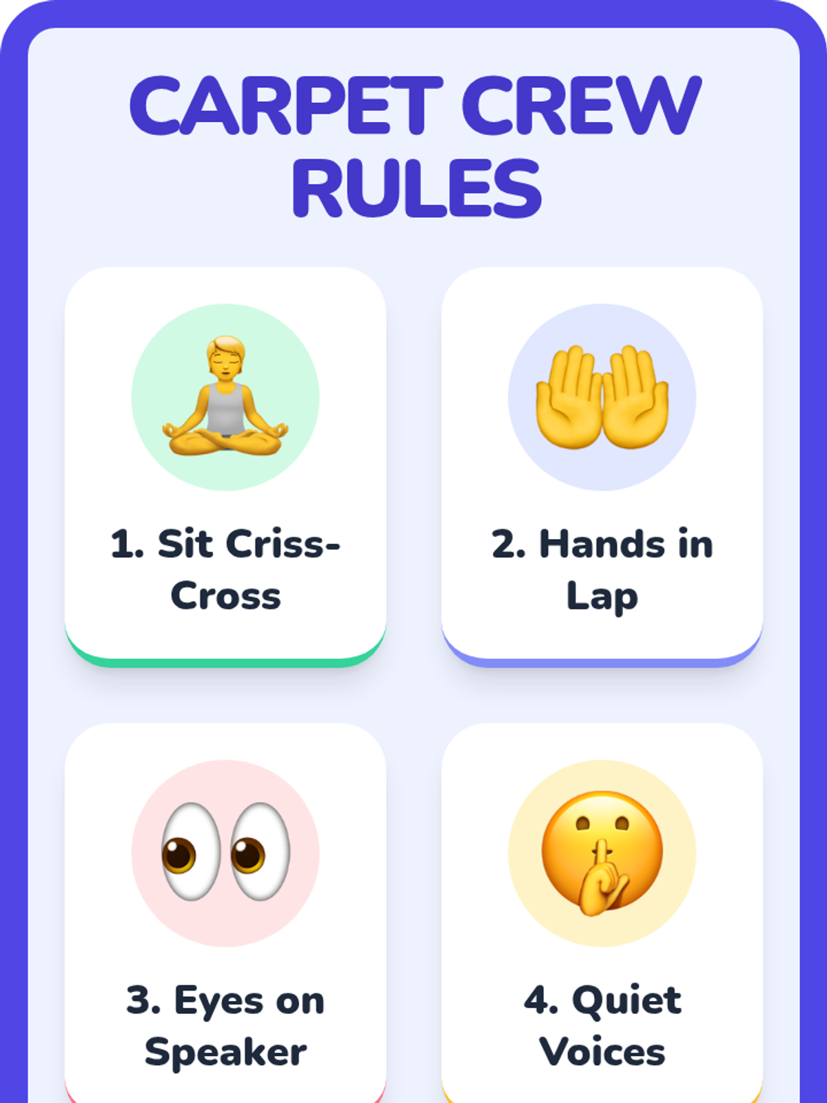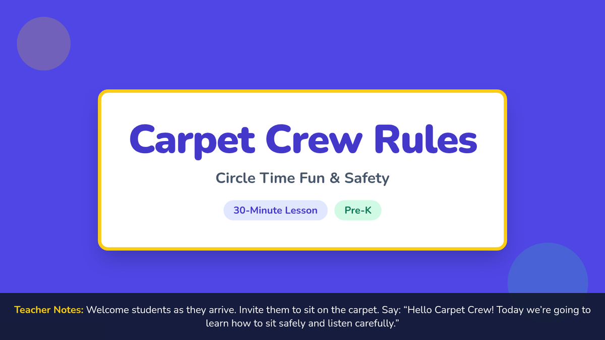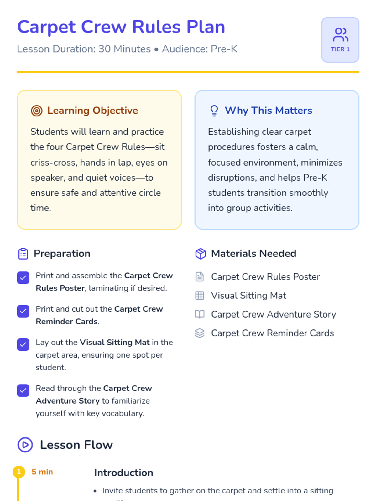A 30-minute Pre-K lesson focused on establishing and practicing carpet sitting procedures through stories, modeling, and interactive play. Students learn to sit criss-cross, keep hands in laps, eyes on the speaker, and use quiet voices.