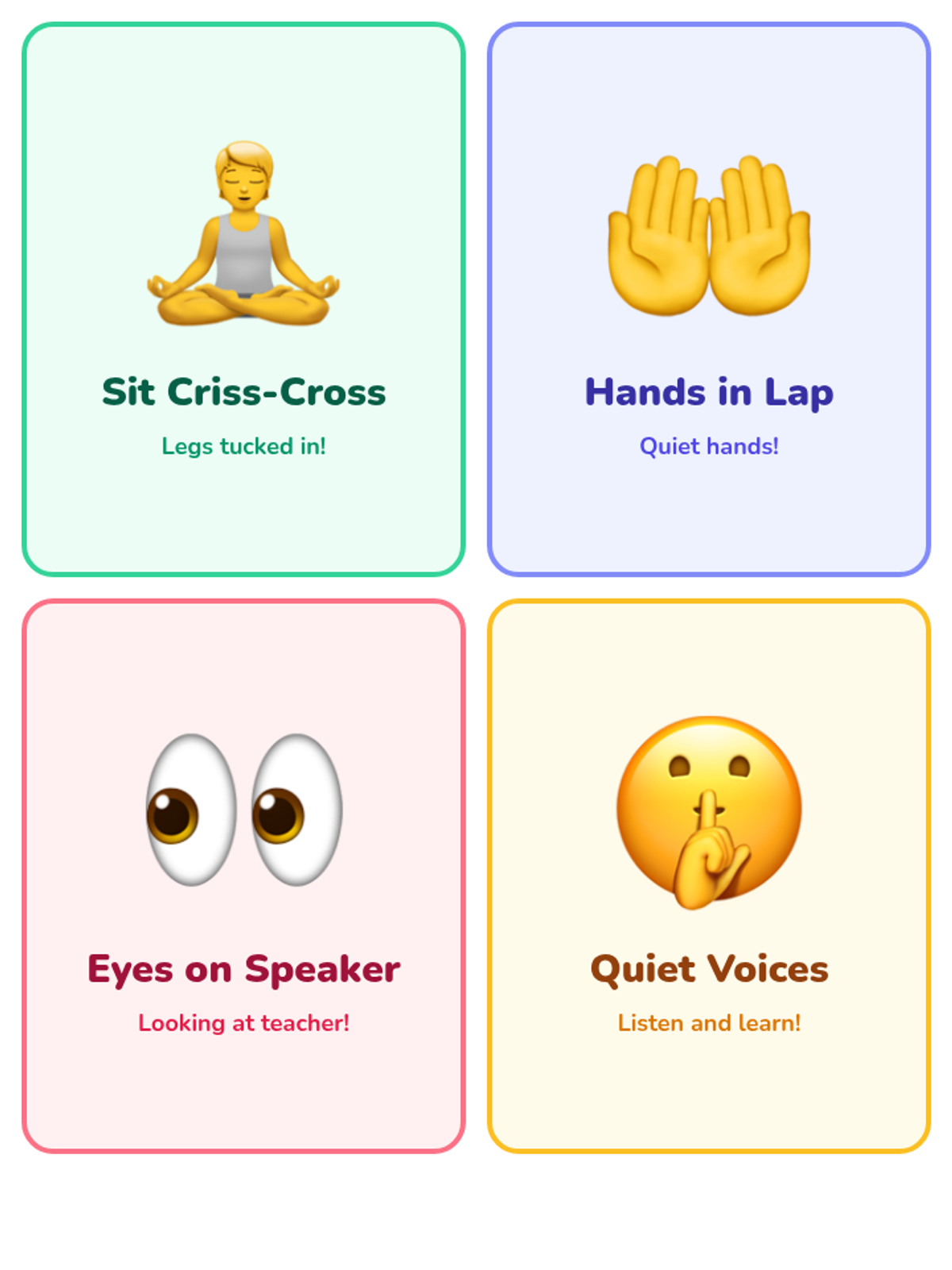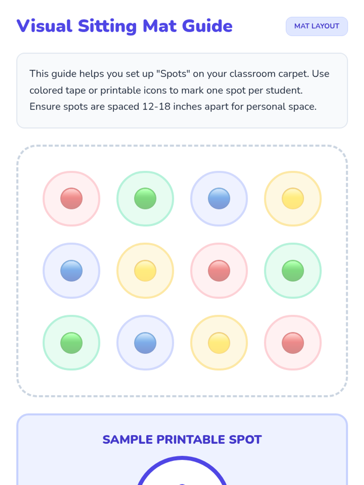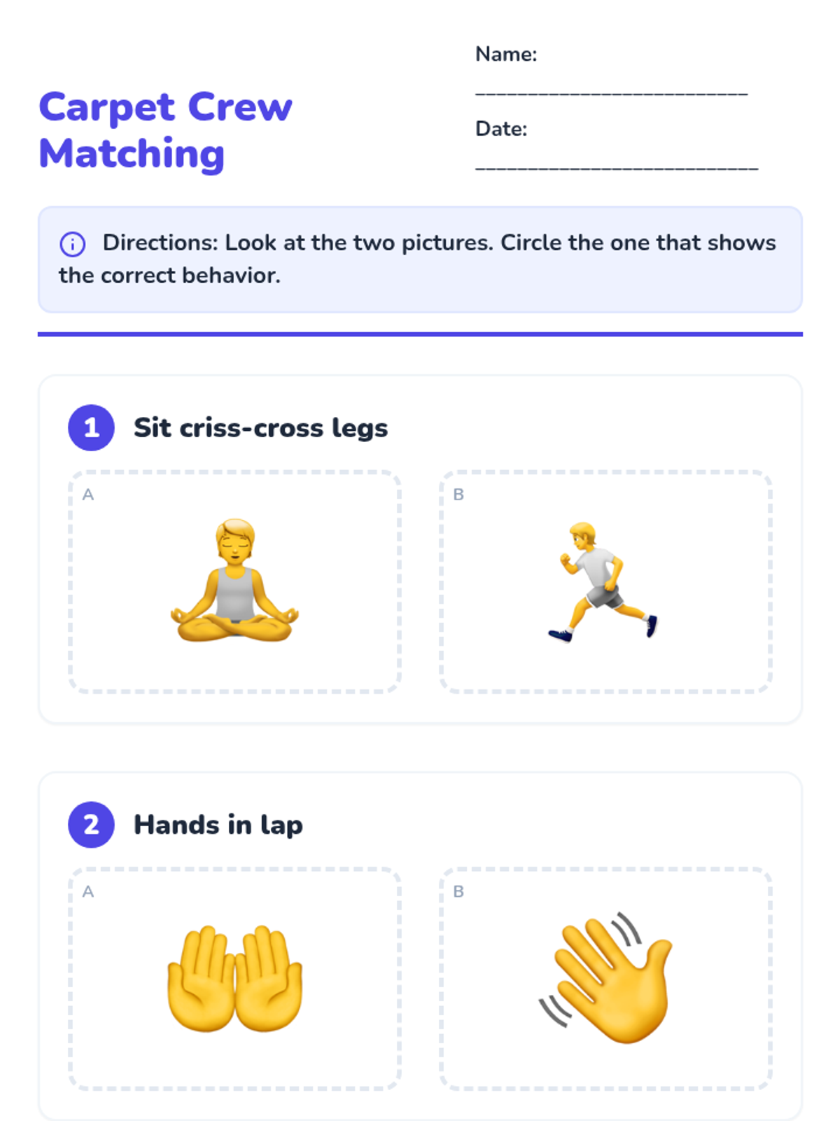 A 30-minute Pre-K lesson focused on establishing and practicing carpet sitting procedures through stories, modeling, and interactive play. Students learn to sit criss-cross, keep hands in laps, eyes on the speaker, and use quiet voices.