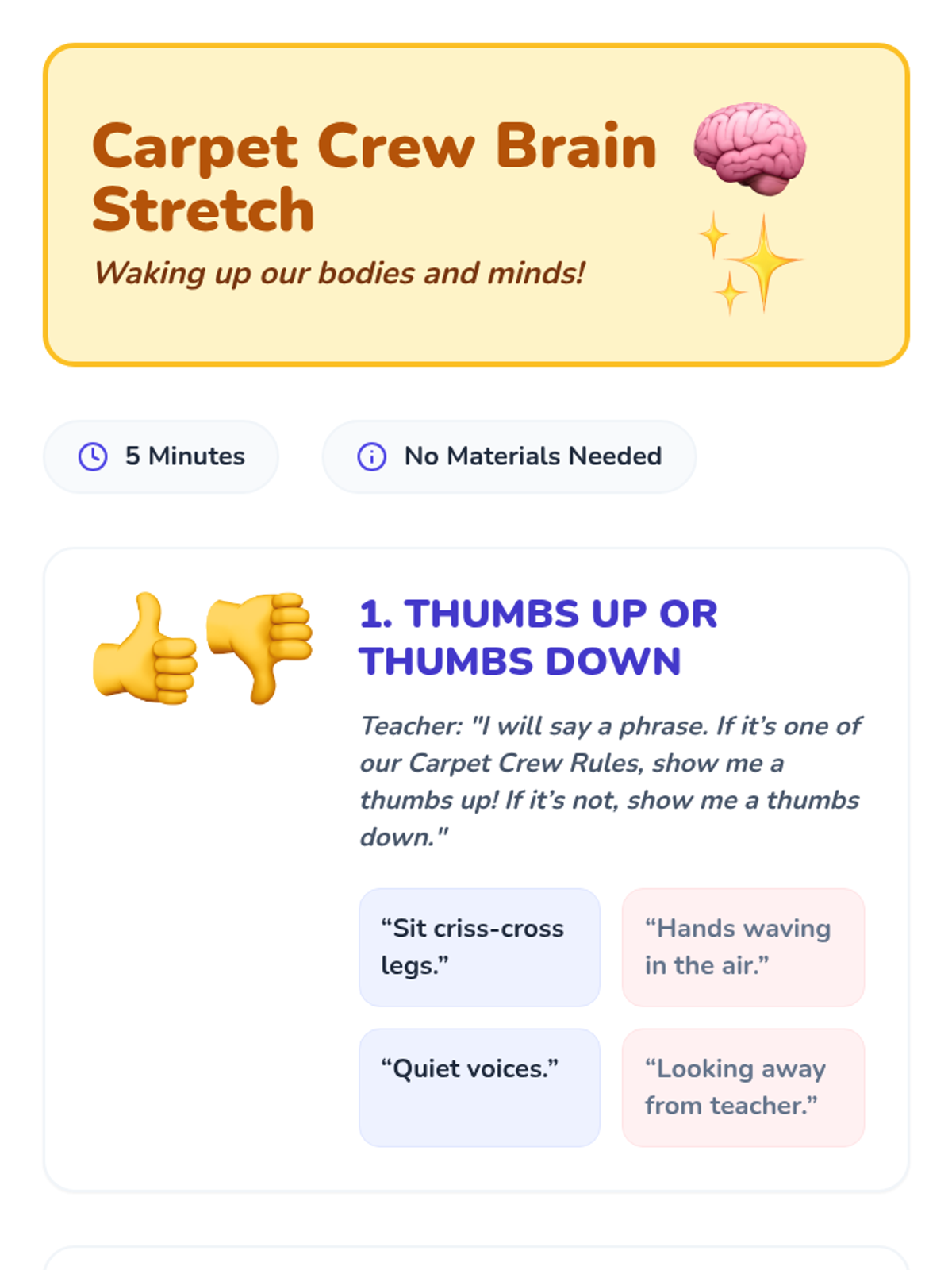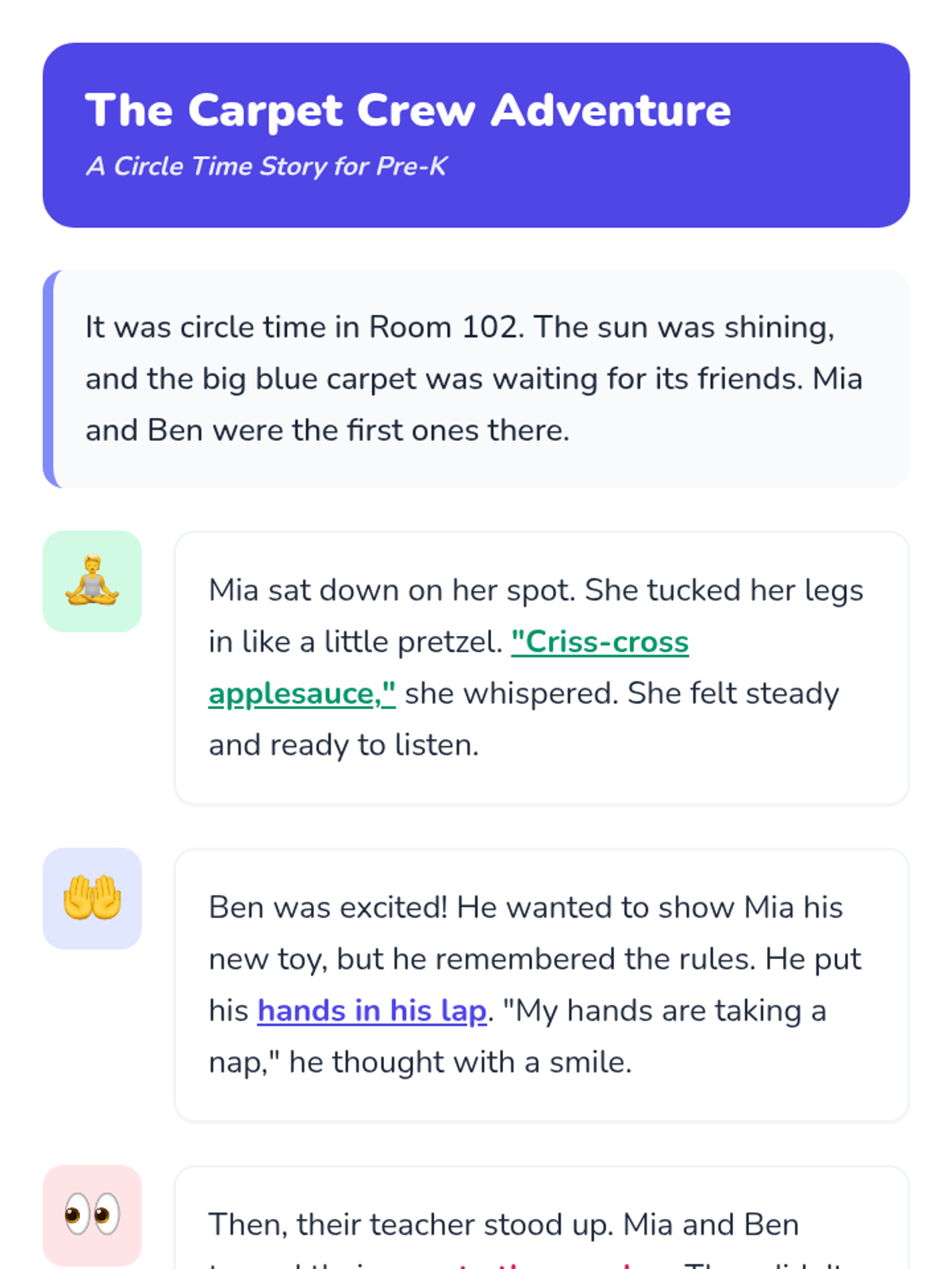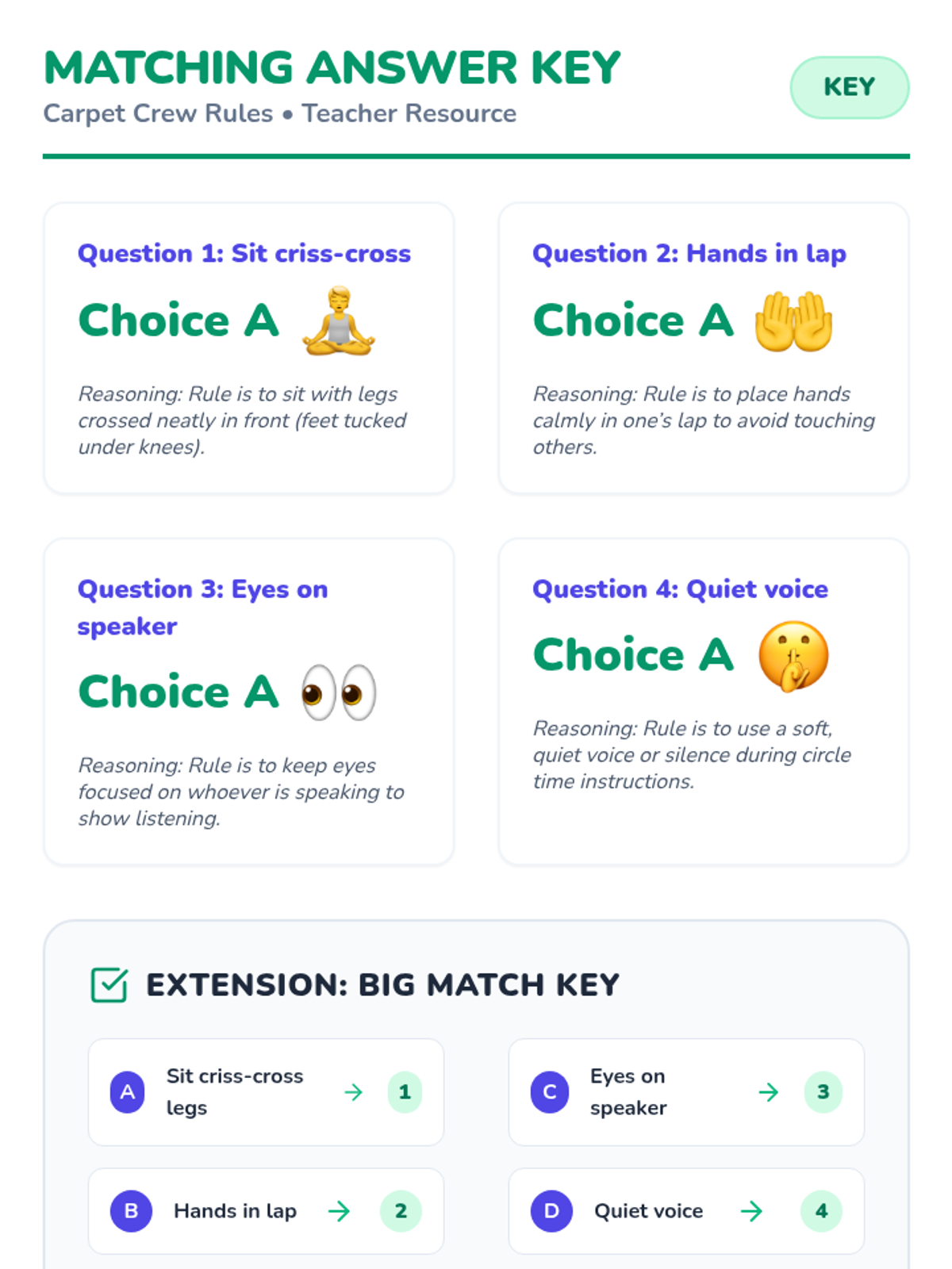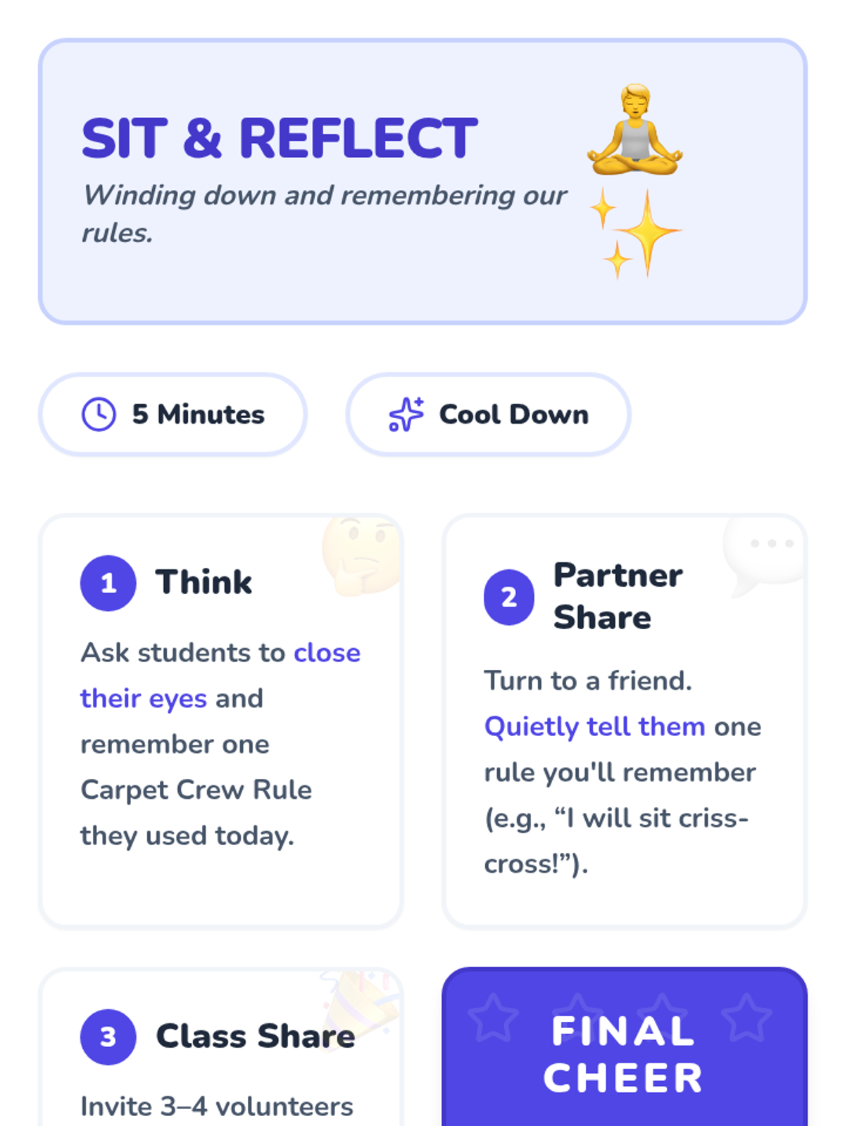 A 30-minute Pre-K lesson focused on establishing and practicing carpet sitting procedures through stories, modeling, and interactive play. Students learn to sit criss-cross, keep hands in laps, eyes on the speaker, and use quiet voices.