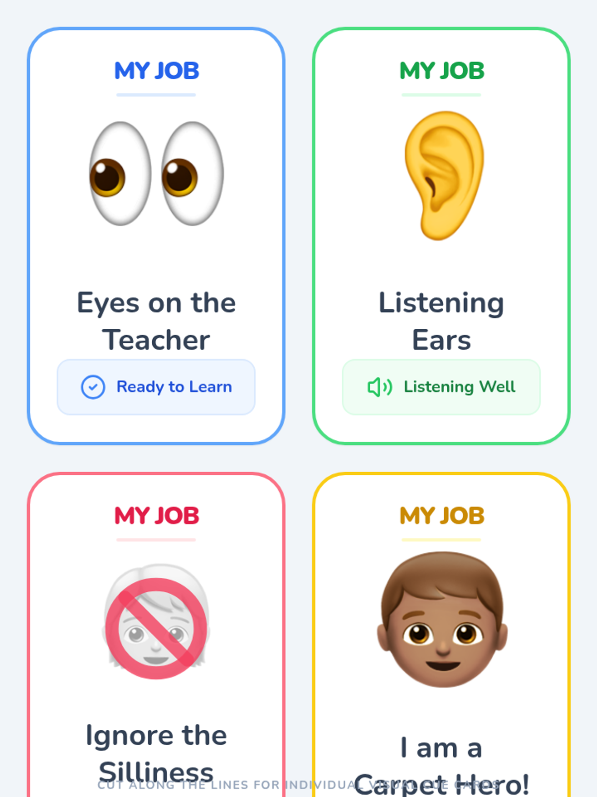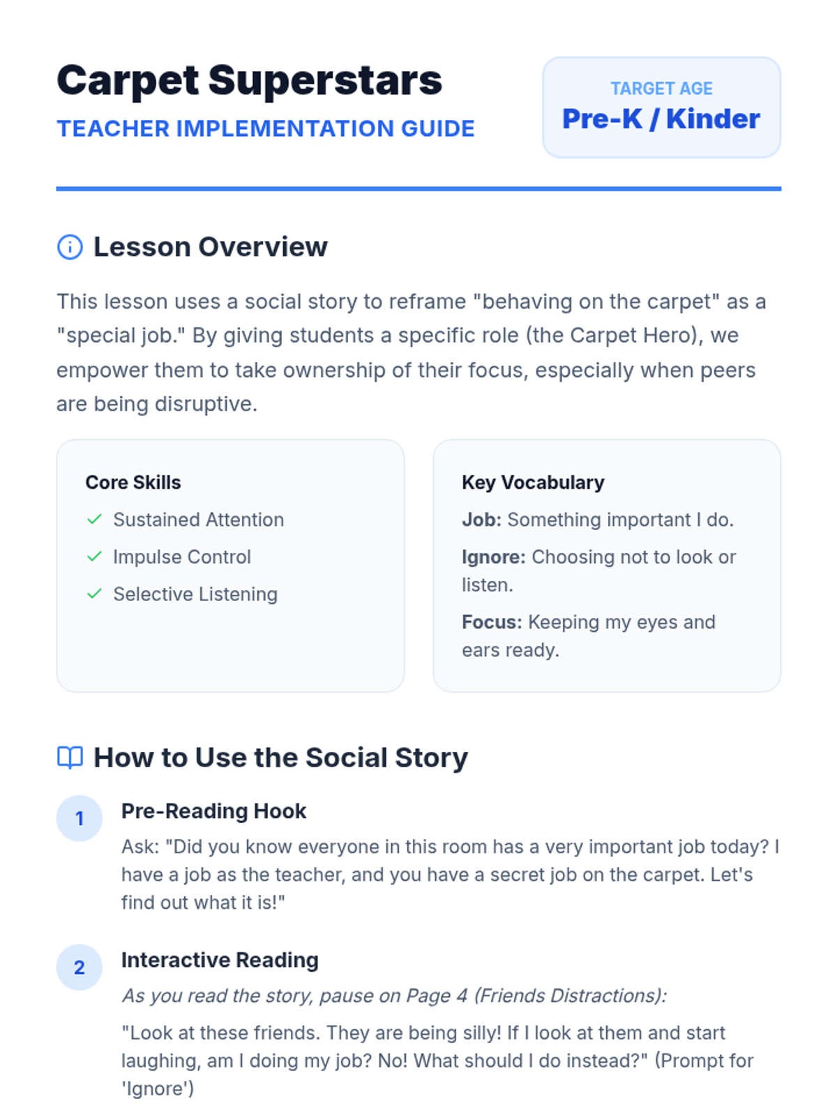 This lesson helps preschool students learn expected behaviors during carpet time through a personalized social story and visual aids, focusing on paying attention to the teacher and managing distractions from peers.