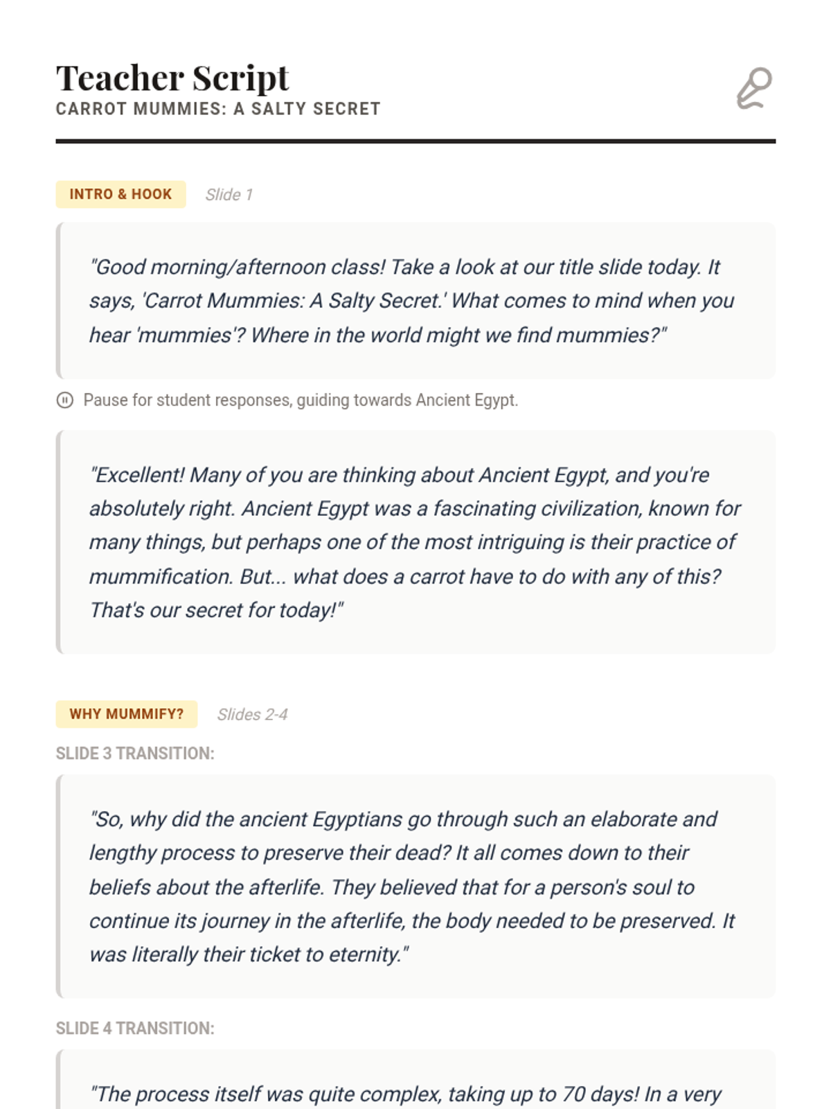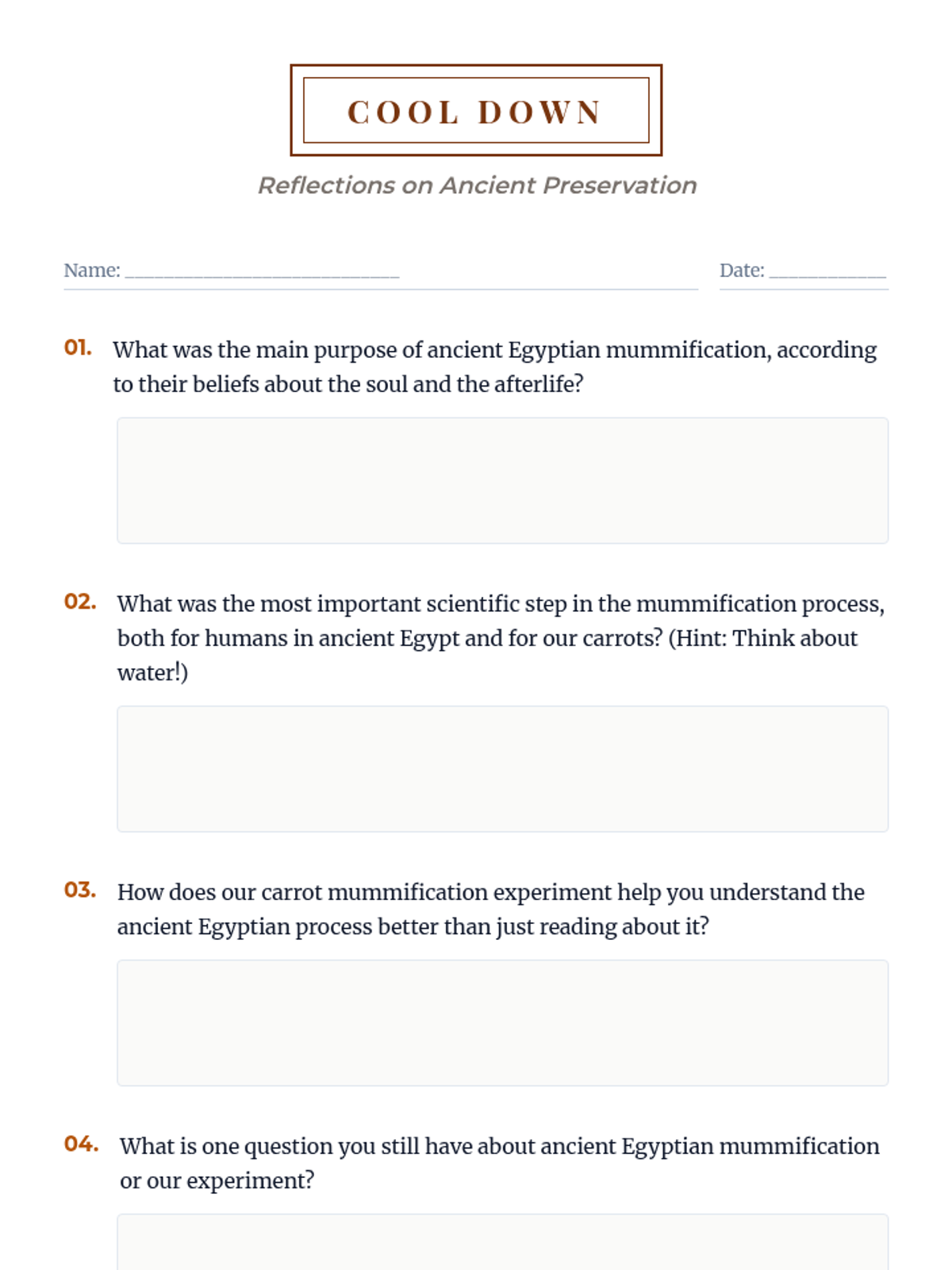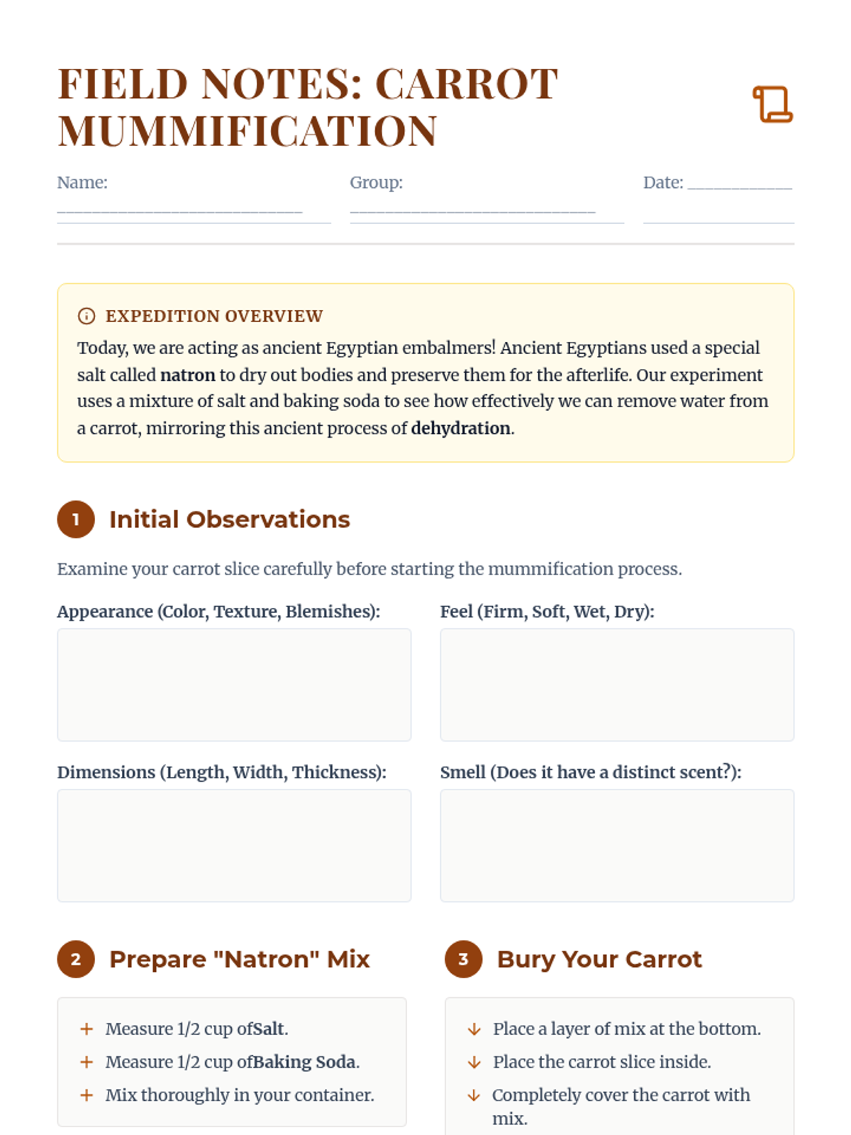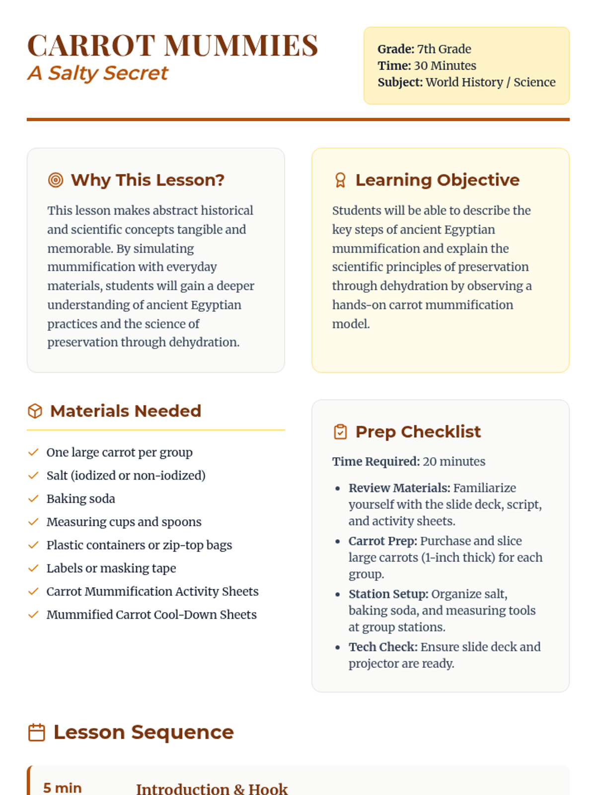A 30-minute hands-on lesson for 7th-grade students exploring the science of mummification and dehydration through a carrot model. Students learn about ancient Egyptian preservation techniques and the role of natron in preventing decay.