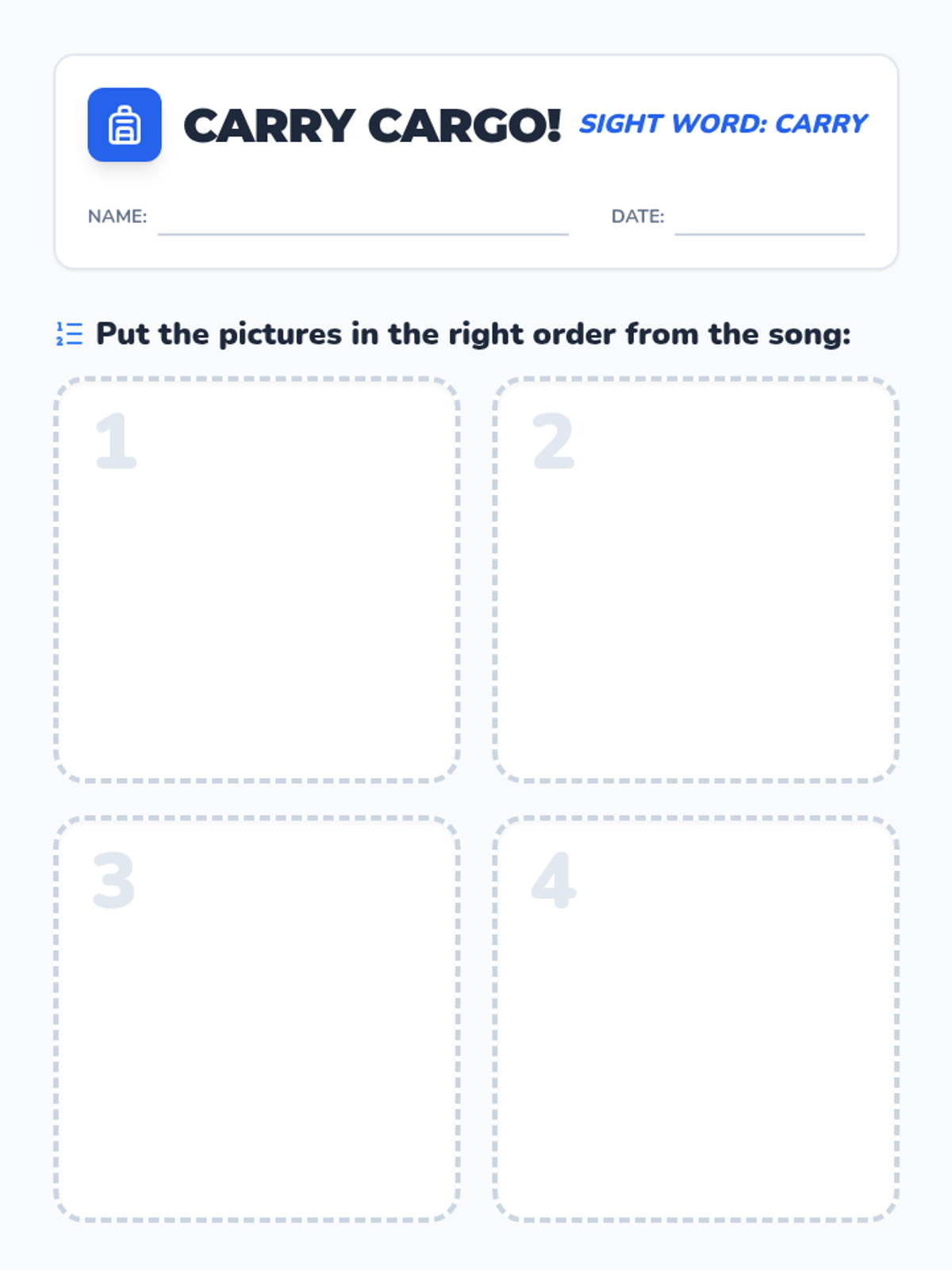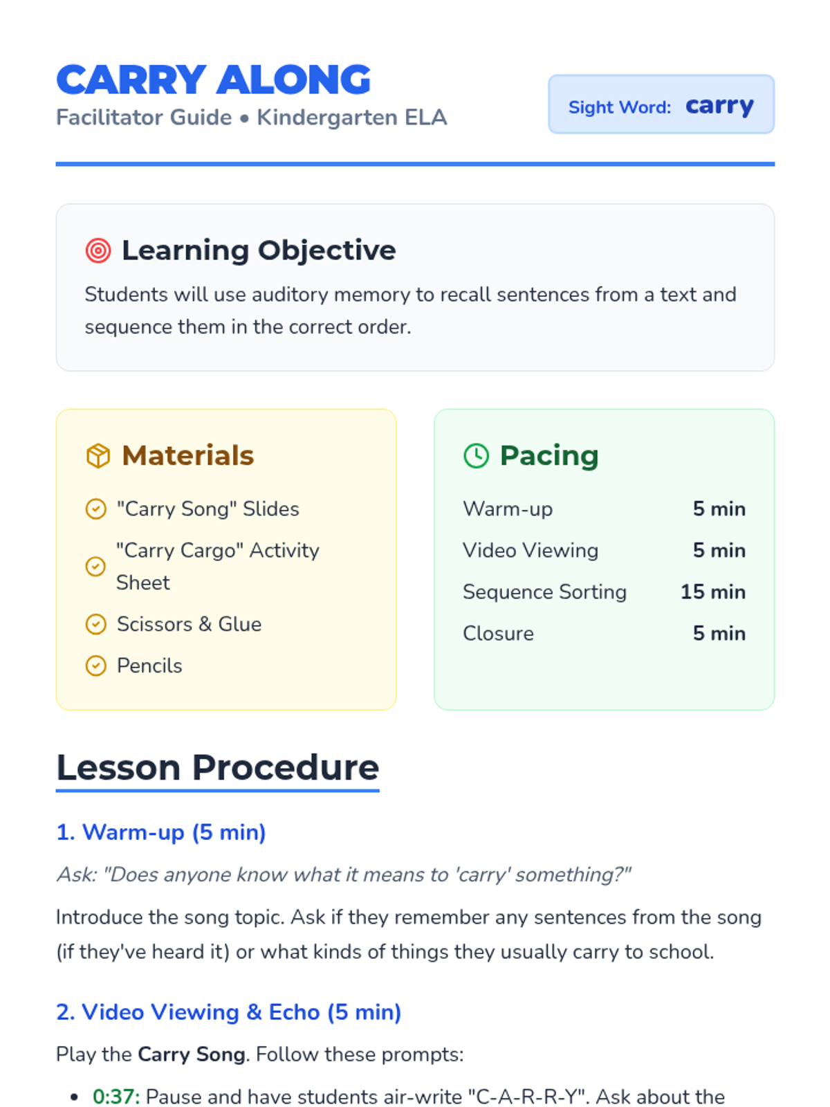 A Kindergarten lesson focused on auditory memory and the sight word 'carry' through a catchy song, repetitive practice, and a sequence sorting activity.