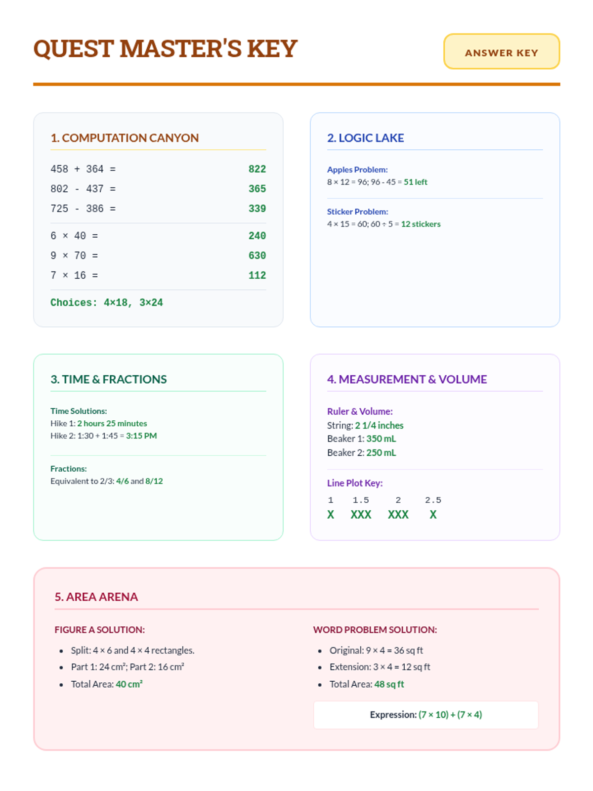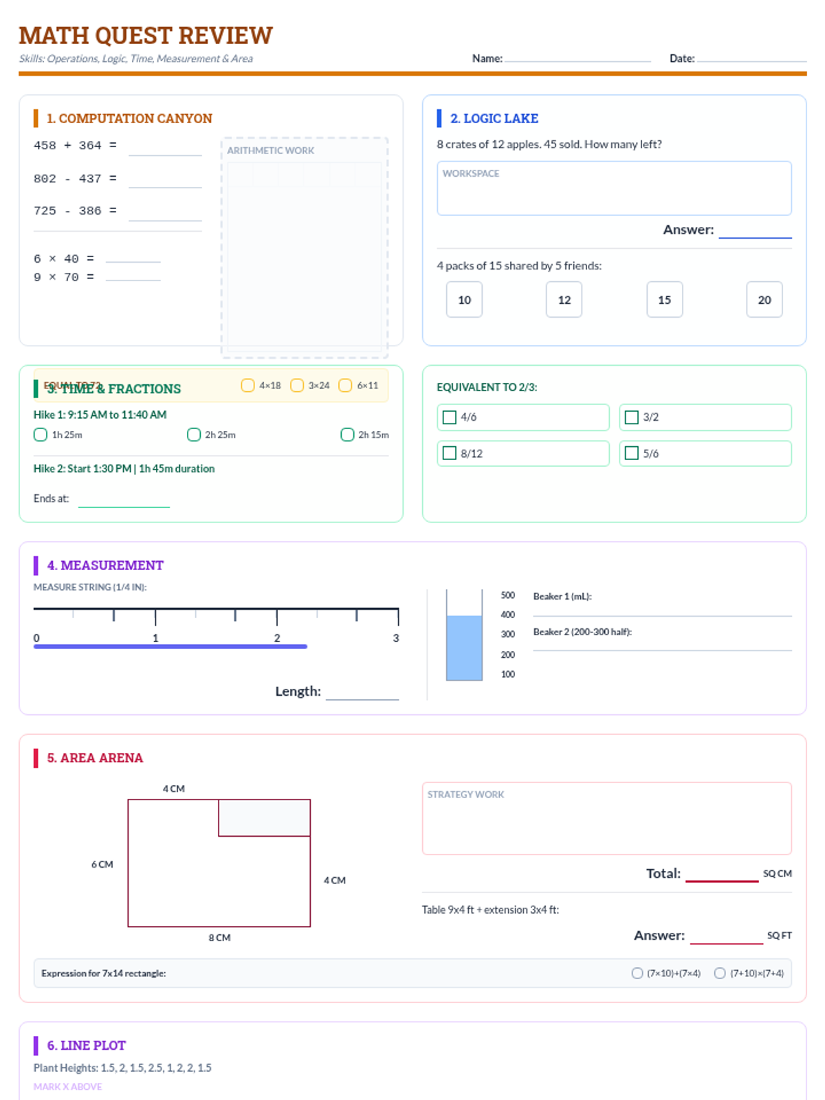 A comprehensive review of key 3rd/4th grade math skills including multi-step problems, measurement, fractions, and geometry.