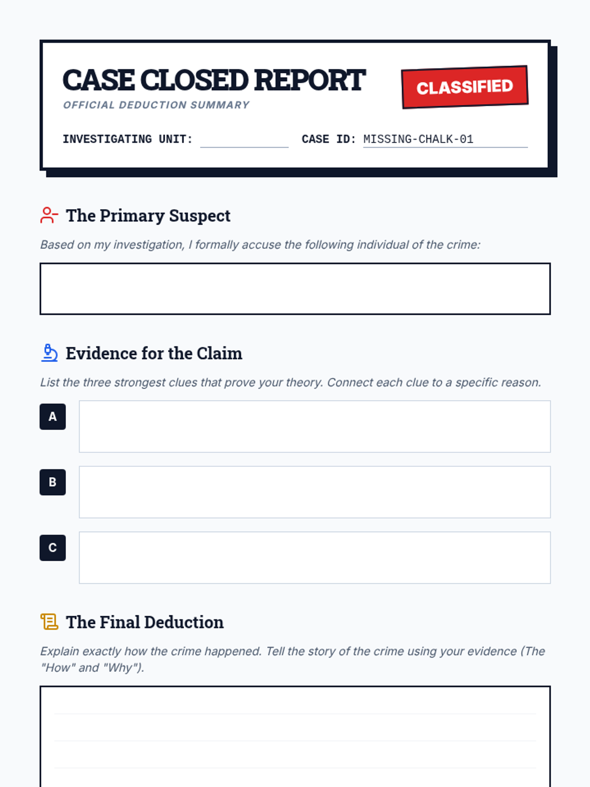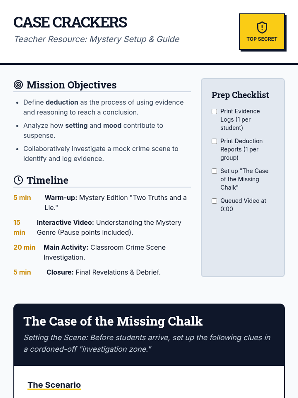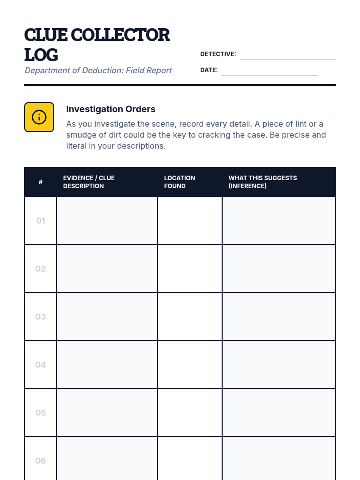 Students will master the art of deduction by analyzing visual and textual evidence through a mystery-themed video and a hands-on mock crime scene investigation.