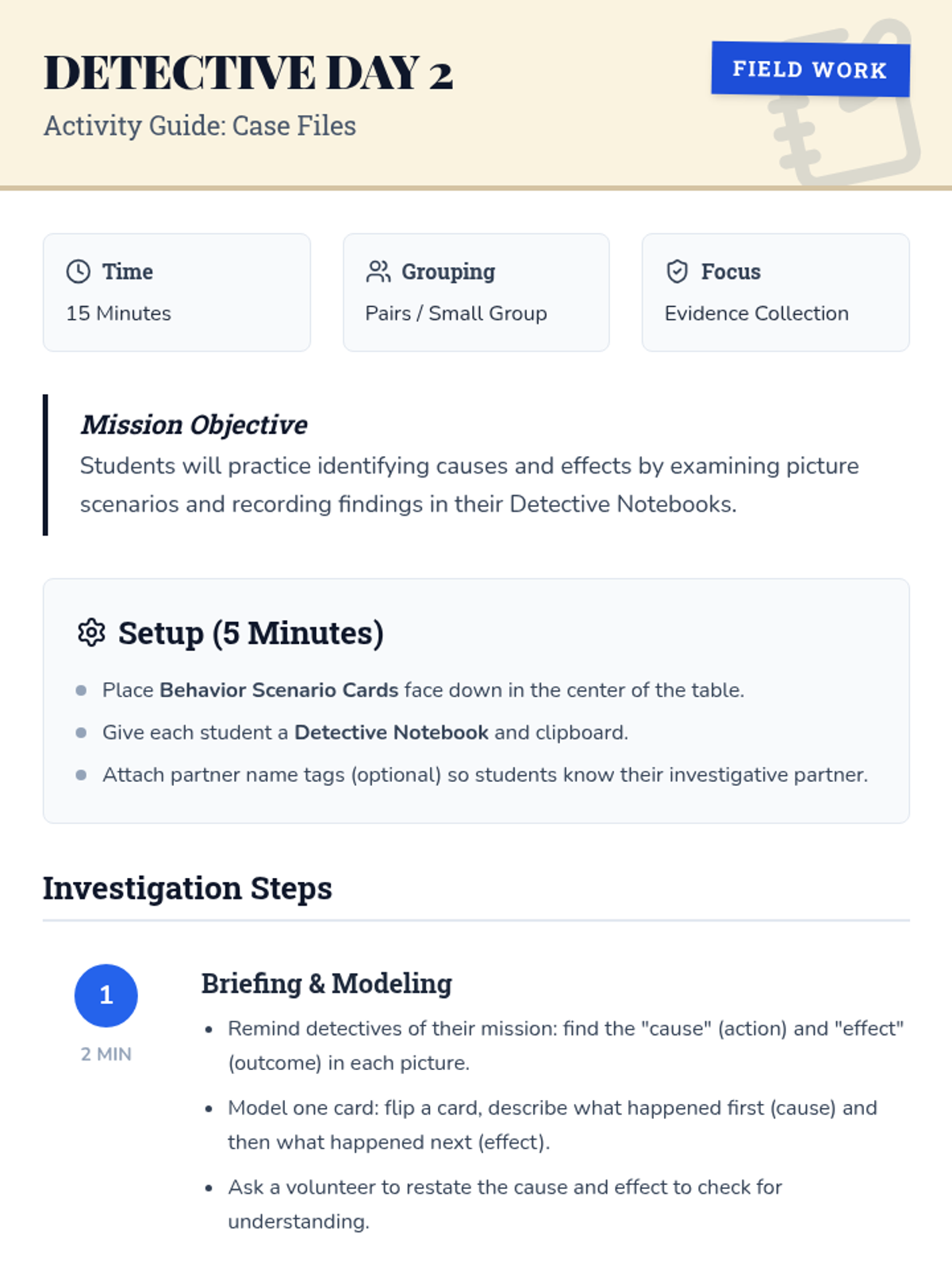 In the second session, students use their observation skills to investigate behavior scenarios in pairs. They record their findings in a "Detective Notebook," drawing or writing the causes and effects they discover.