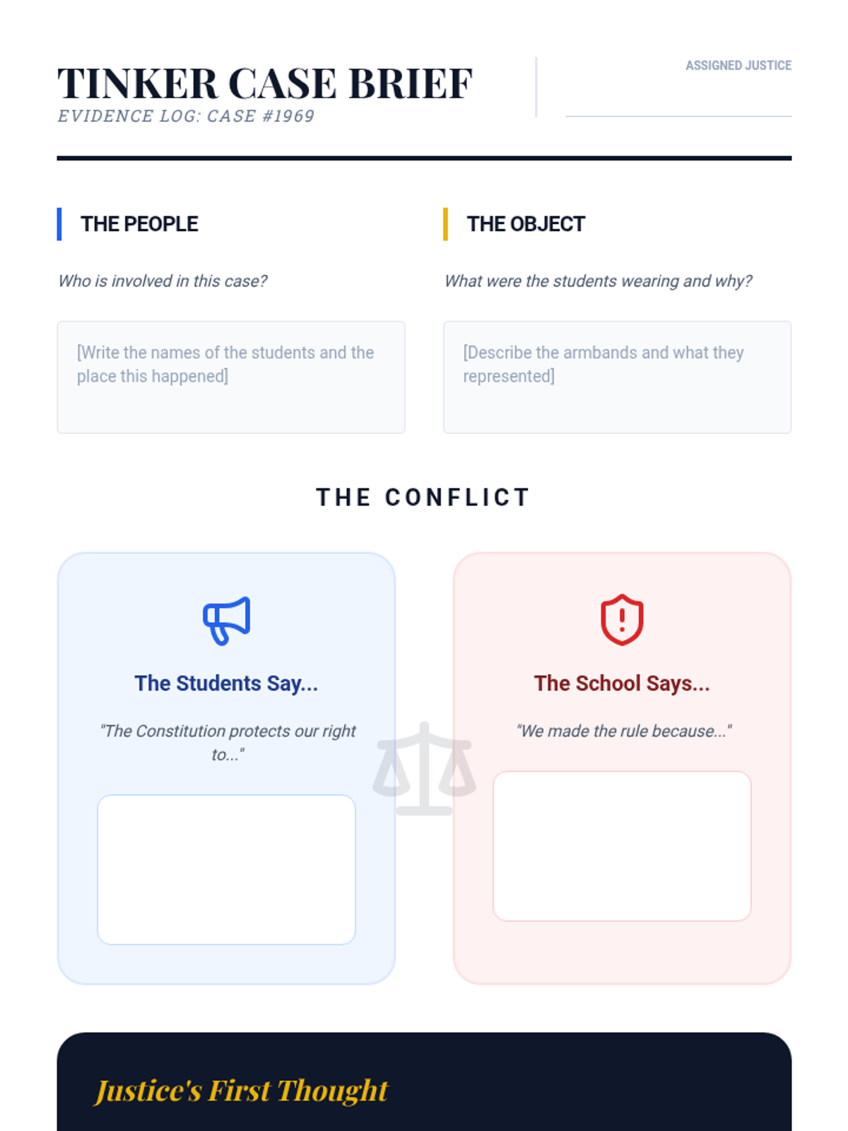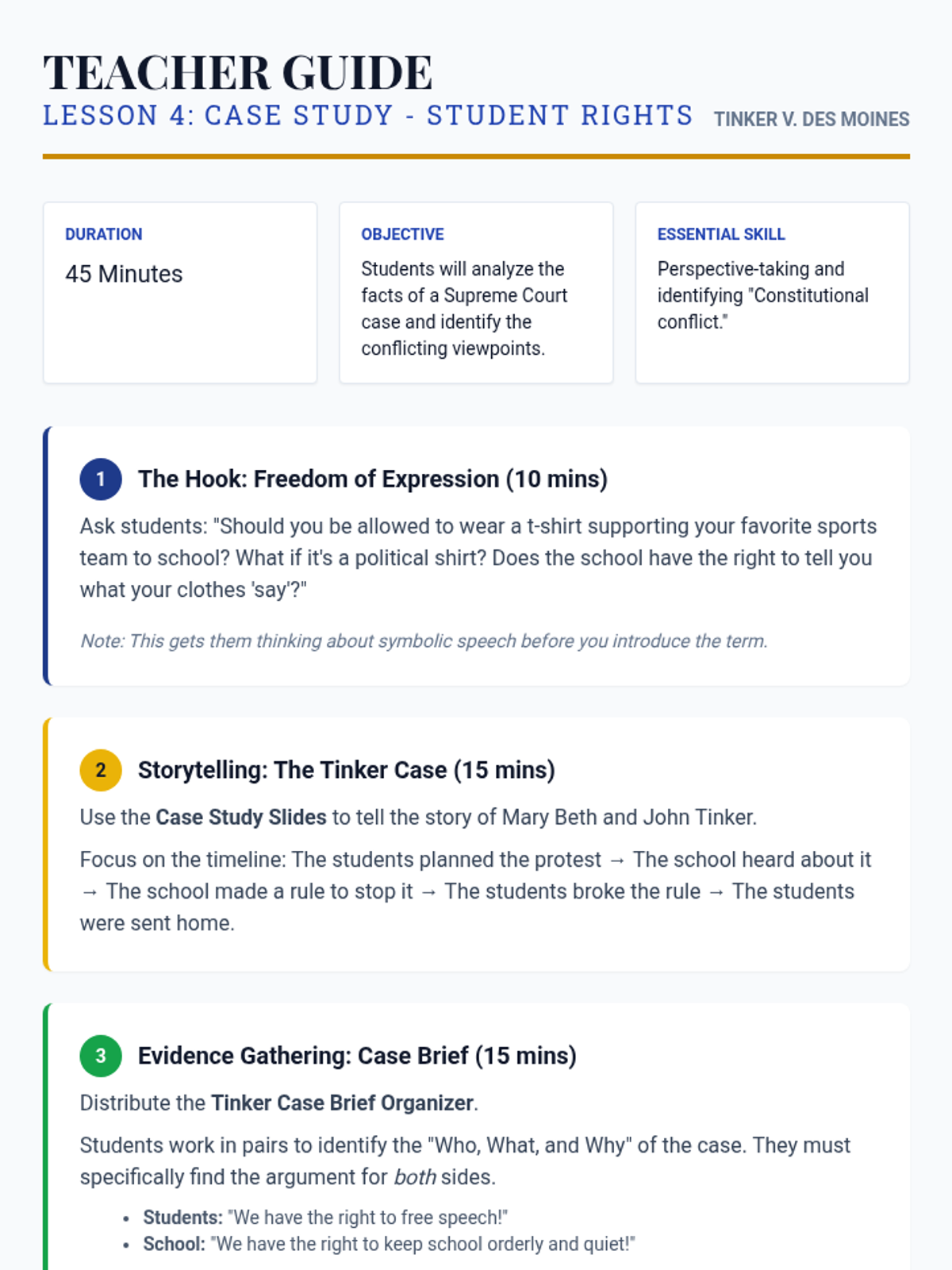 Students explore a simplified version of Tinker v. Des Moines to see how the Supreme Court protects student rights. They analyze whether a school rule about armbands violated the Constitution.