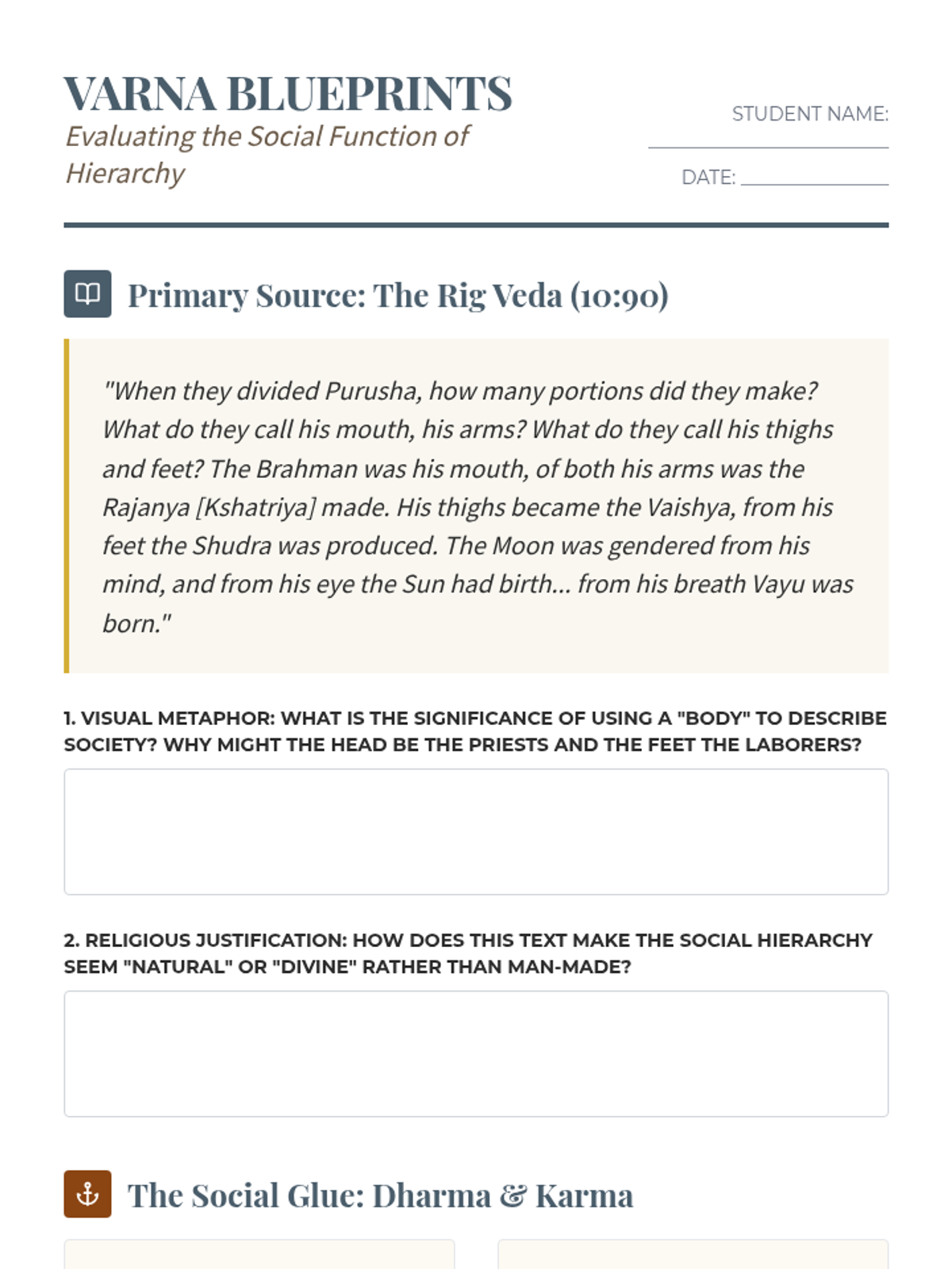 Students analyze the religious foundations of the Indian Varna system through the Rig Veda and explore how the concepts of Dharma and Karma reinforced social hierarchy and stability.