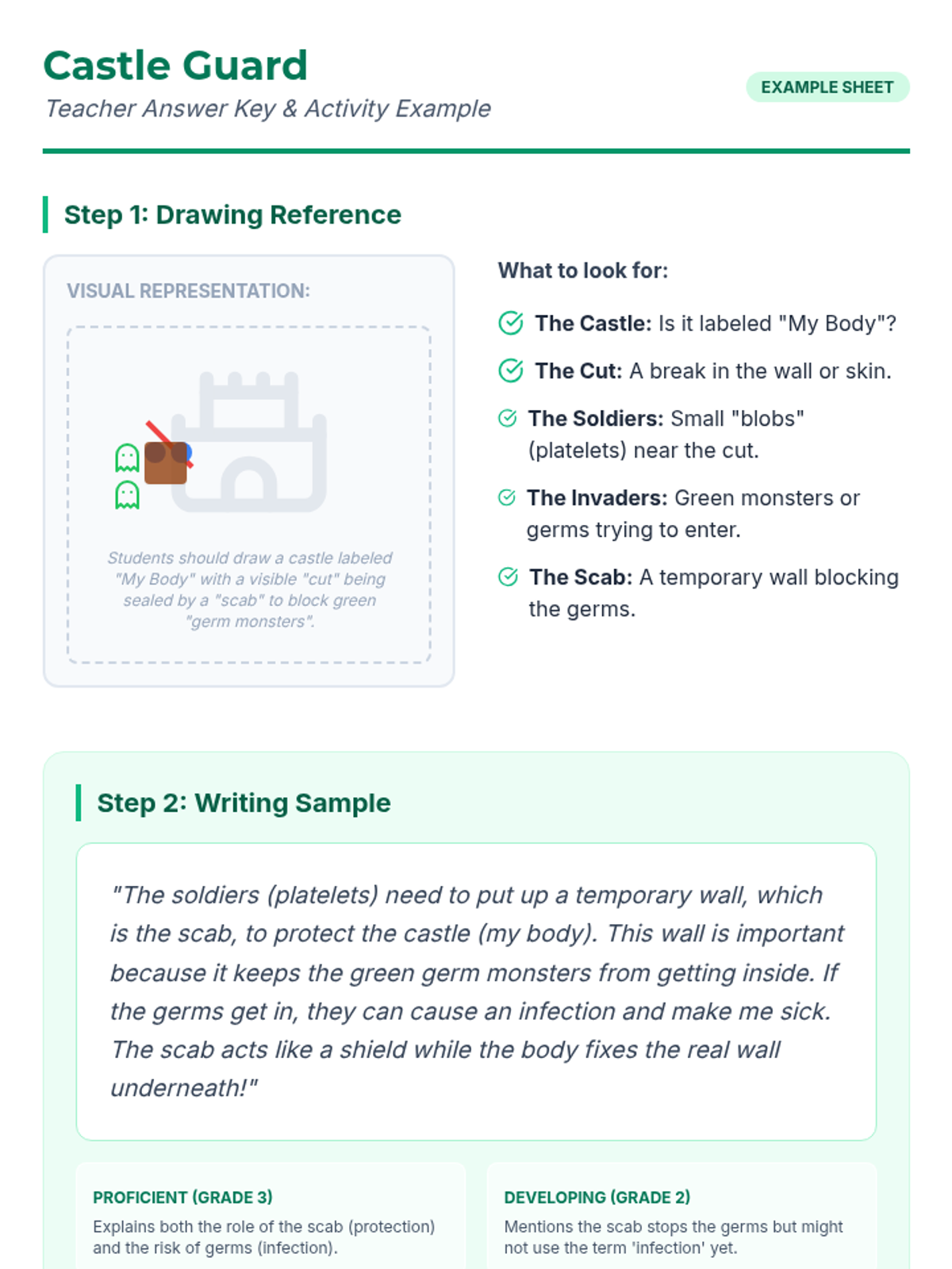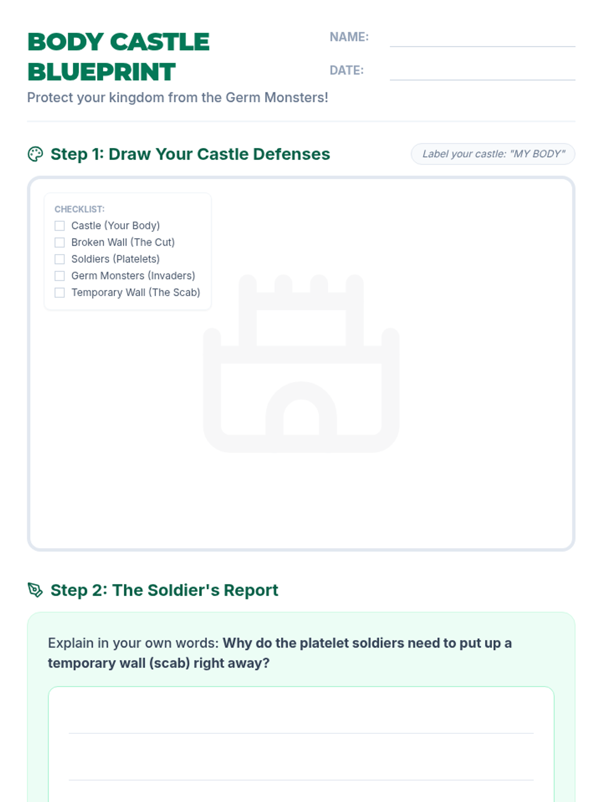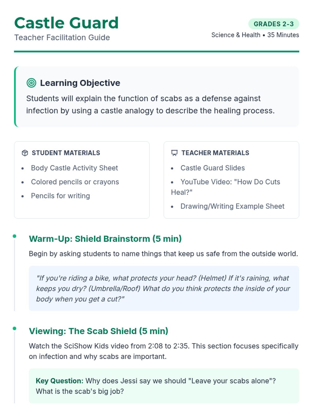 A lesson for 2nd and 3rd grade students explaining how scabs act as a defensive barrier against germs and infection using a 'Castle Defenses' analogy. Students will watch a video, draw their own 'Body Castle', and write about the protective role of platelets and scabs.