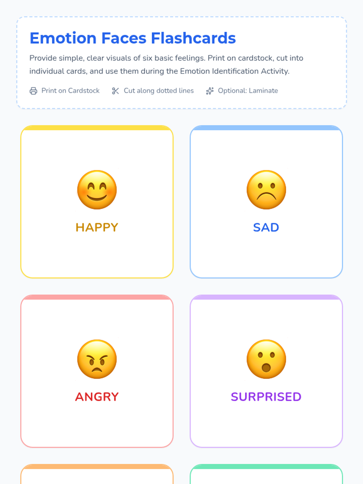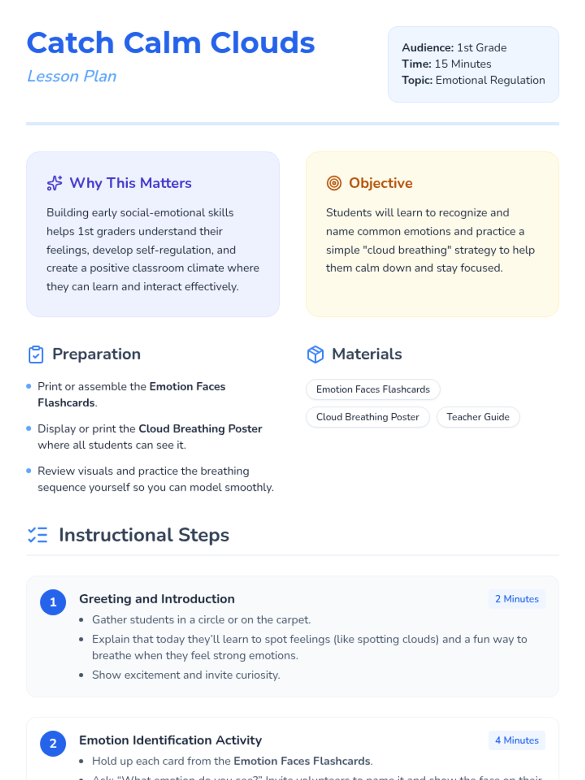 In this 15-minute introductory lesson, students learn to identify basic emotions using flashcards and practice a simple 'Cloud Breathing' technique to calm their bodies.