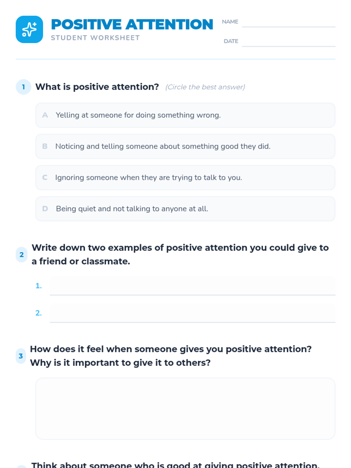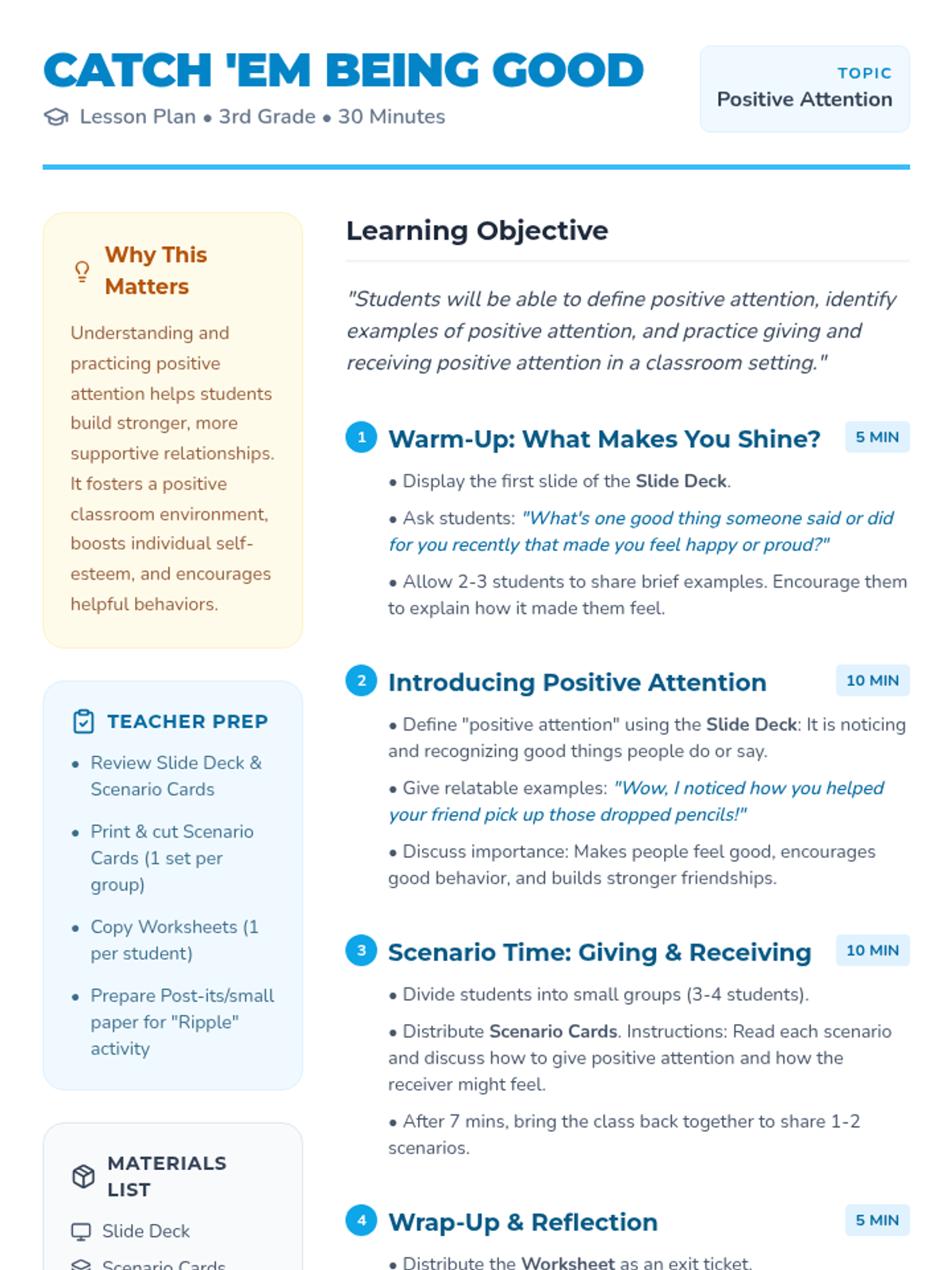 A 30-minute lesson for 3rd graders on the power of positive attention, teaching students how to notice and recognize the good things others do to build a supportive classroom community.