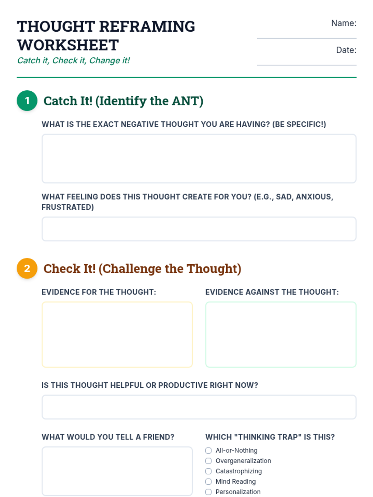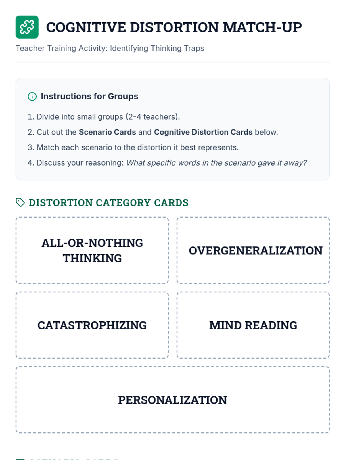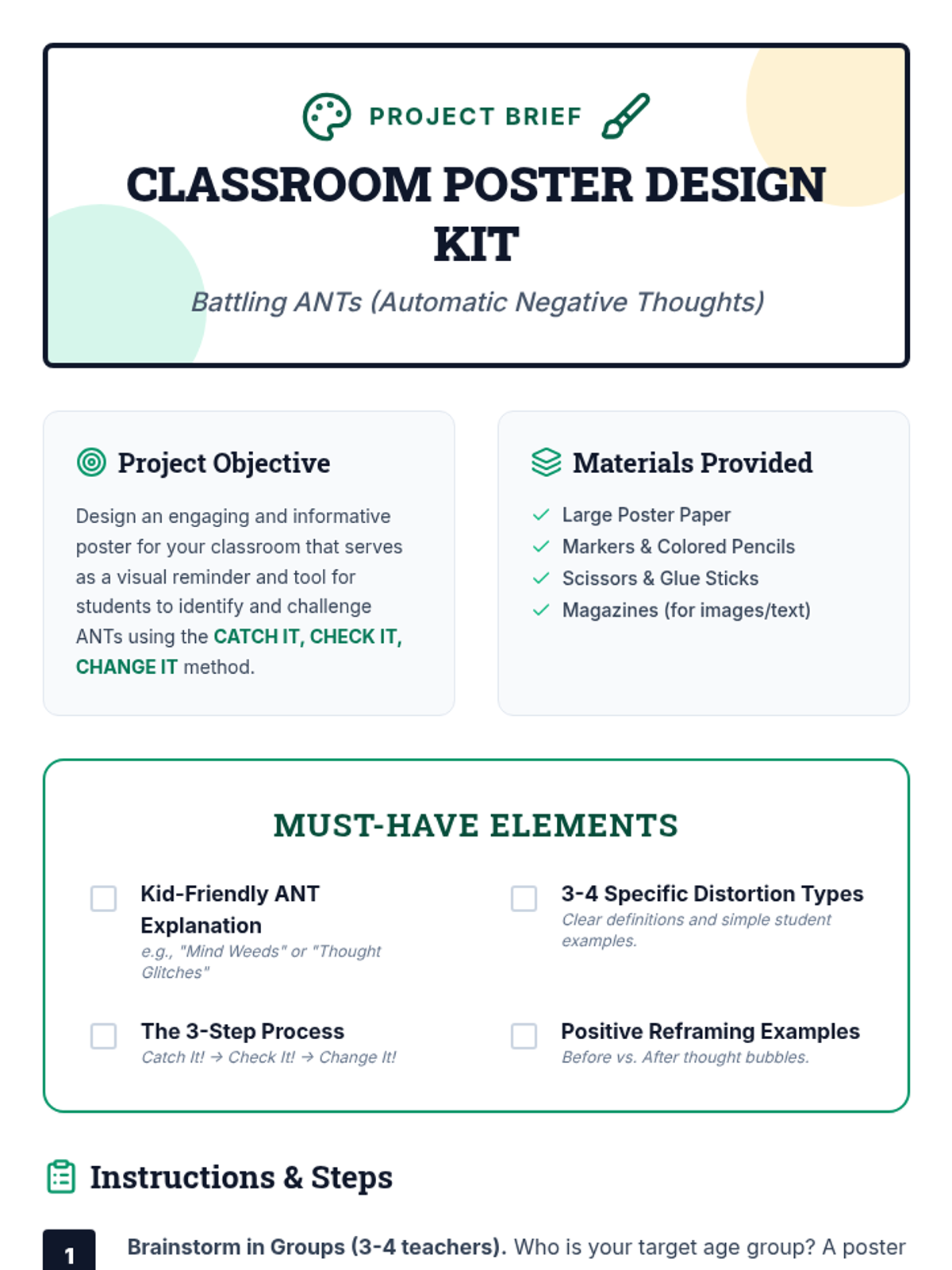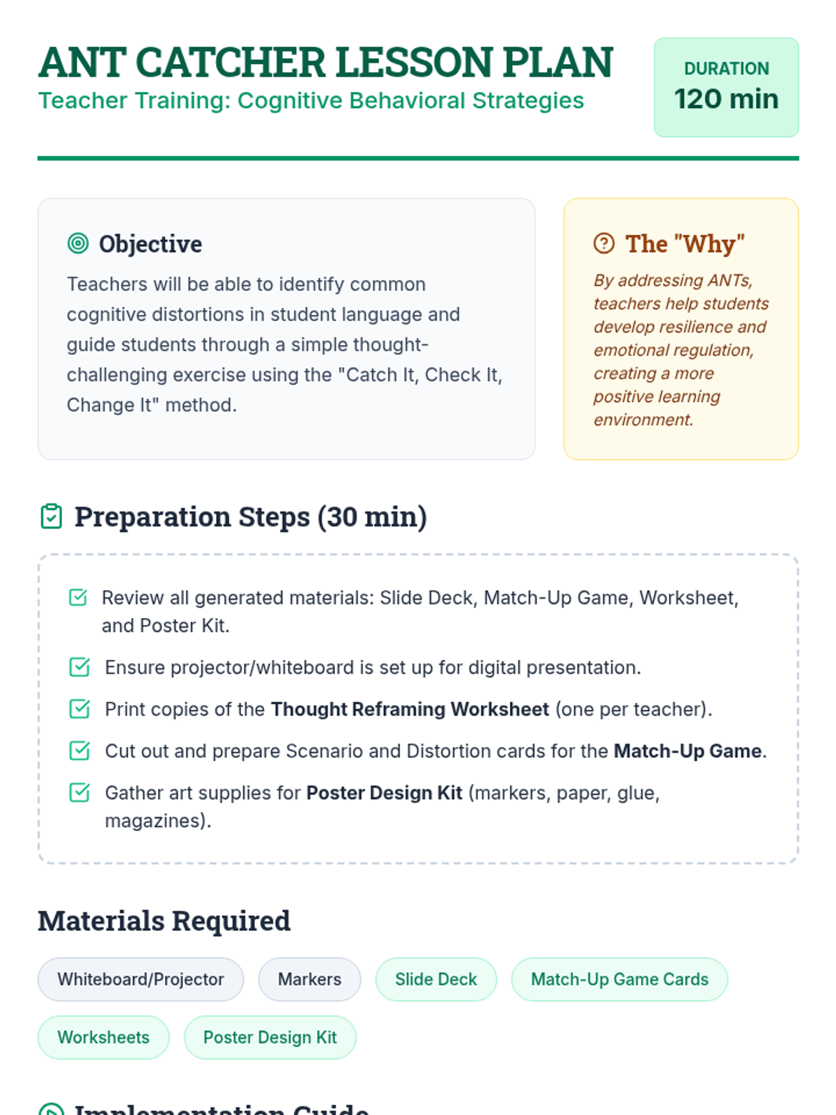 This 120-minute teacher training session equips educators with strategies to identify and address Automatic Negative Thoughts (ANTs). Teachers will learn about cognitive distortions and the 'Catch It, Check It, Change It' method to foster resilience in their students.