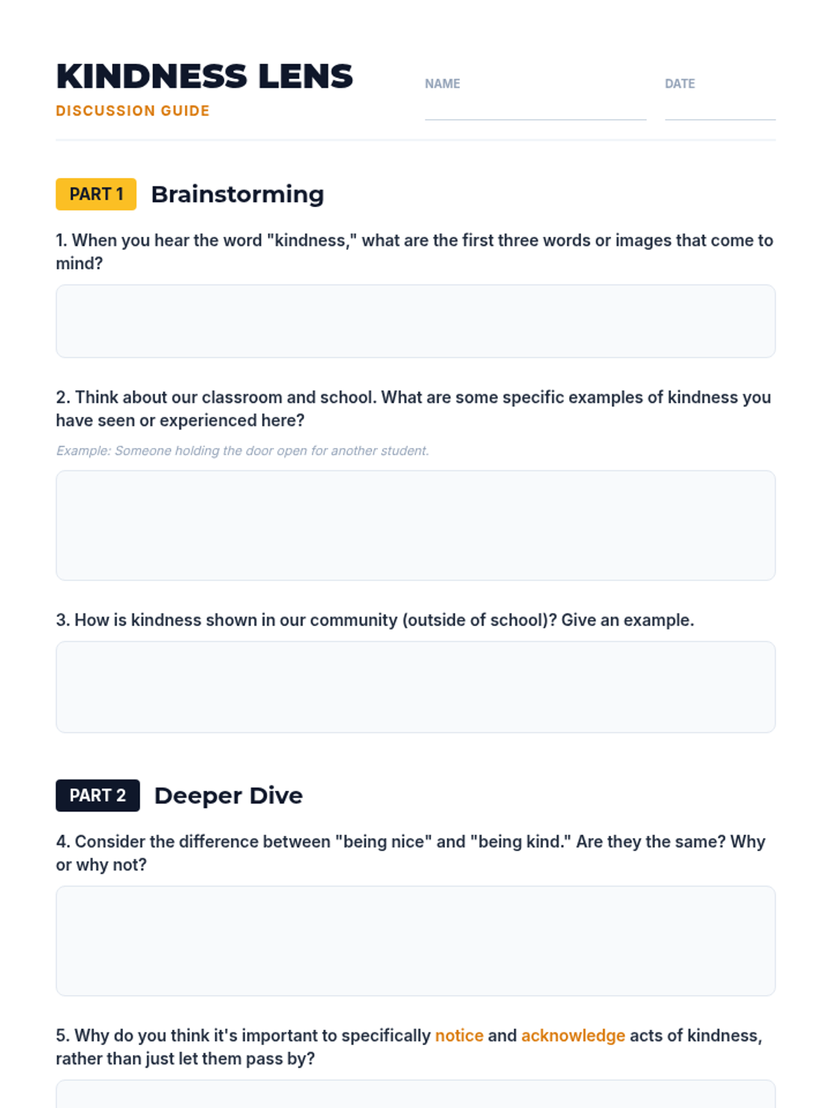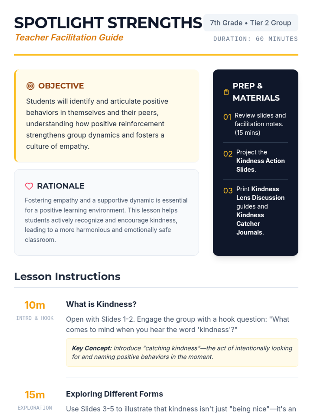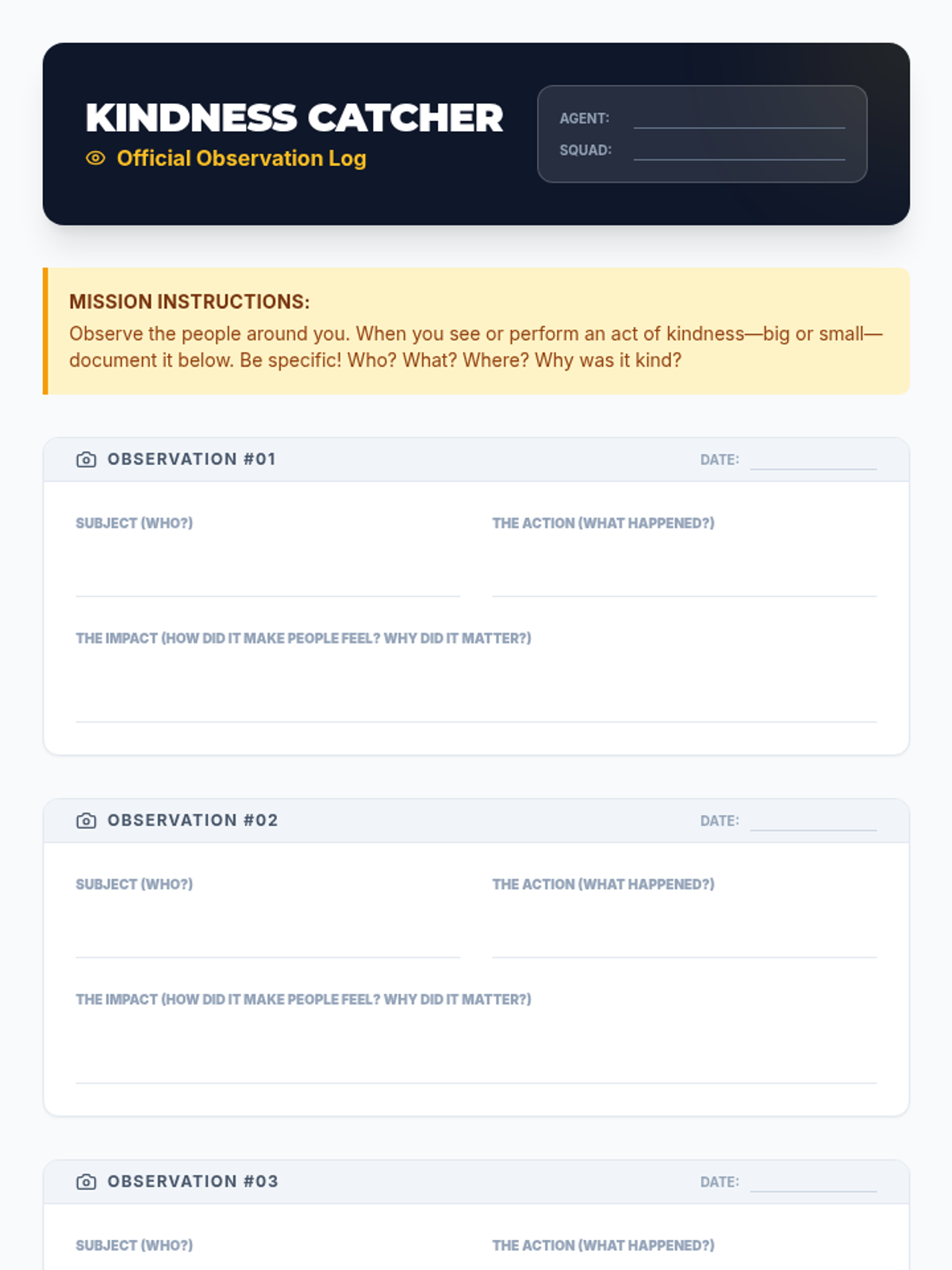 This lesson focuses on helping 7th-grade students identify and reinforce positive behaviors in themselves and their peers to foster empathy and a supportive group dynamic. Students will practice "catching kindness" through observation and reflection.