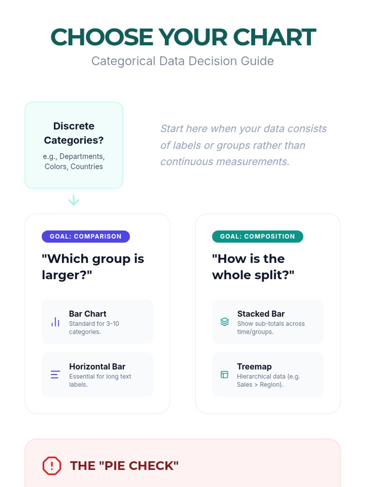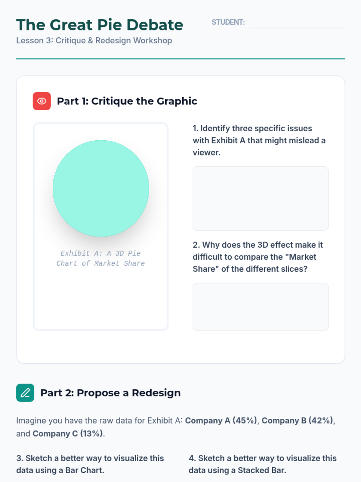 Students master the visualization of categorical data and composition. The lesson critiques common pitfalls like overused pie charts and introduces more effective alternatives like treemaps and stacked bar charts.