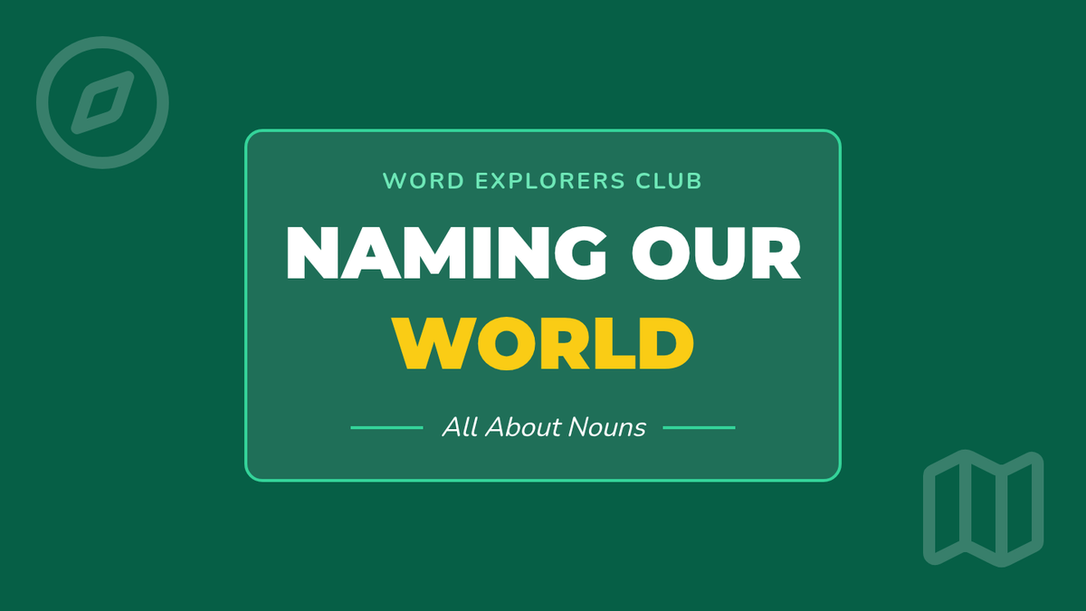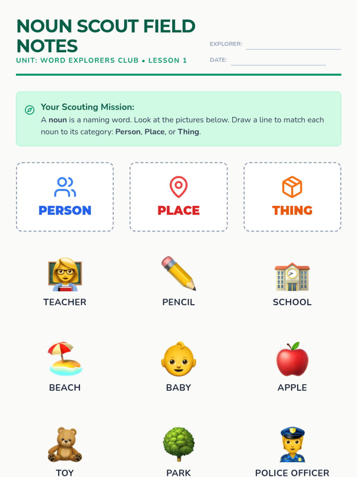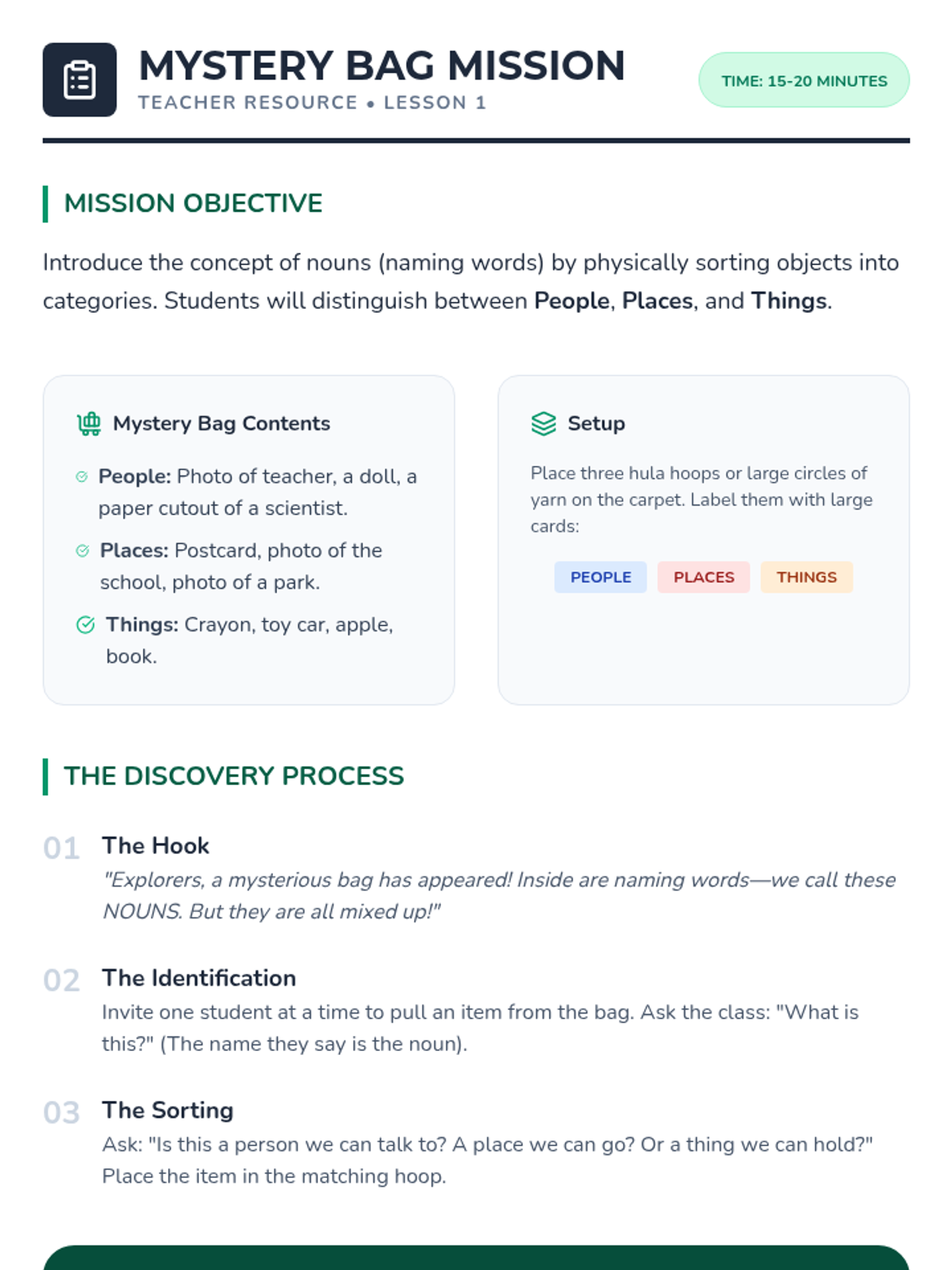 Students learn that nouns are naming words for people, places, and things through interactive sorting and a mystery bag hook.
