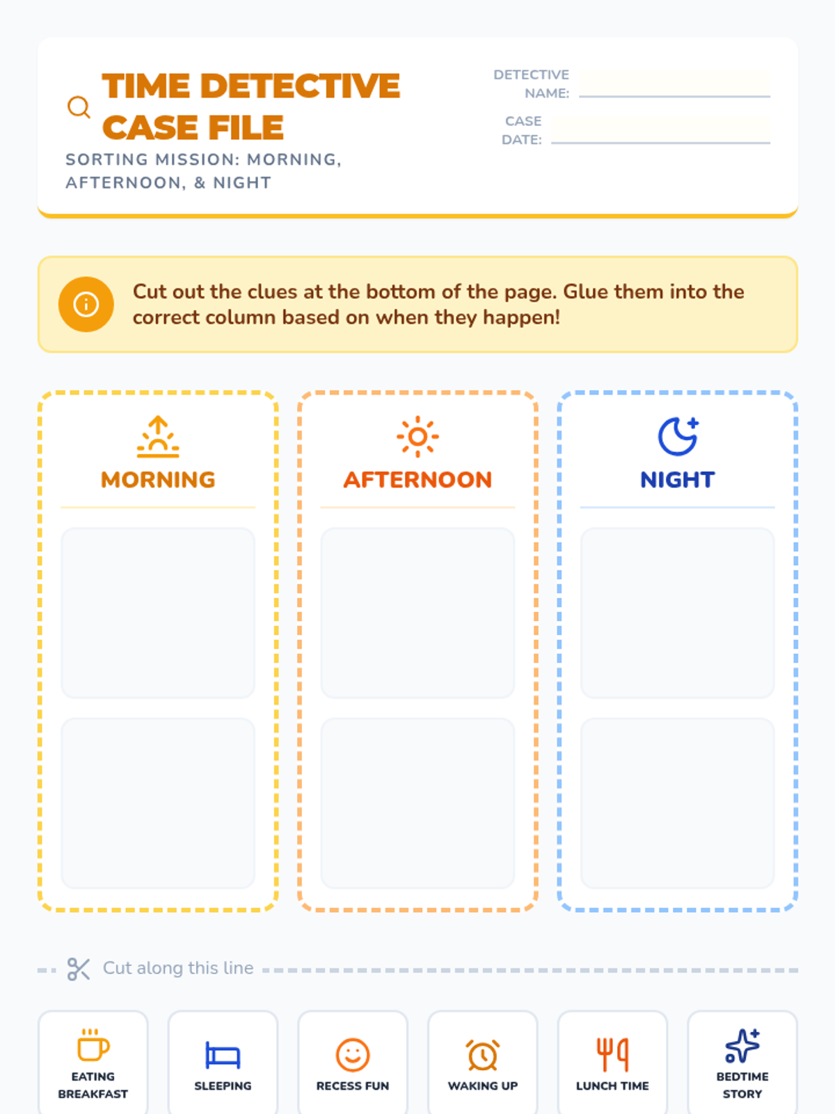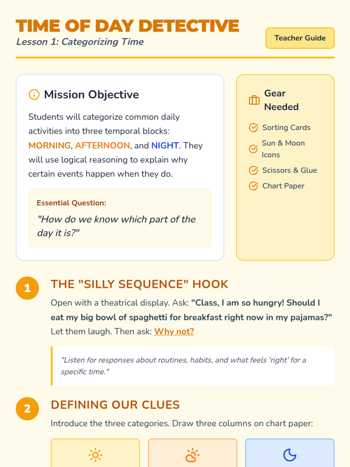 Students sort various daily activities into three categories: Morning, Afternoon, and Night. They discuss why certain events happen at specific times.