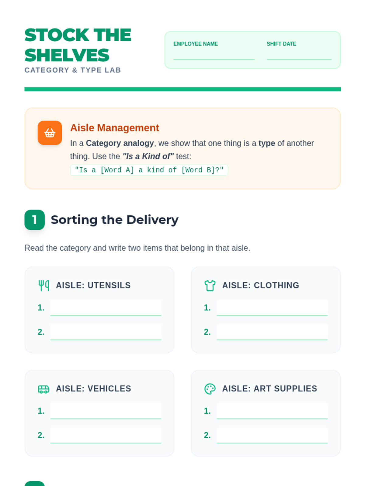The focus shifts to categorization (e.g., Apple:Fruit, Hammer:Tool). Students practice sorting words into broad categories and creating analogies based on membership.