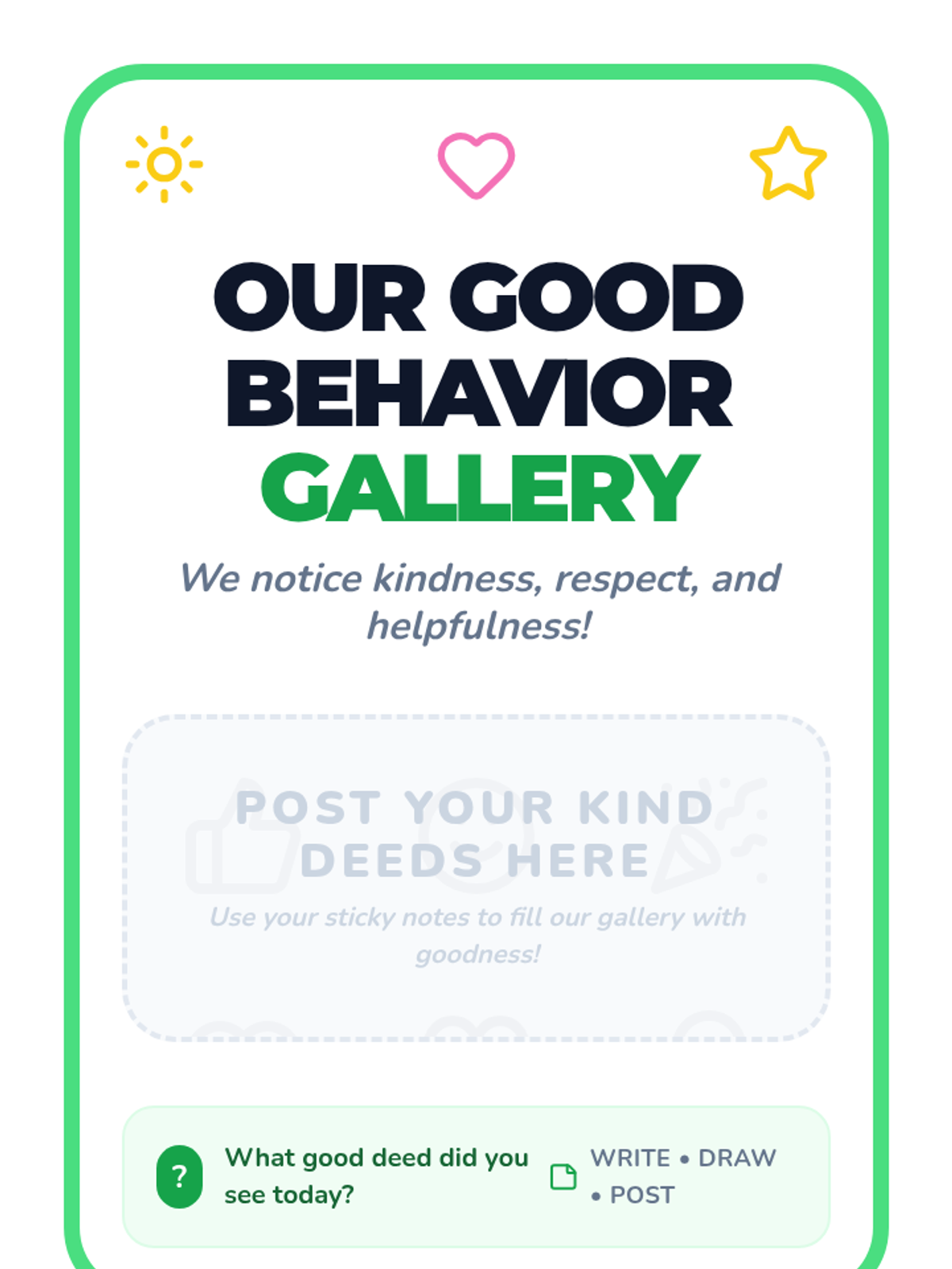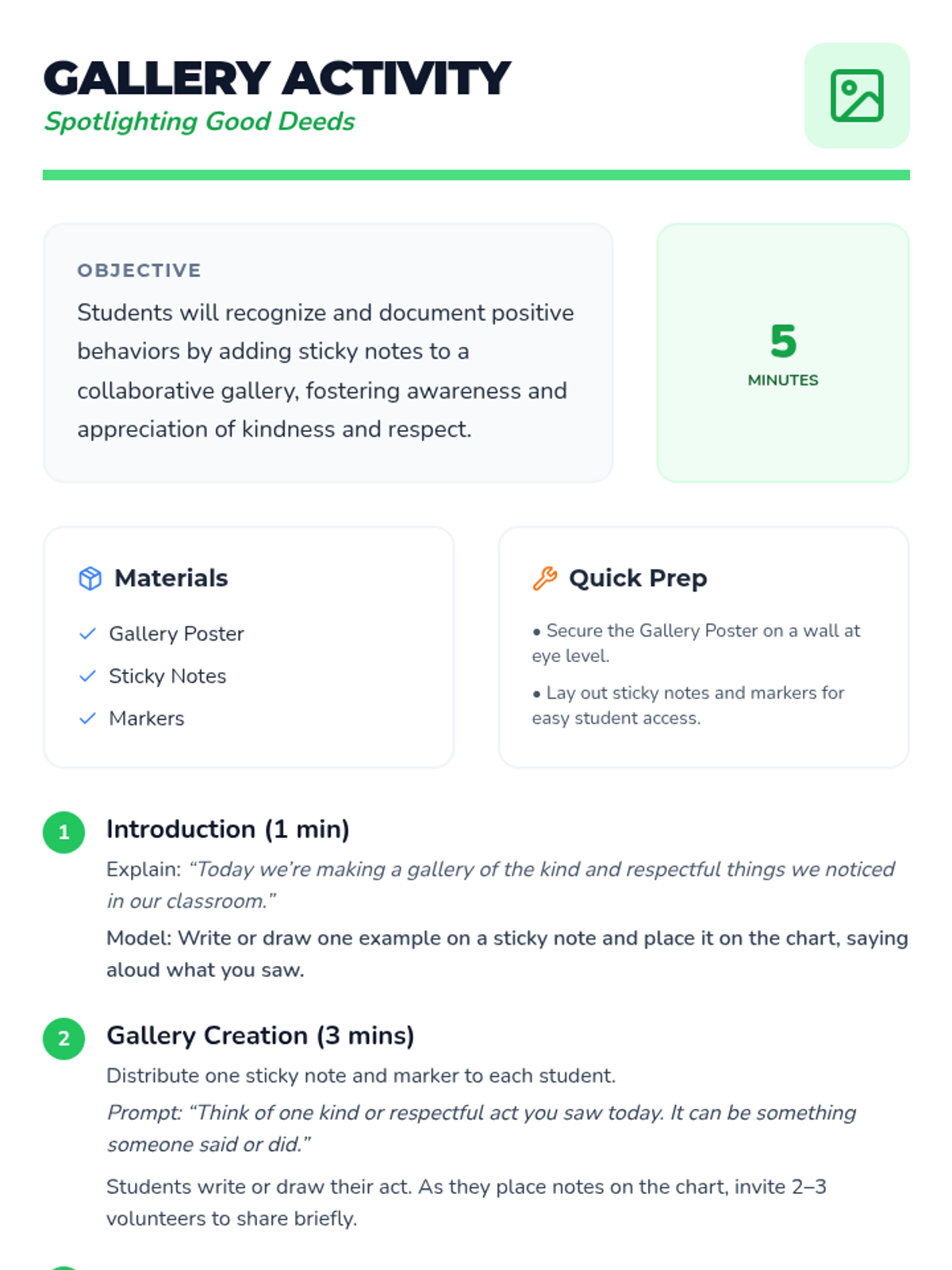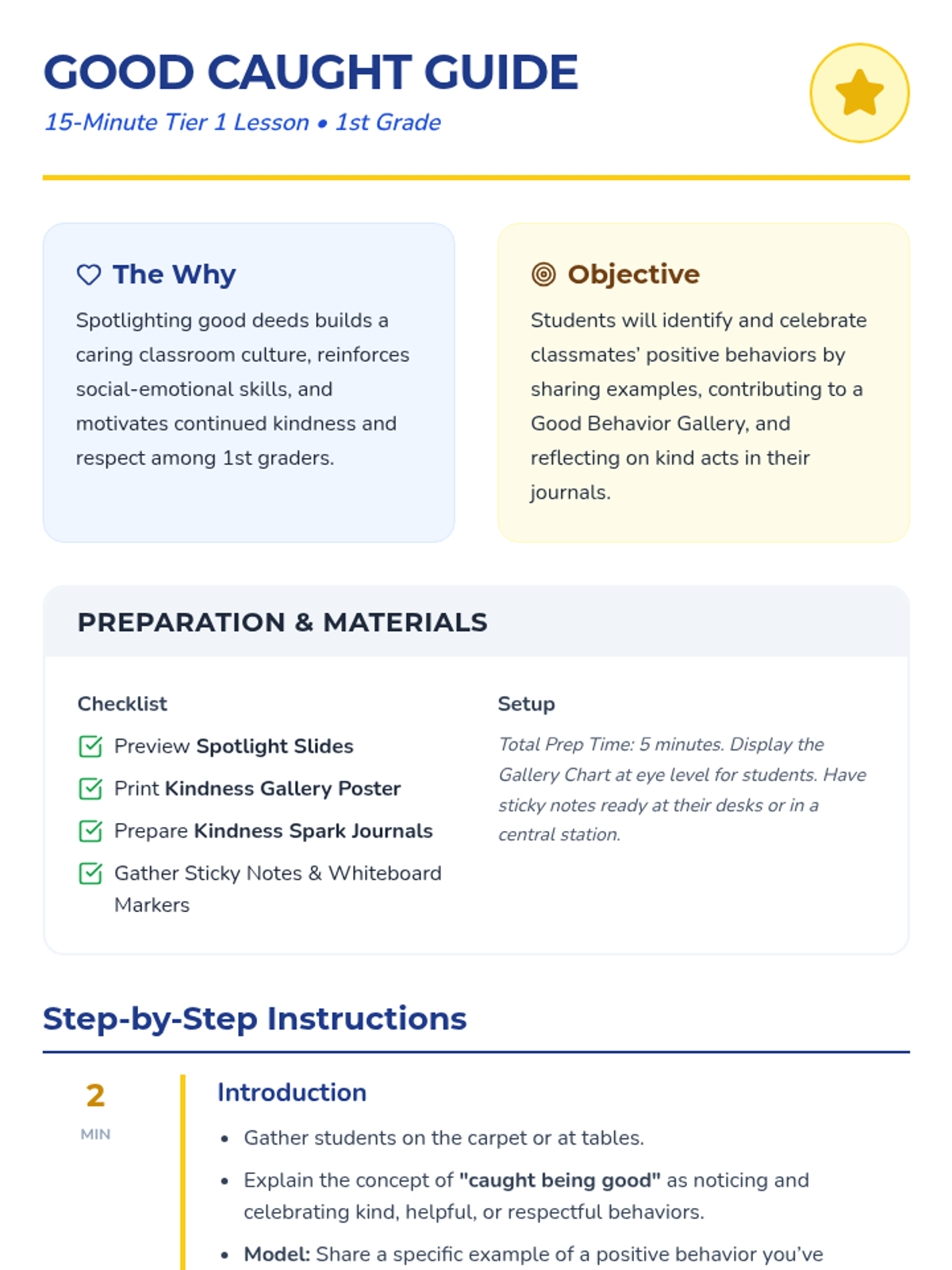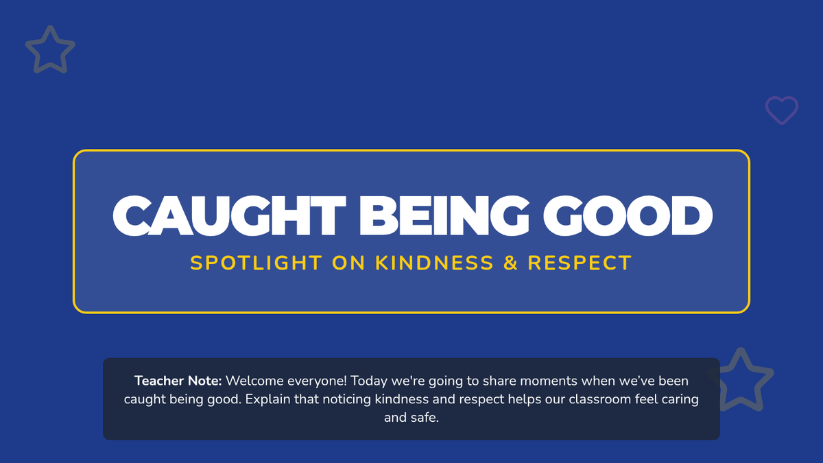 In this 15-minute Tier 1 lesson for 1st Grade, students learn to notice, celebrate, and reflect on positive behaviors in their classroom through sharing, charting, and journaling.