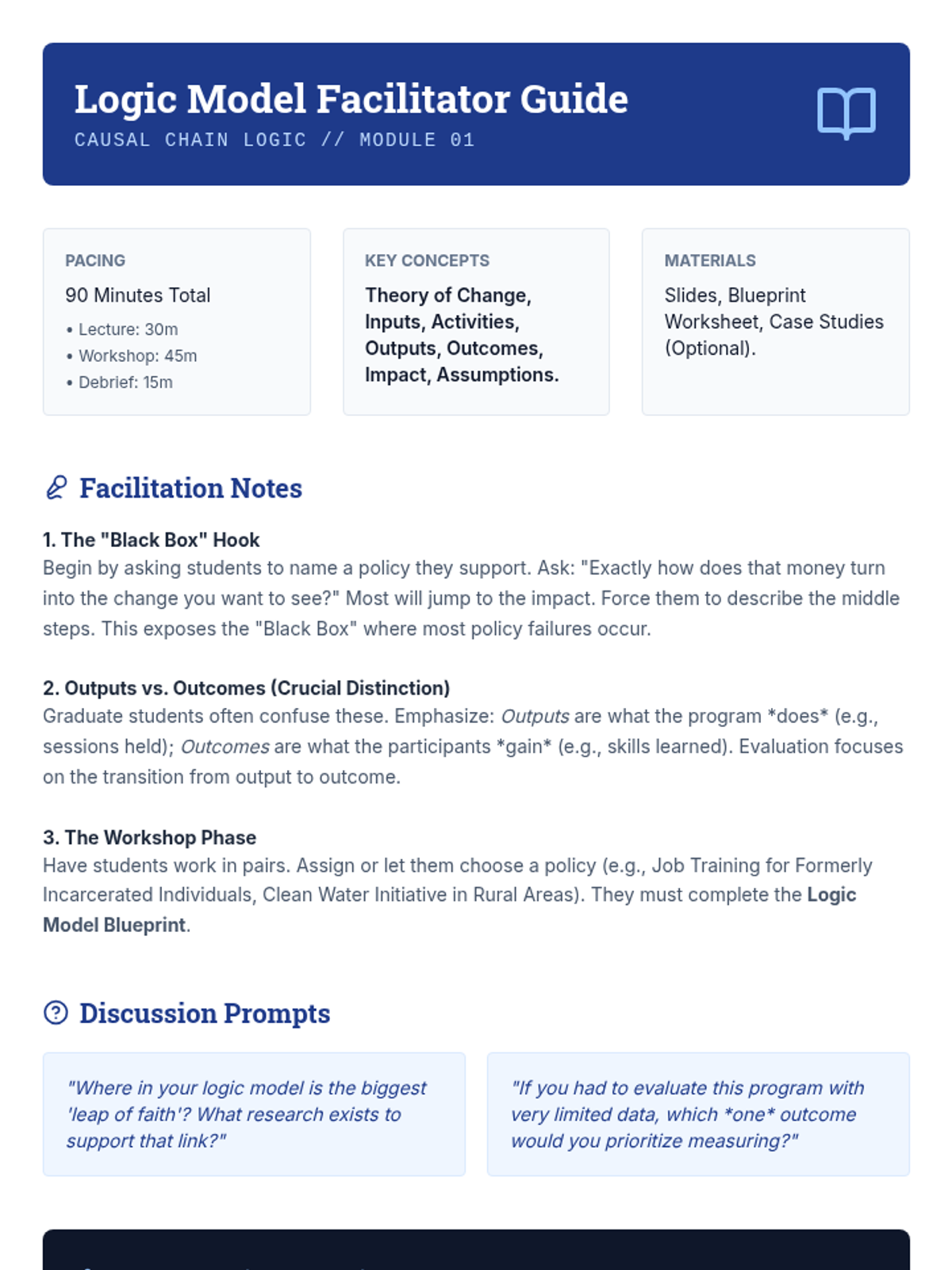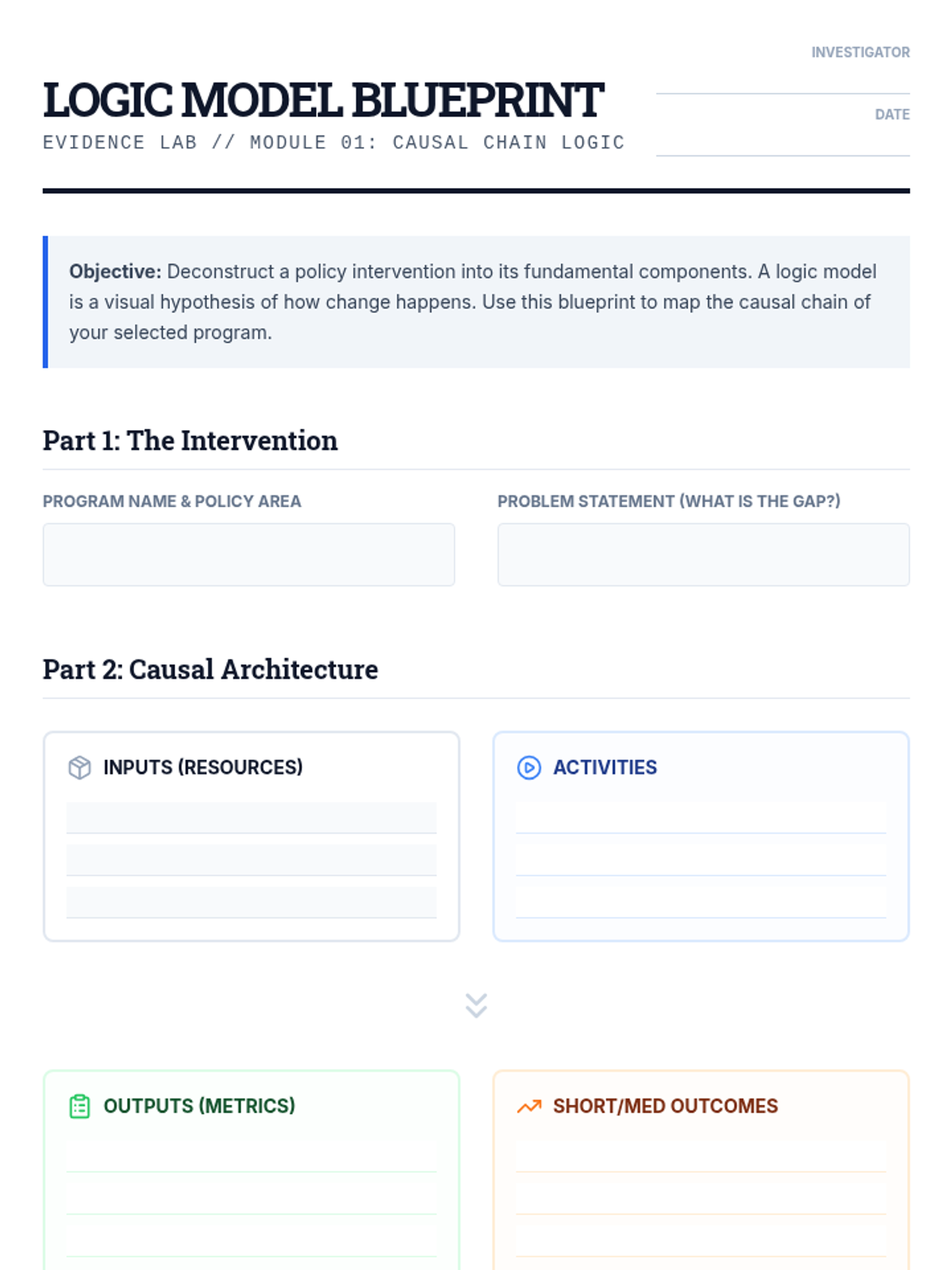Students learn to map the causal chain of a program: inputs, activities, outputs, outcomes, and impacts. They create visual logic models to clarify the assumptions underlying a policy intervention.