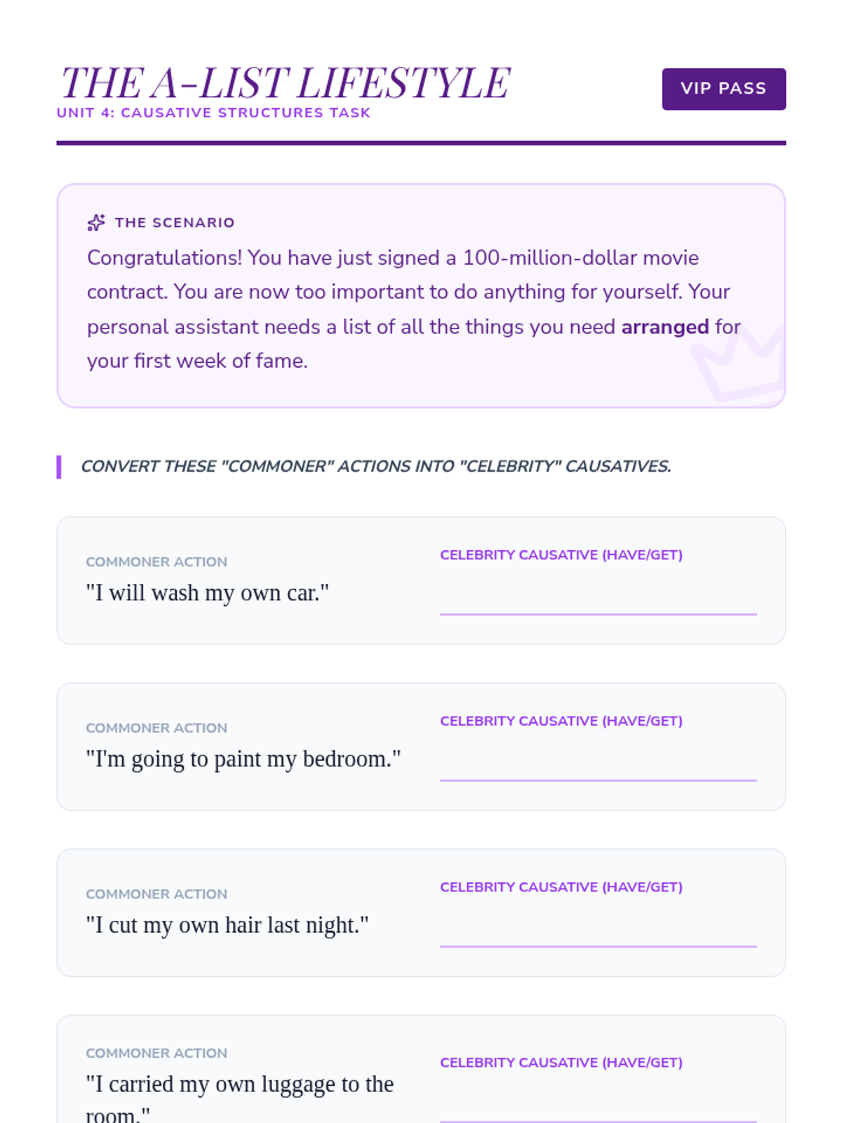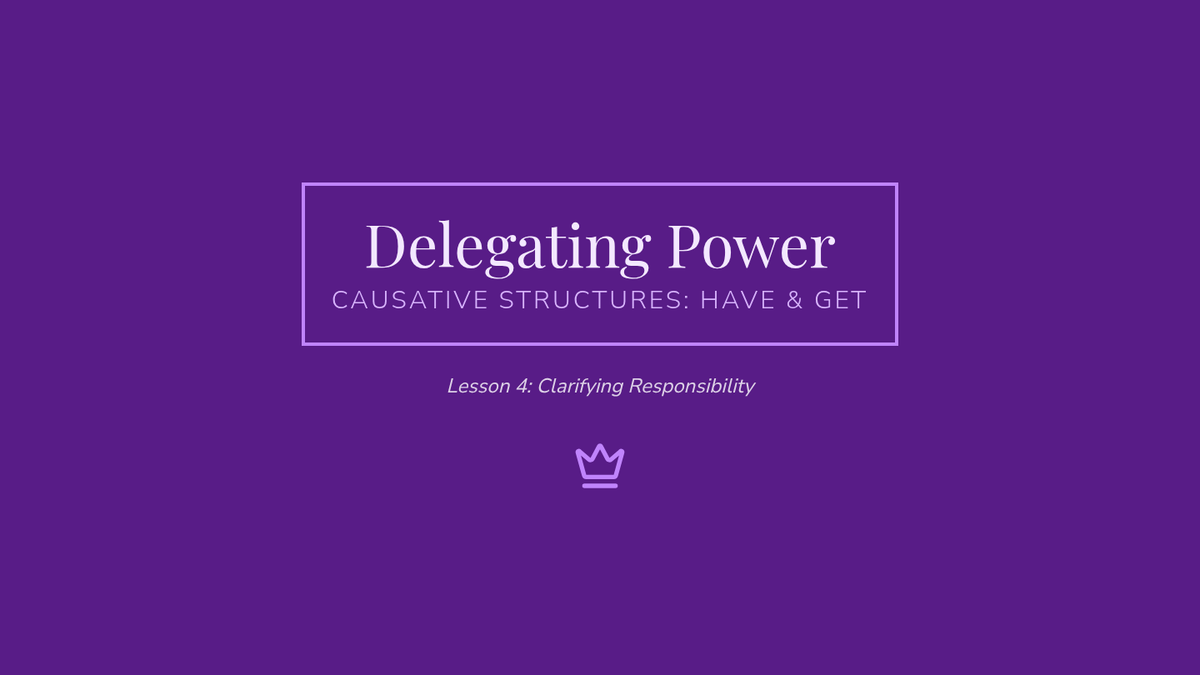 Students learn 'have/get something done' structures to describe arranged services. They compare these to active structures to clarify responsibility and agency.