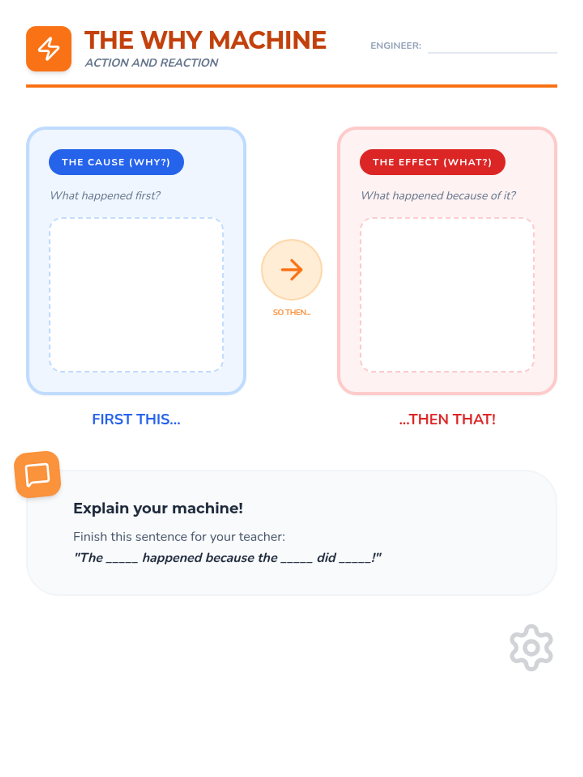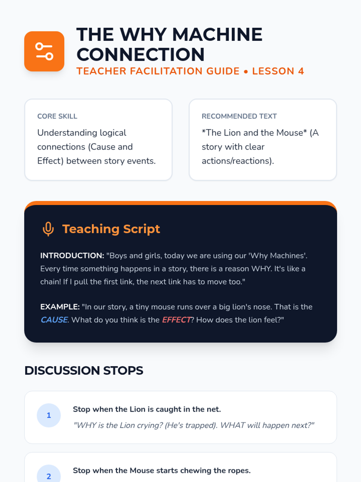 Focuses on logical connections between events. Students explore 'why' things happen and predict 'what' comes next in a narrative sequence.