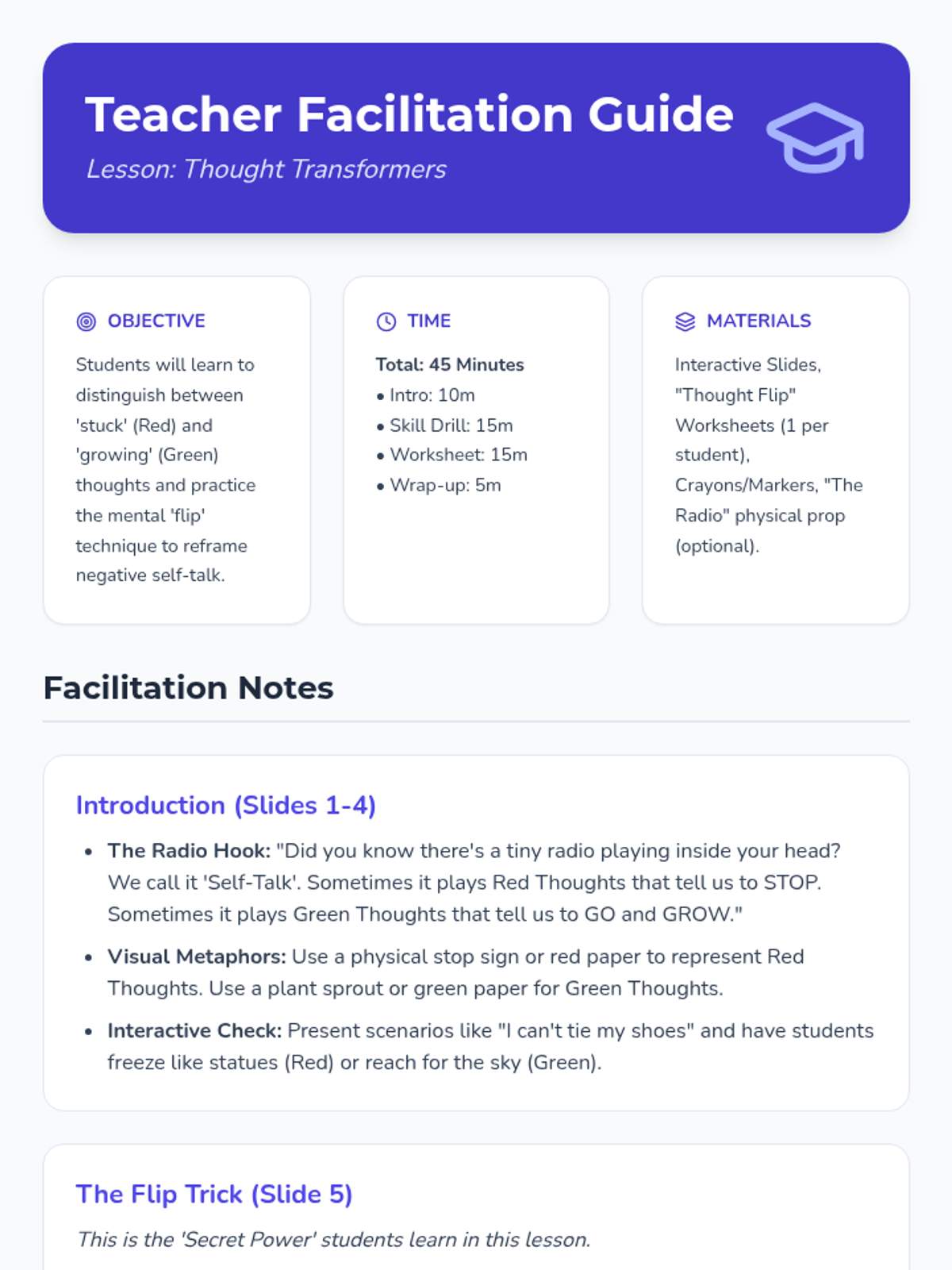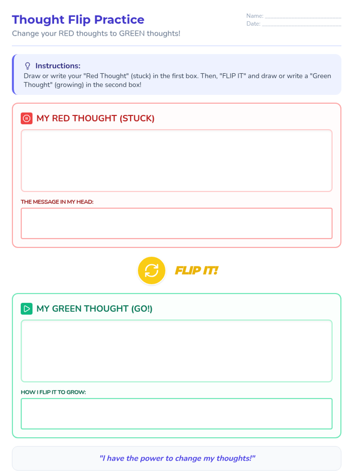 A social-emotional learning lesson focused on identifying negative 'Red' thoughts and reframing them into positive 'Green' thoughts using scenarios and visual self-talk strategies.